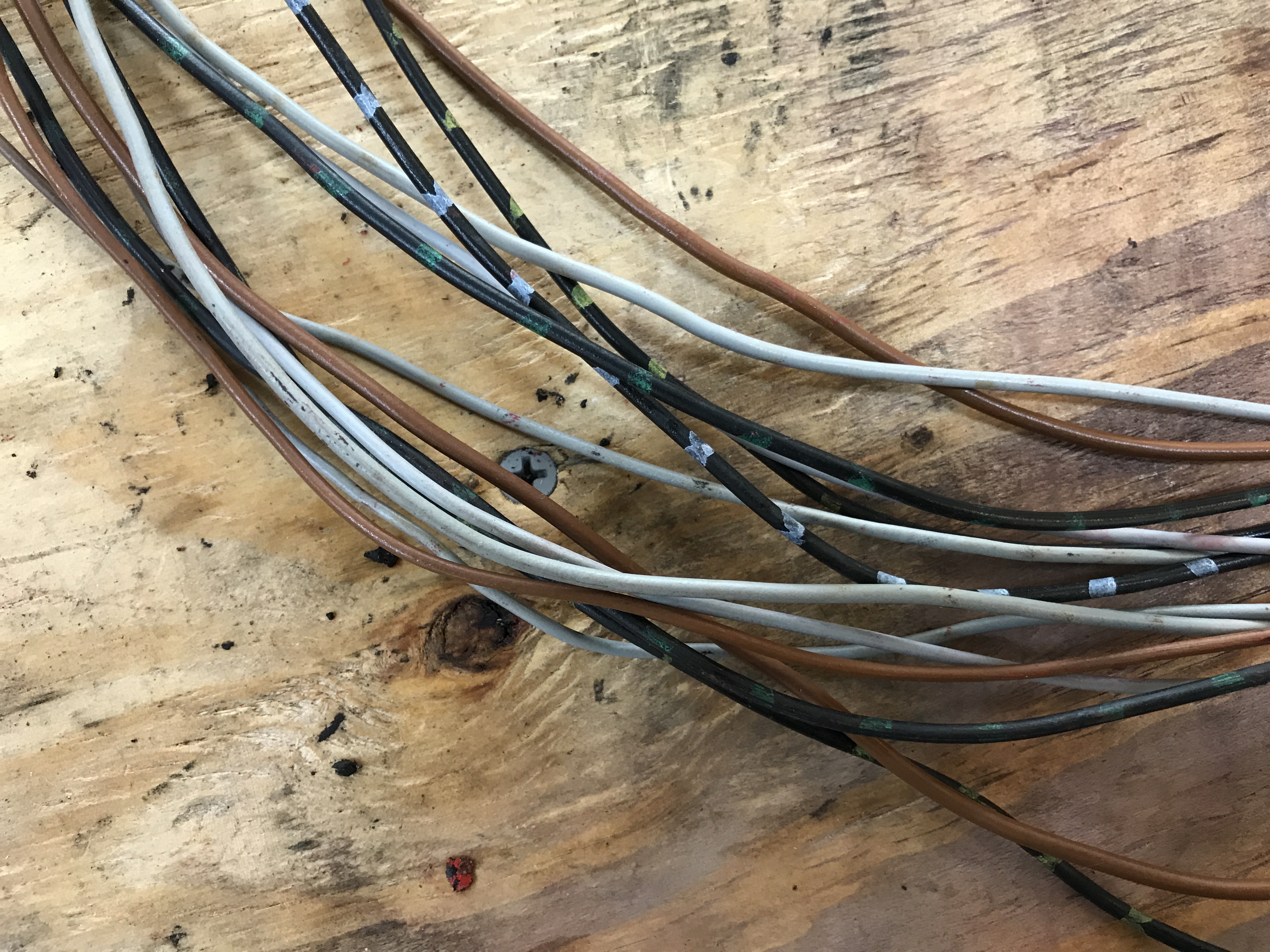 Cleaning wires is getting tedious. I spent about 2 house today, and got done with one long lead and two short ones. Here is a shot showing the before (left) and after (right). The red spots are where the PO paint, from spraying the inside of the trunk, got between the original spiral tape wrapping of the wire bundle.