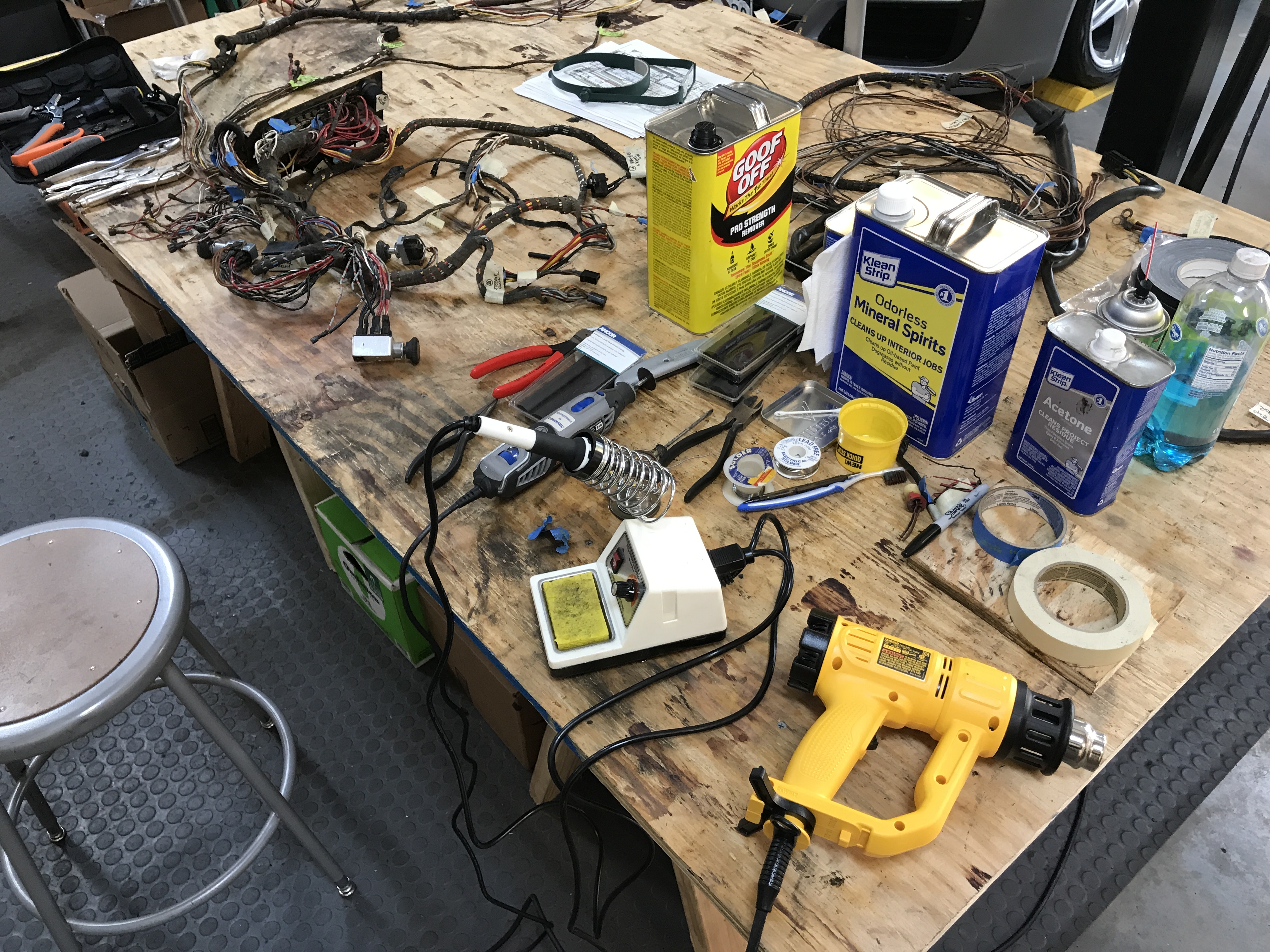 I got into wire repair mode today. Here is the setup, with soldering iron, heat gun, and other stuff.