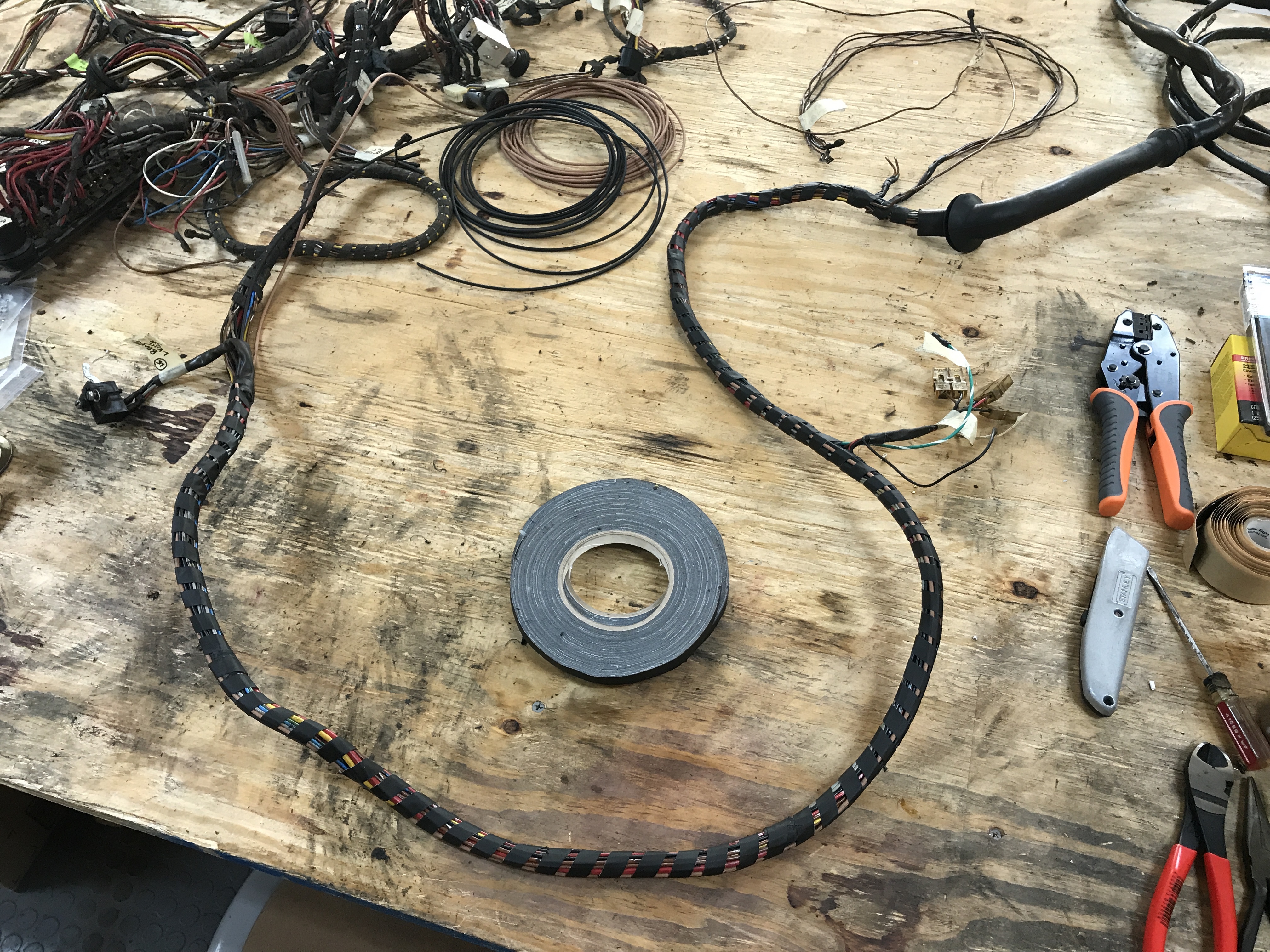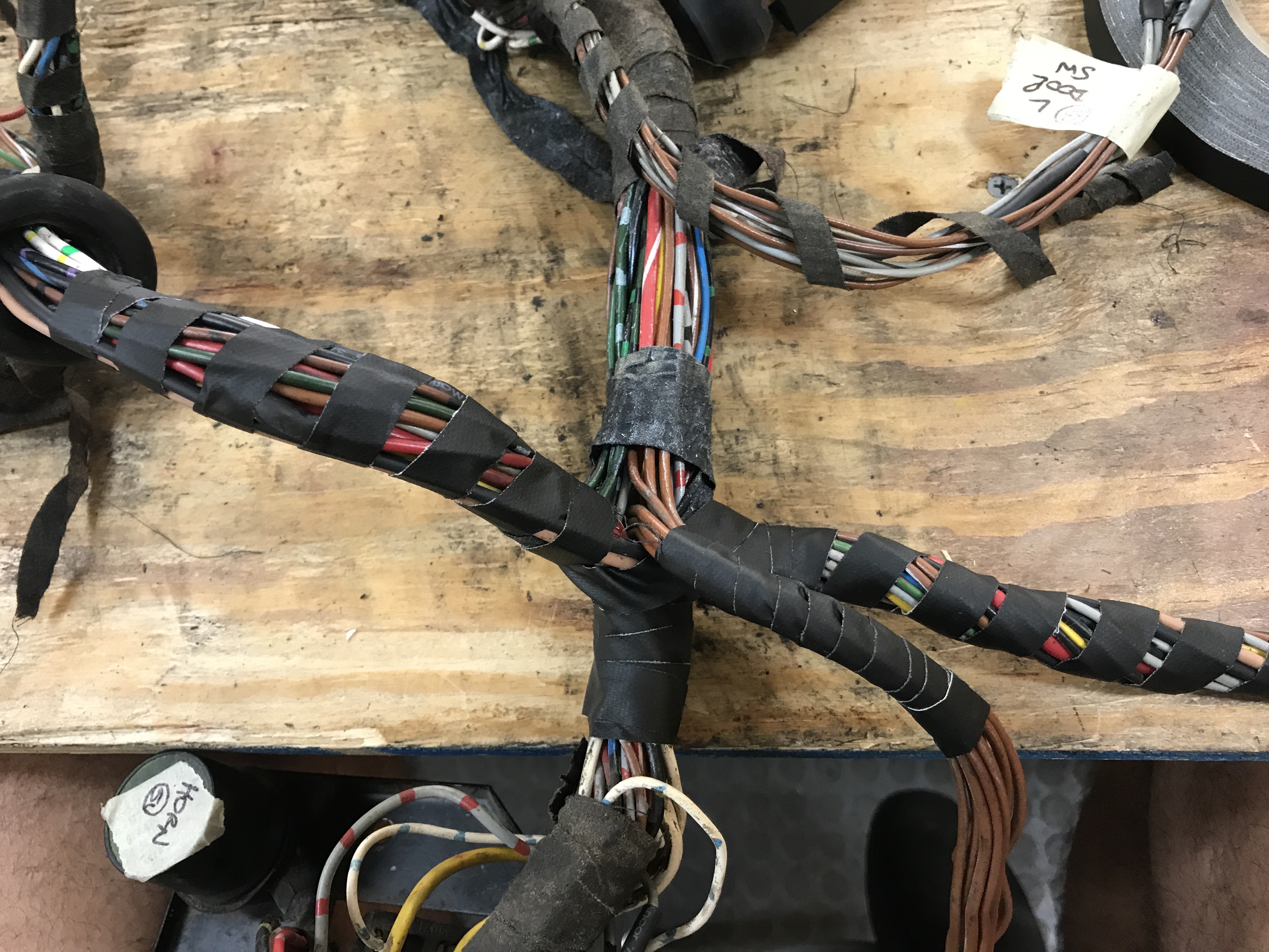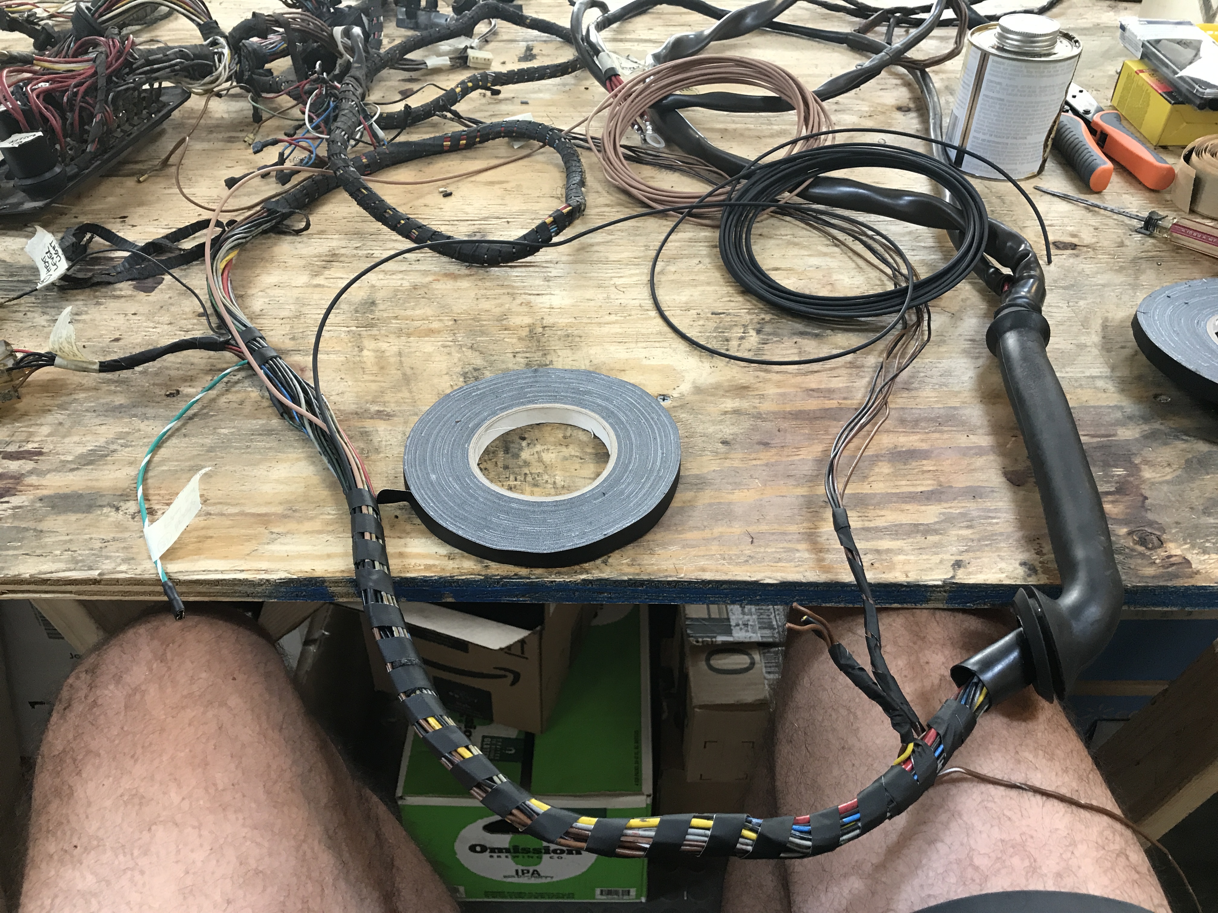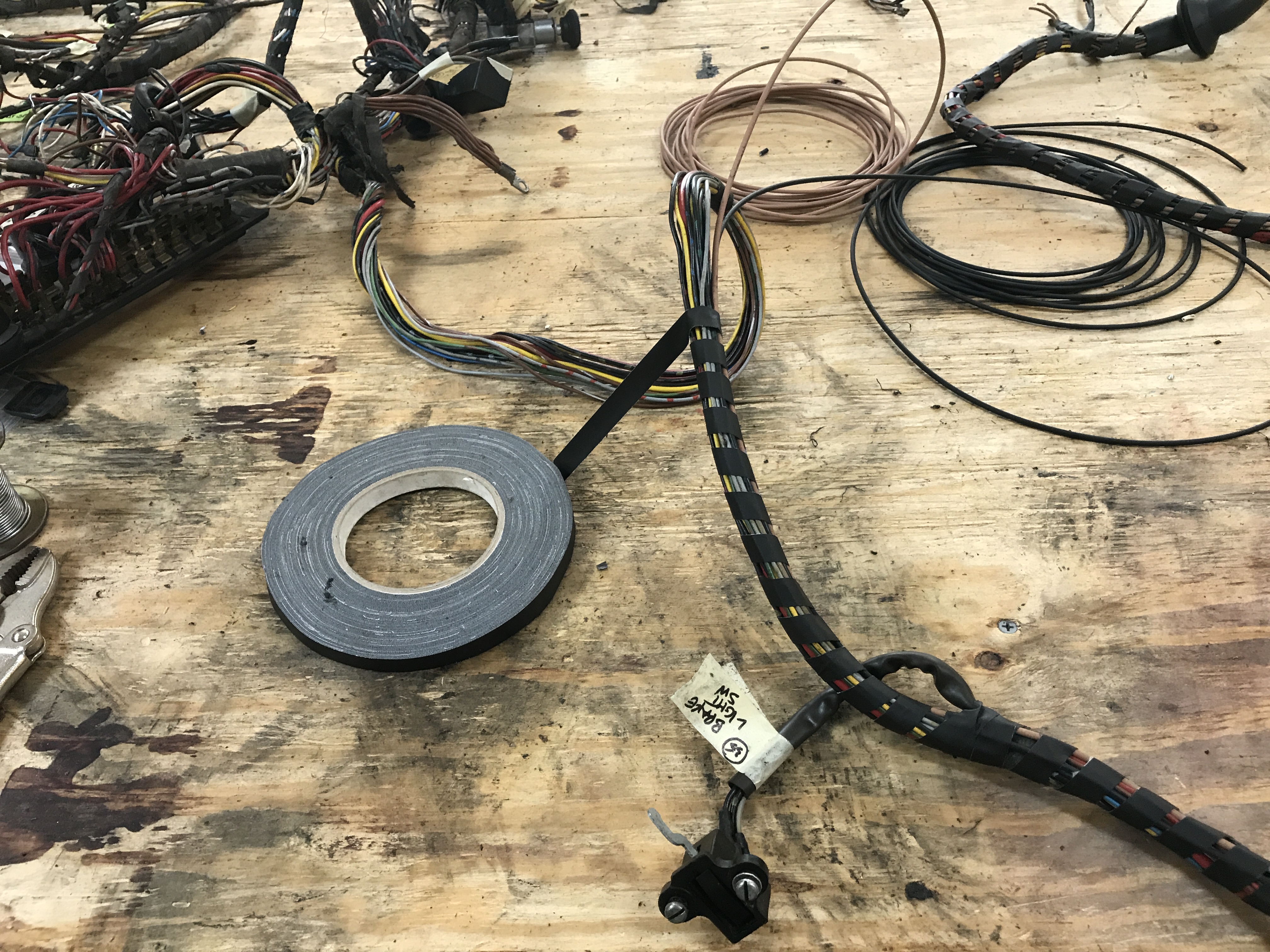 Back to wire work today. I started wrapping the harness with new tape, working forward from the rear firewall.