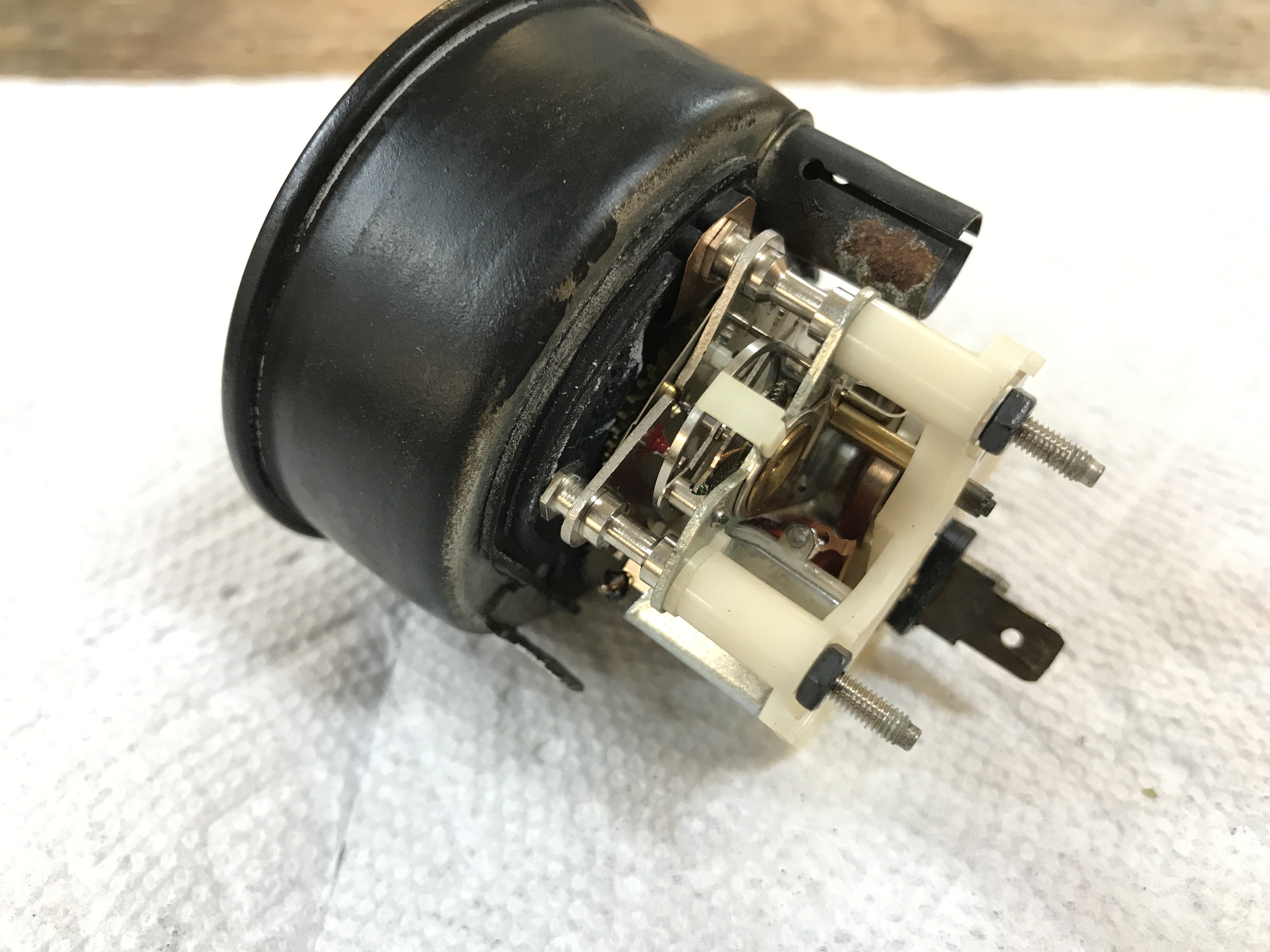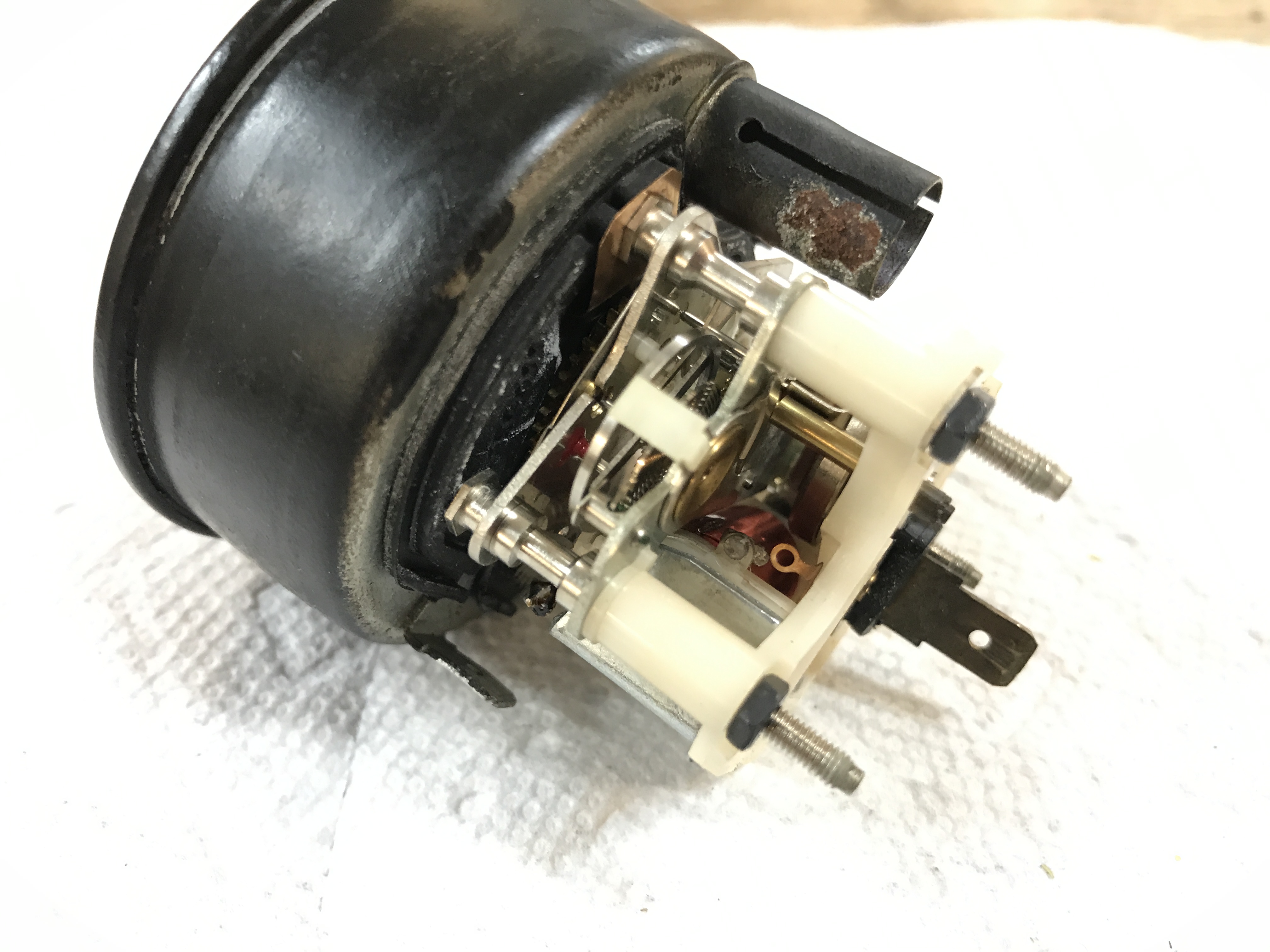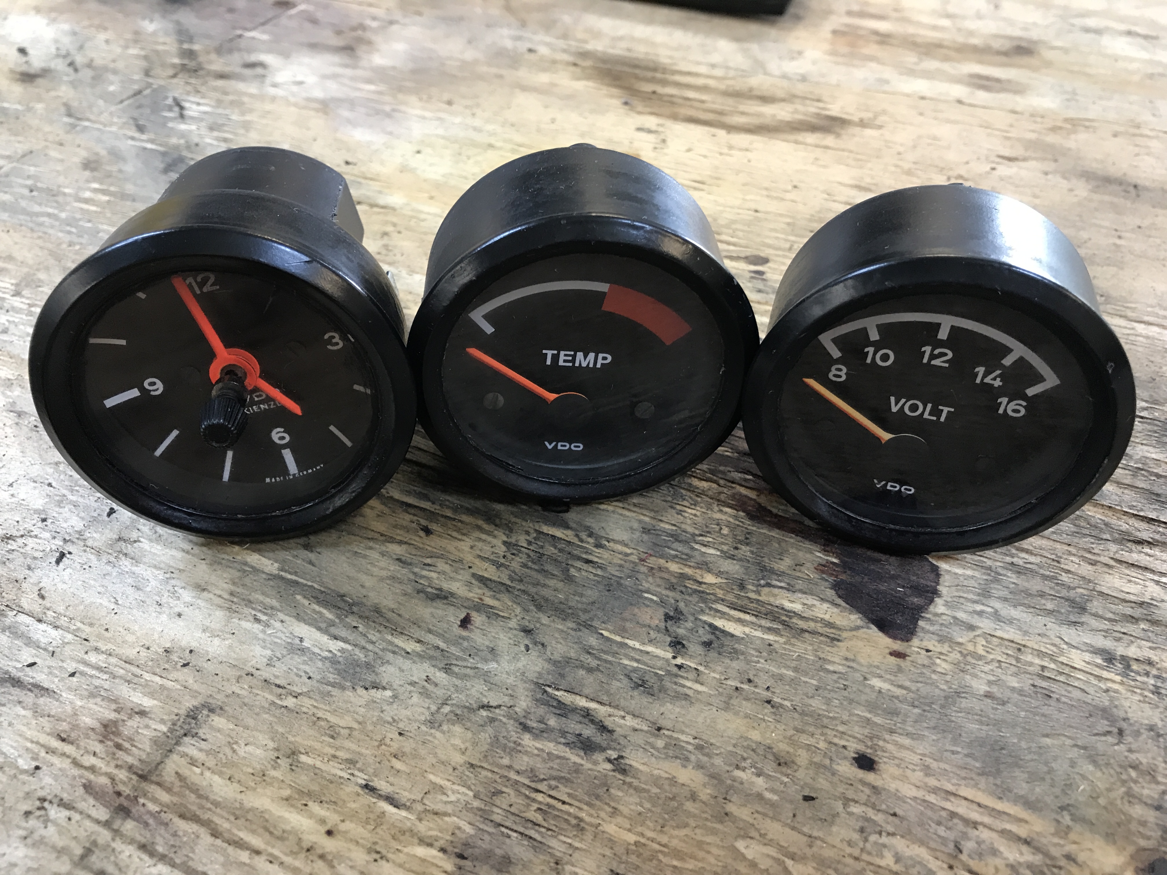 The gauges look OK from the outside, and the bezel rings have never been opened. But the temp gauge has something loose inside rattling around. Oops.