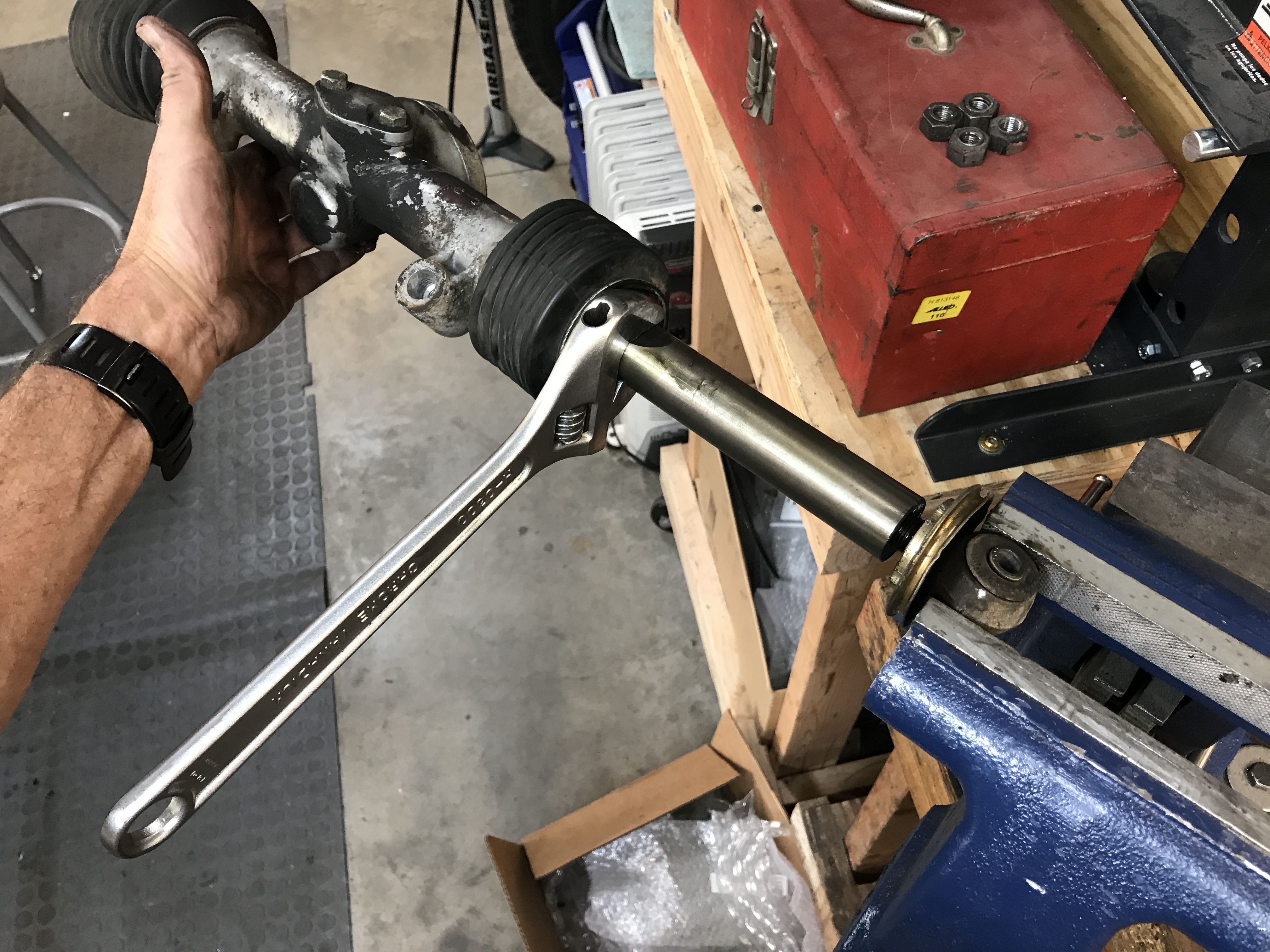 I was able to loosen the lock rings/bellow supports, but one eye-bolt did not want to budge. It took quite a bit of leverage, with a wrench on the flats of the rack and the eye-bolt in the vise.