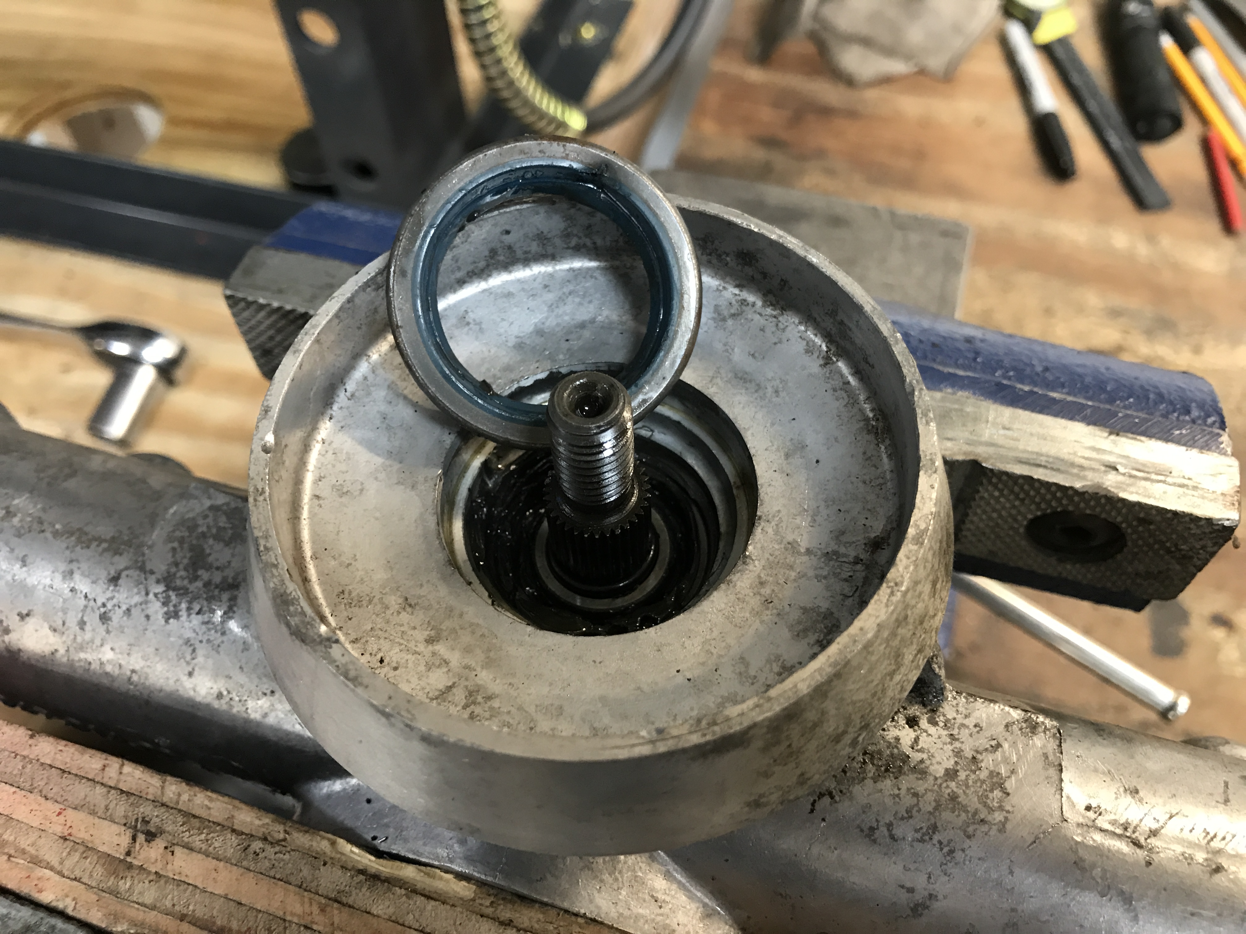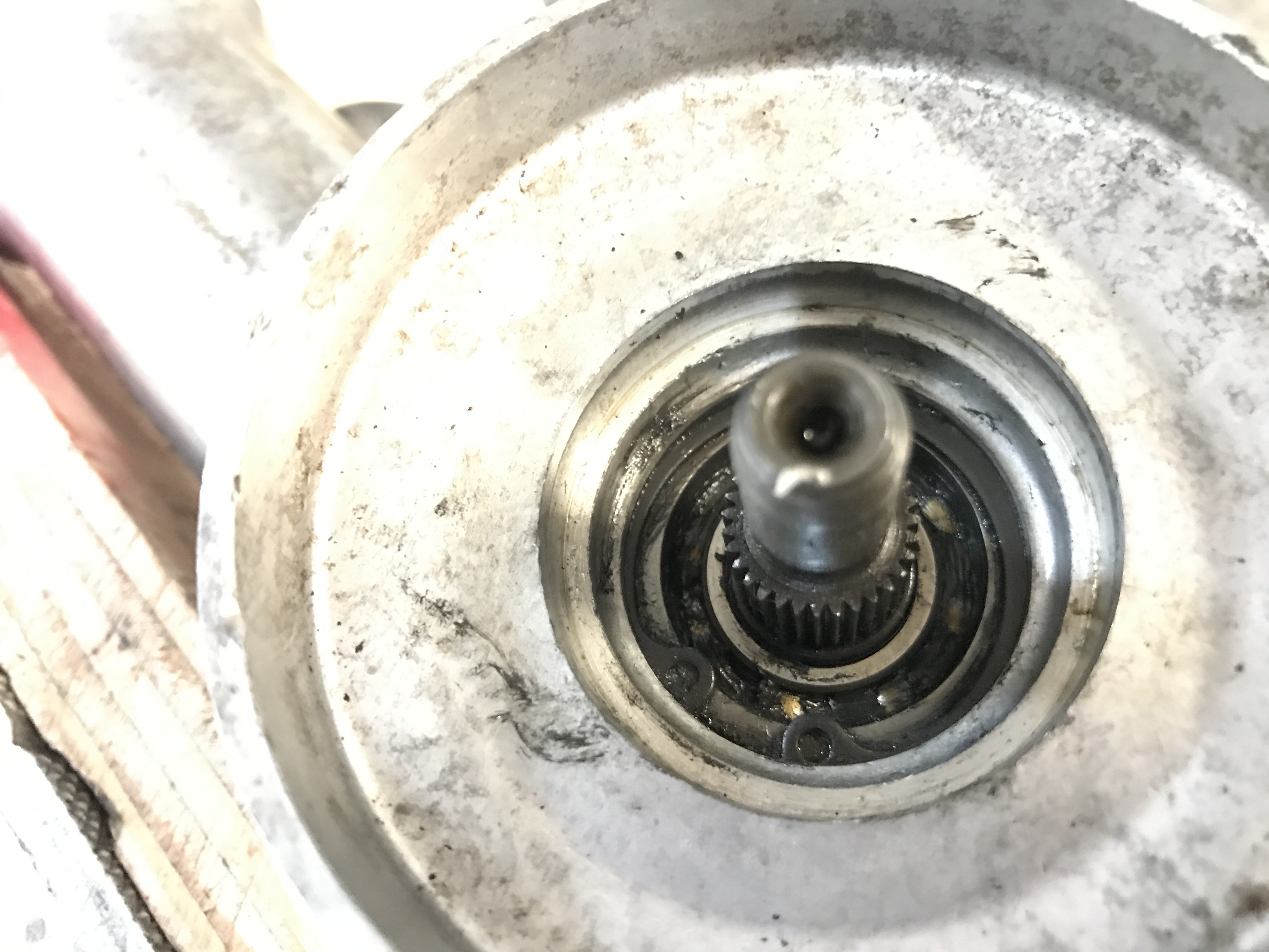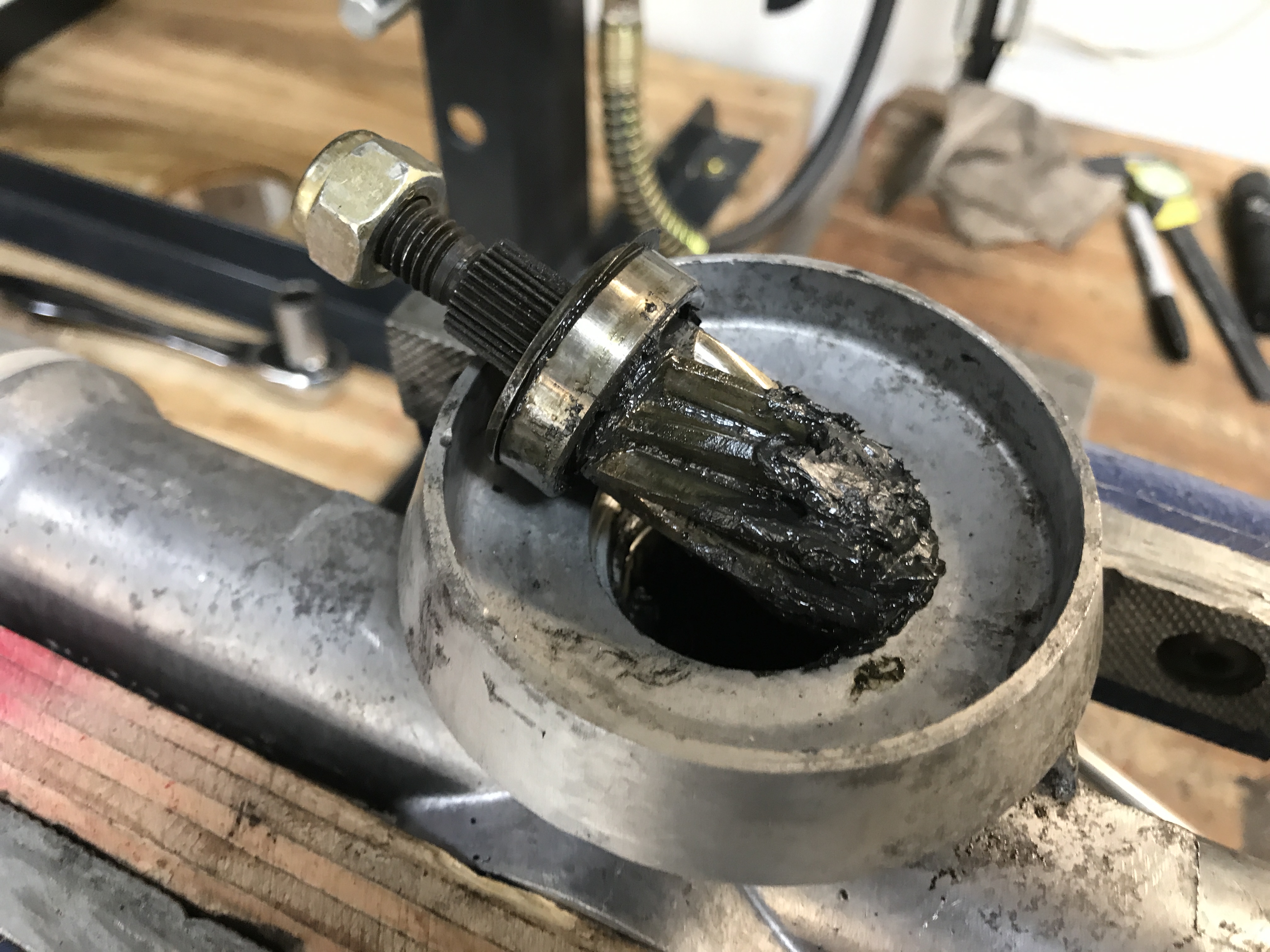 The pinion shaft came out with good news: still lots of viscous grease, and no sign of contamination or drying out.