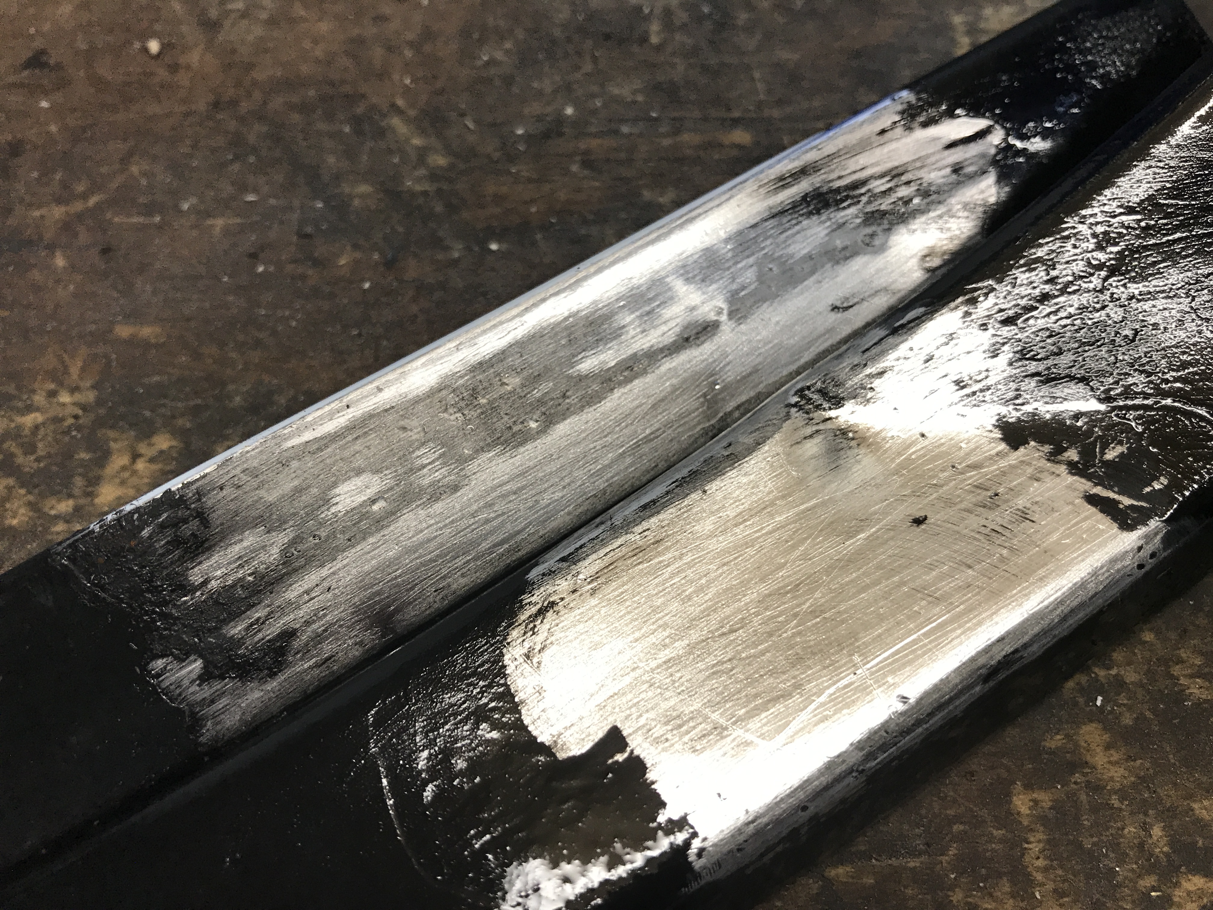 The stripper works well enough, but reveals that like on the chrome bumpers, some PO sanded the polished surfaces before painting.