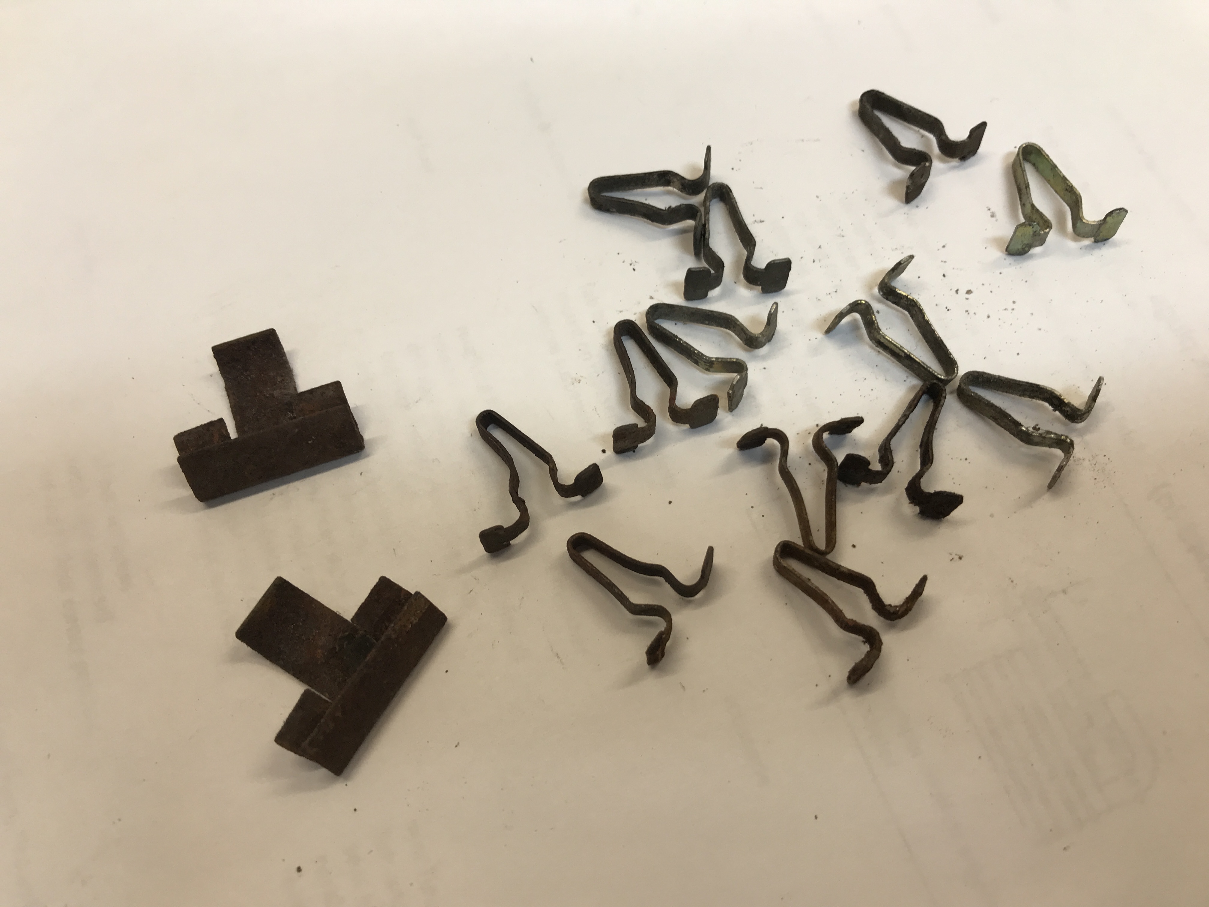 Finally, I gather some miscellaneous small parts with variable amounts or rust, like the retaining clips for the targa hoop trim.