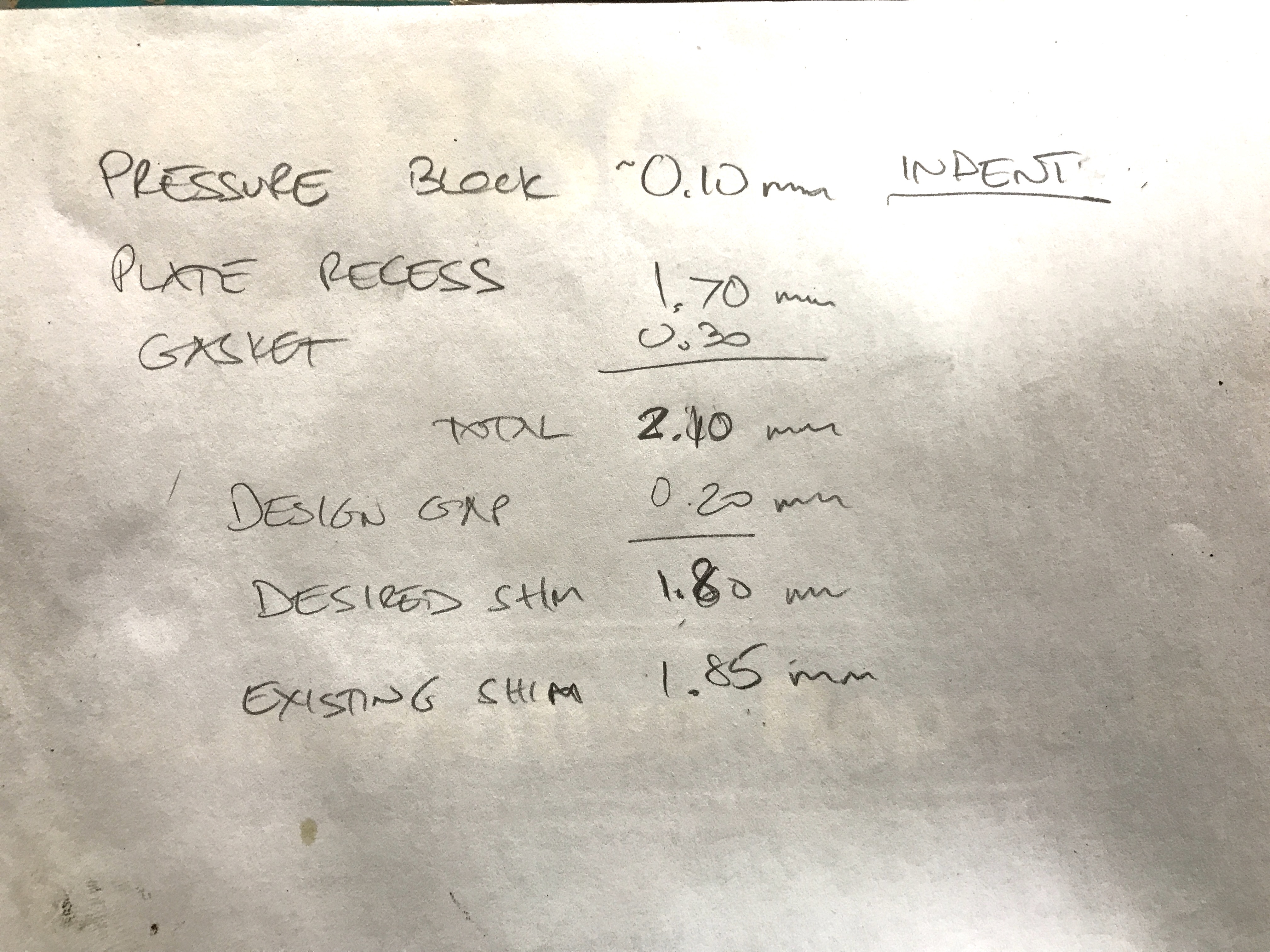 Here's the math. The total gap, including the gasket, is 2.1 mm. The designed gap is 0.2 mm. Can you spot my math error? The desired shim should be 1.9 mm! But the original shim is 1.85 mm, so all is well.