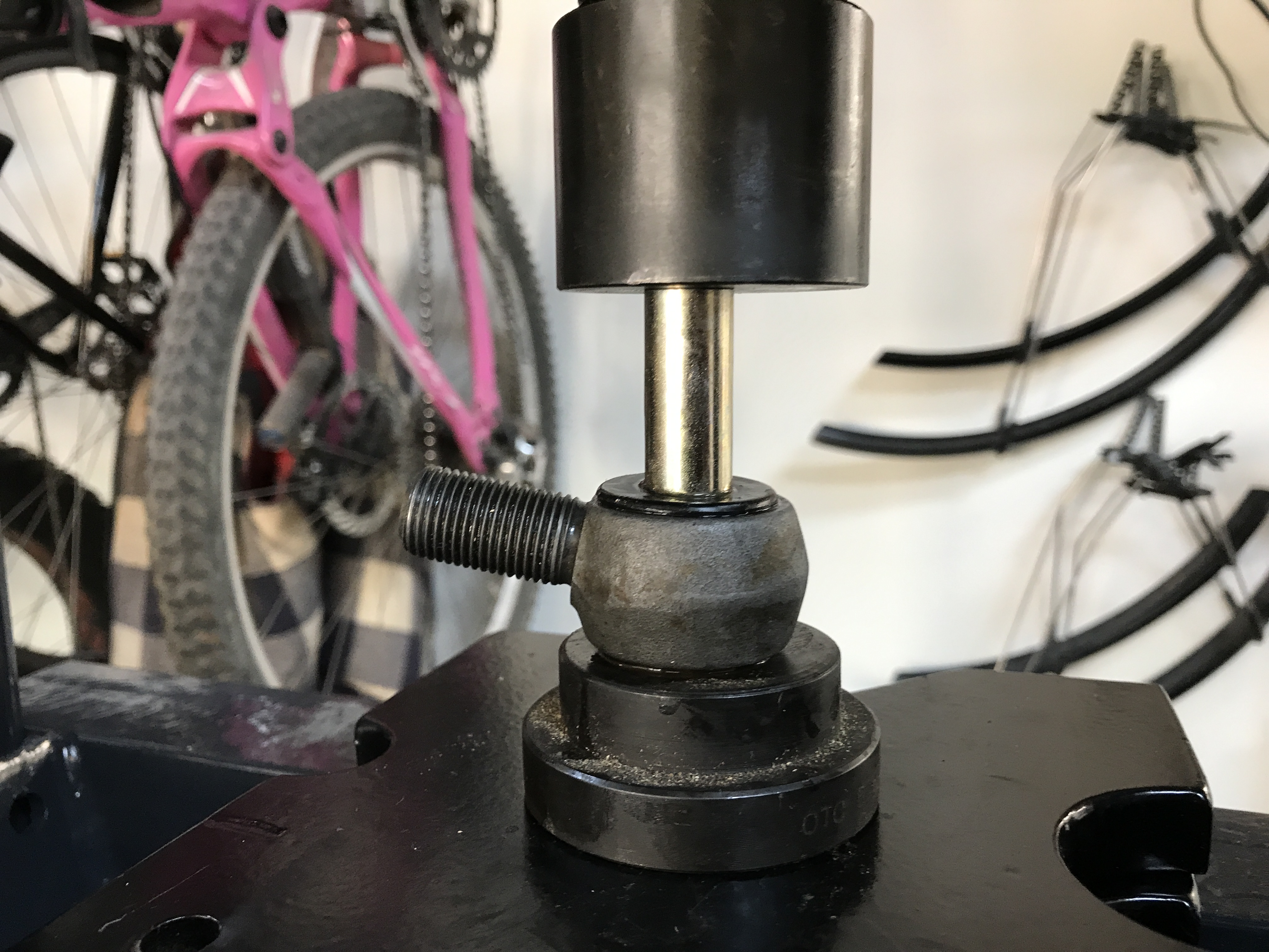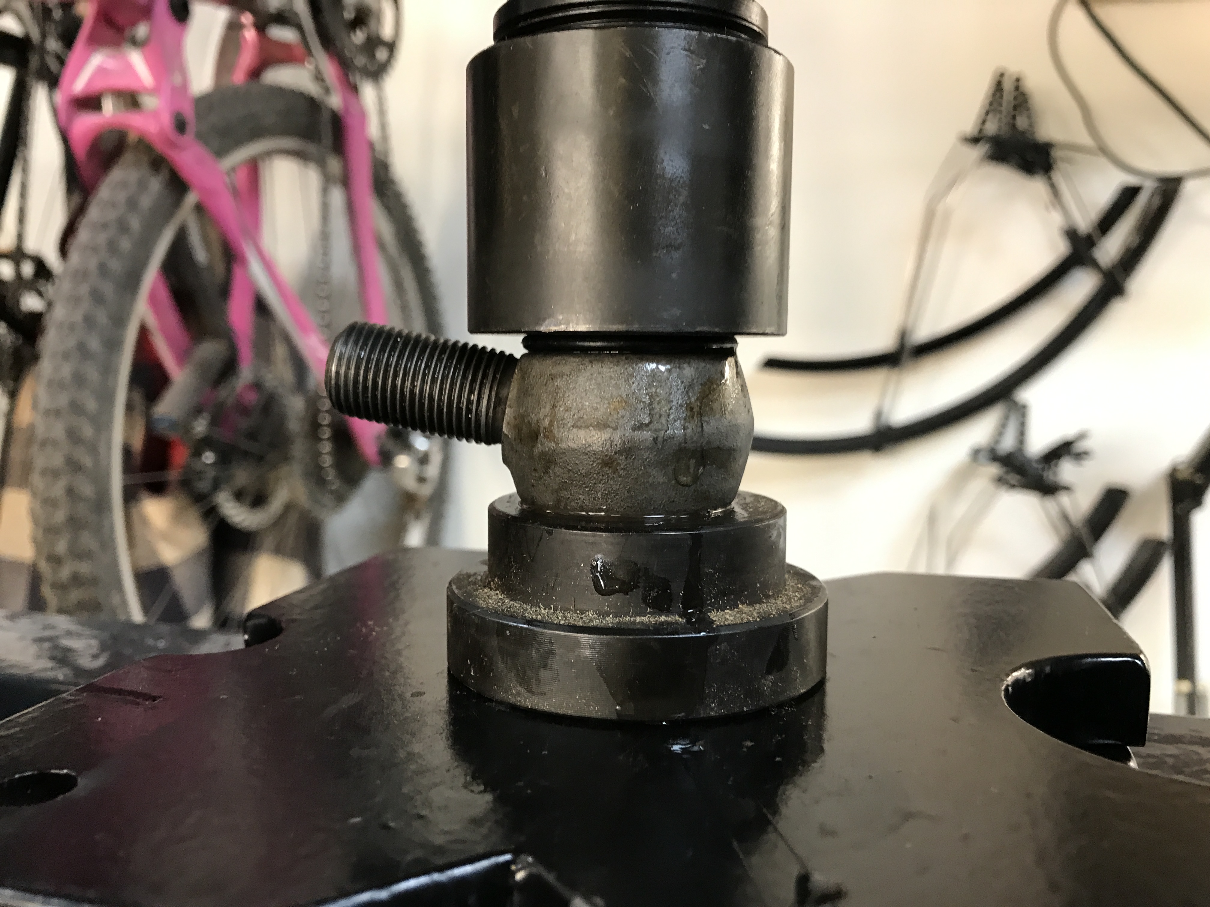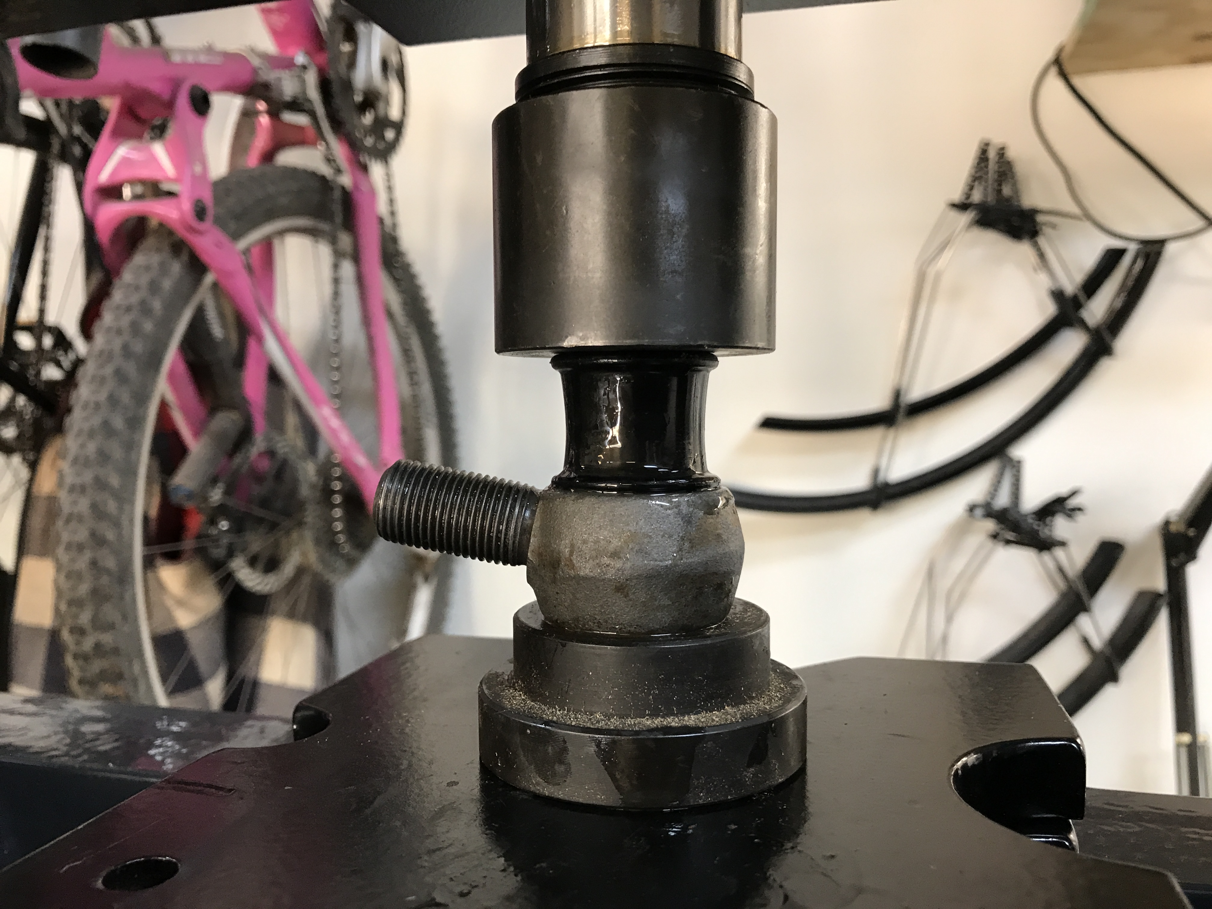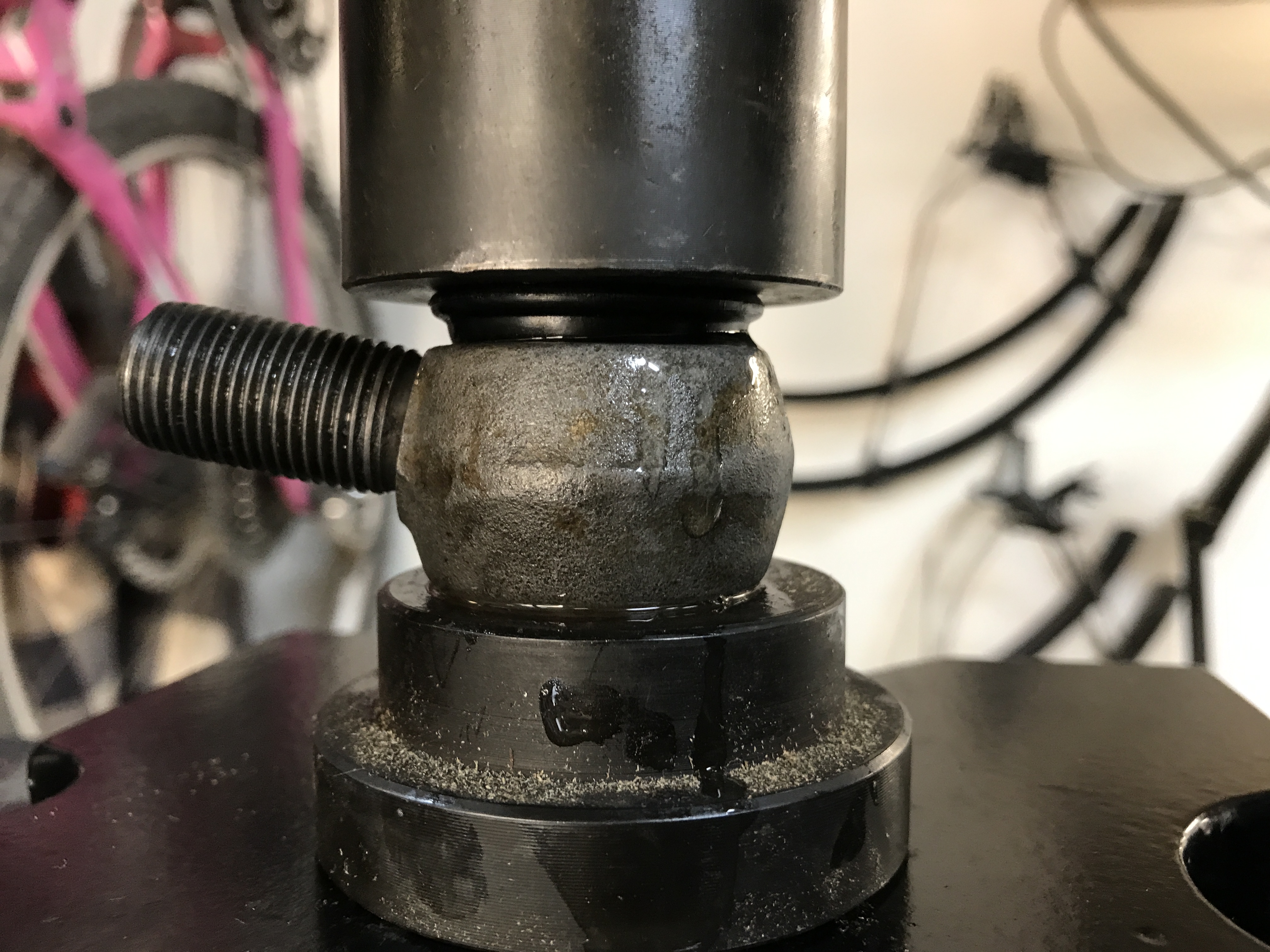 Here's the bushing and eye-bolt on the press, with plenty of liquid soap. Centering is important. Attached thumbnail(s) |