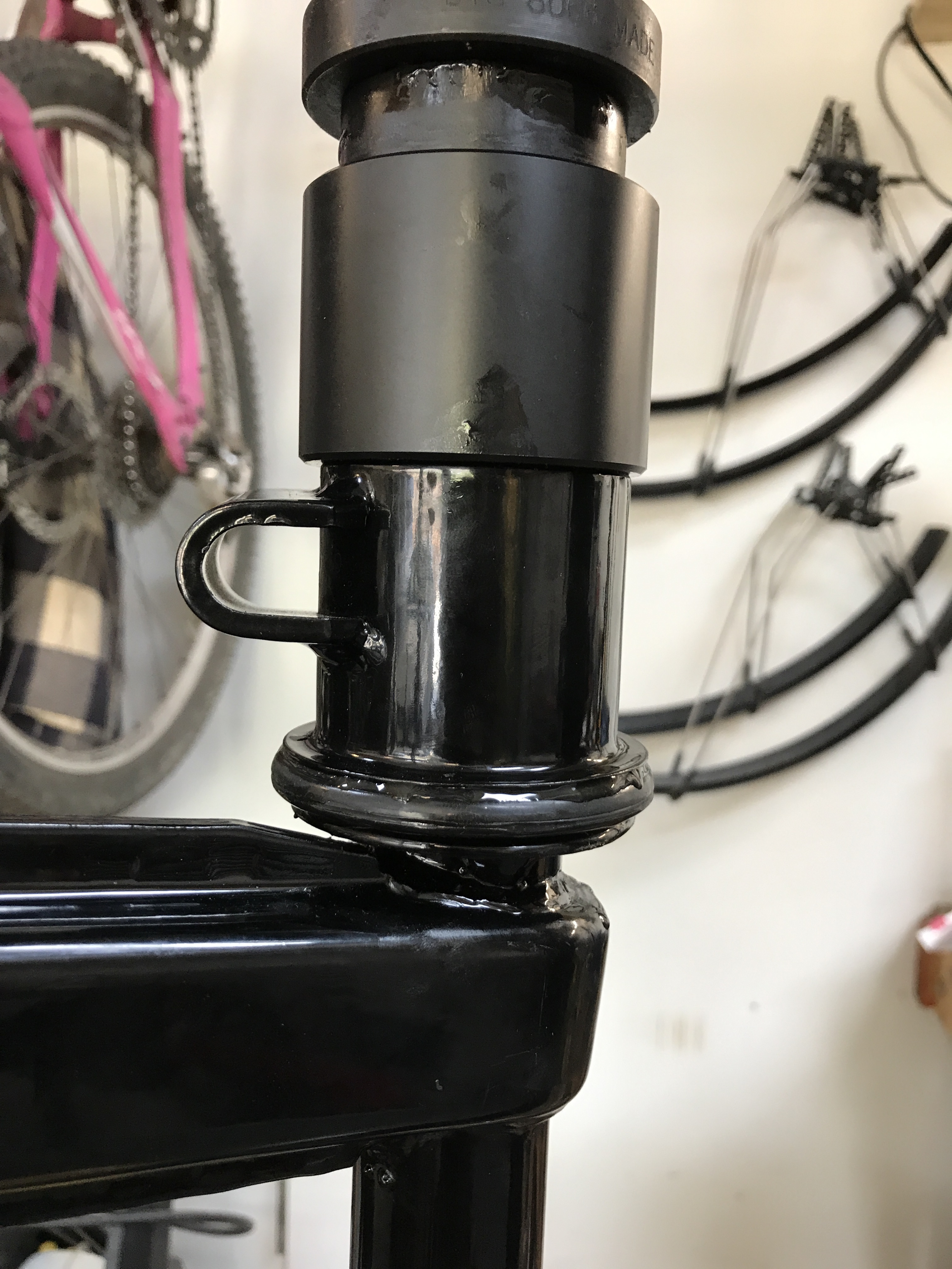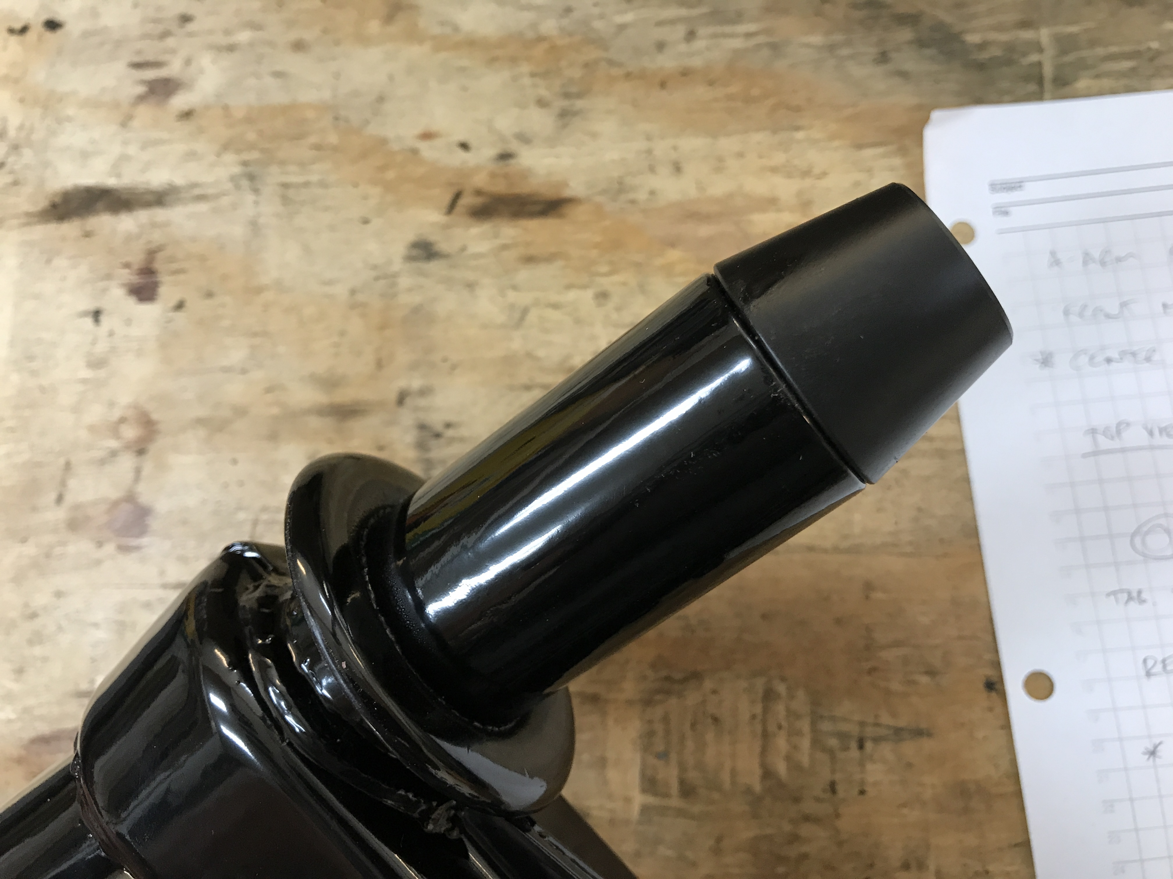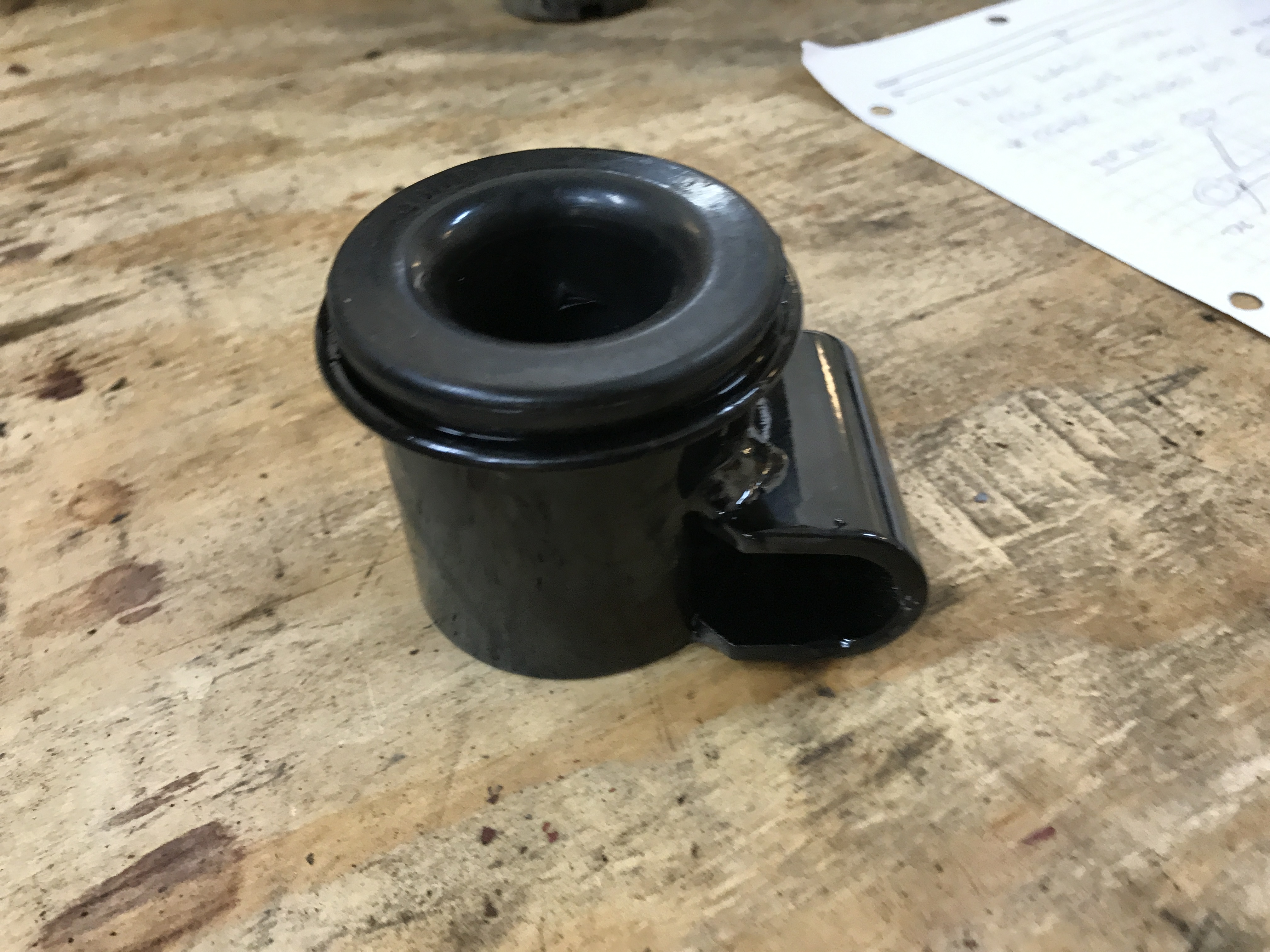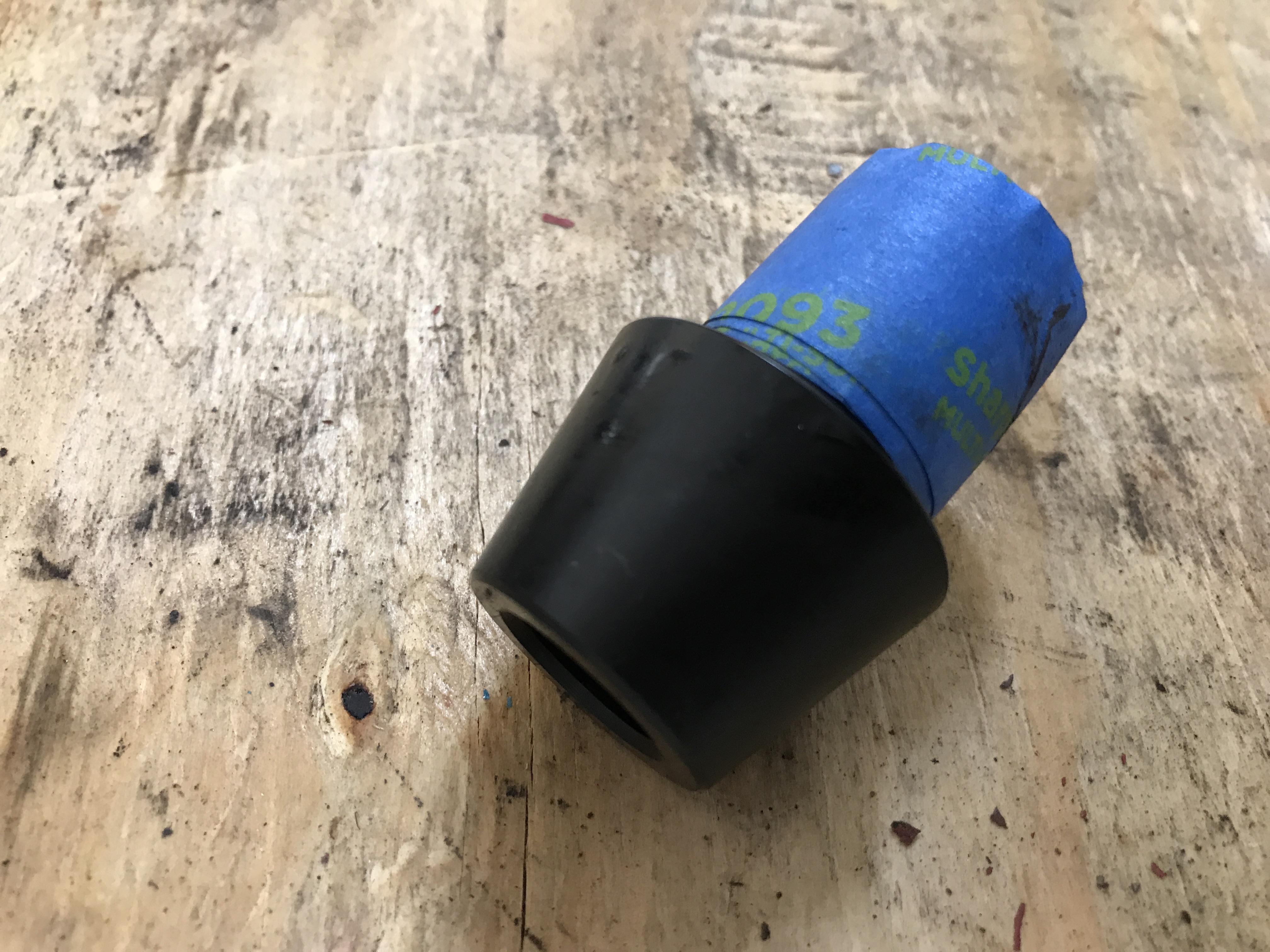 Here's the 914 Rubber inner guide, to ease the bushing onto the A-arm. The tape makes for a snug fit to center the guide.