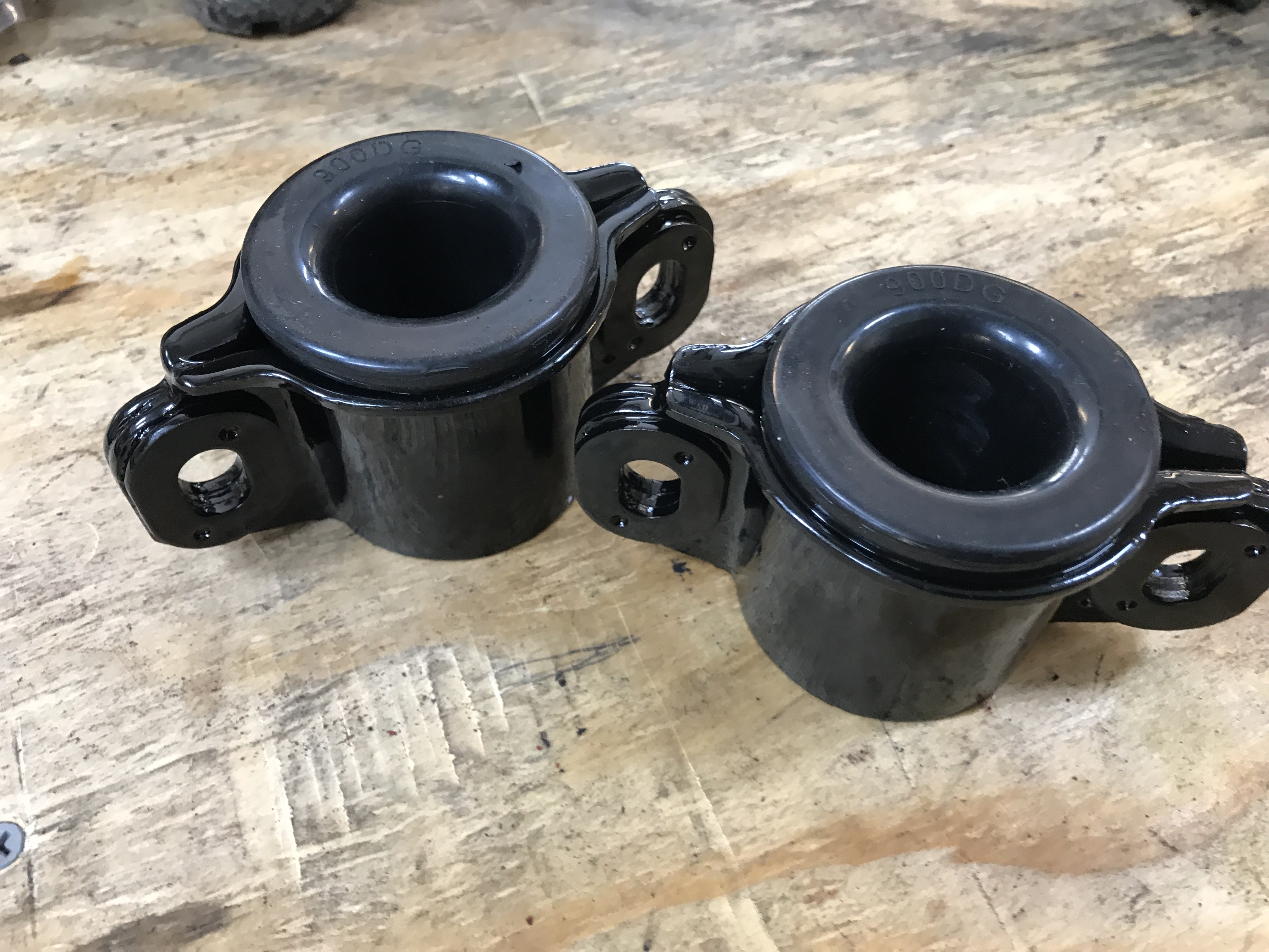 5. Install the rubber bushings into the front A-arm body mounts. Note that the mounts have a top and bottom, with the raised bosses on the top.