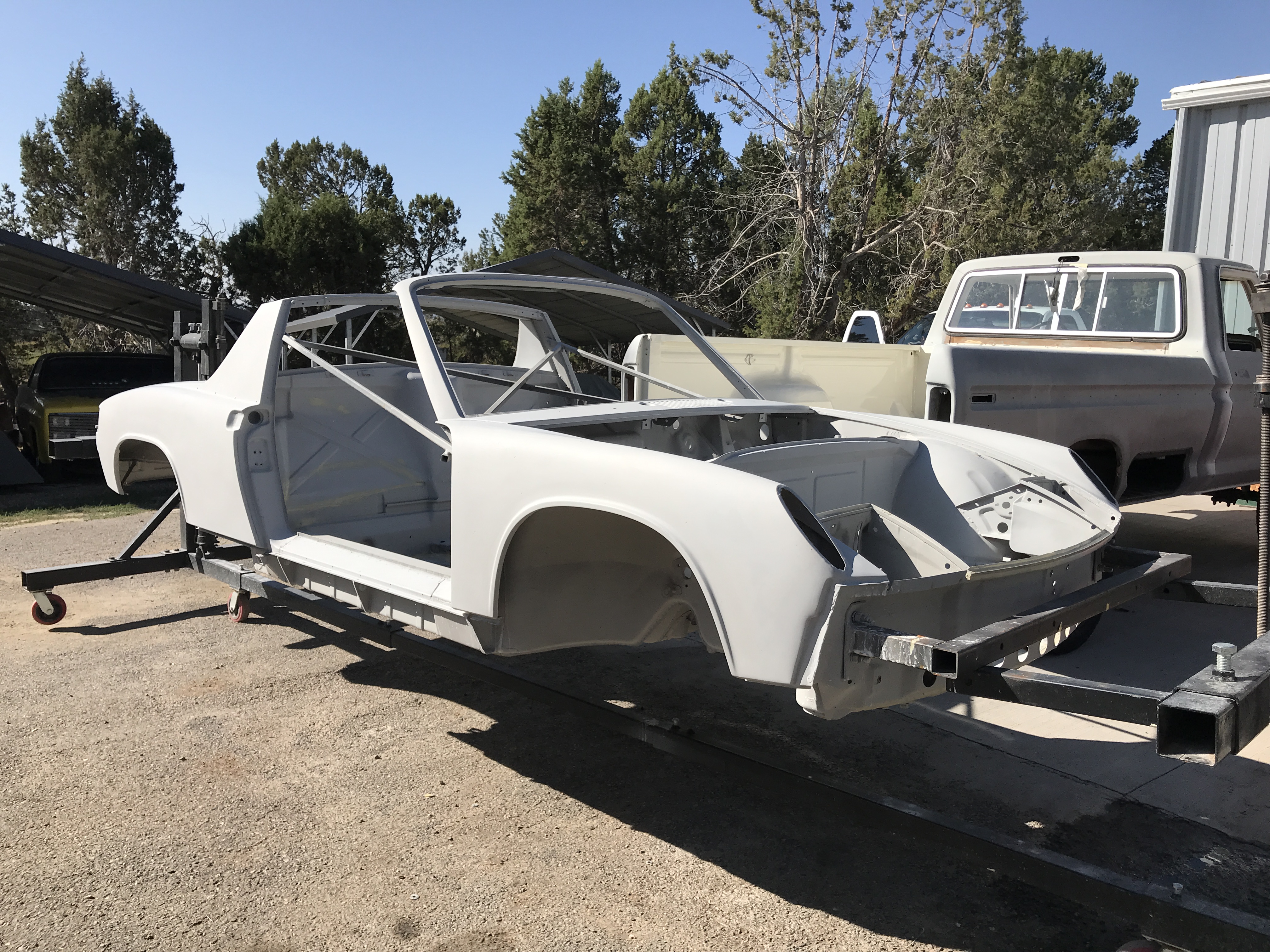 The plan is to paint the underside today, while still on the rotisserie, and then put the car on the dolly, remove the interior brace, and paint the interior and topside tomorrow and Friday. BTW, I did get to see the new color on the headlight covers--but will keep the suspense a few more days.