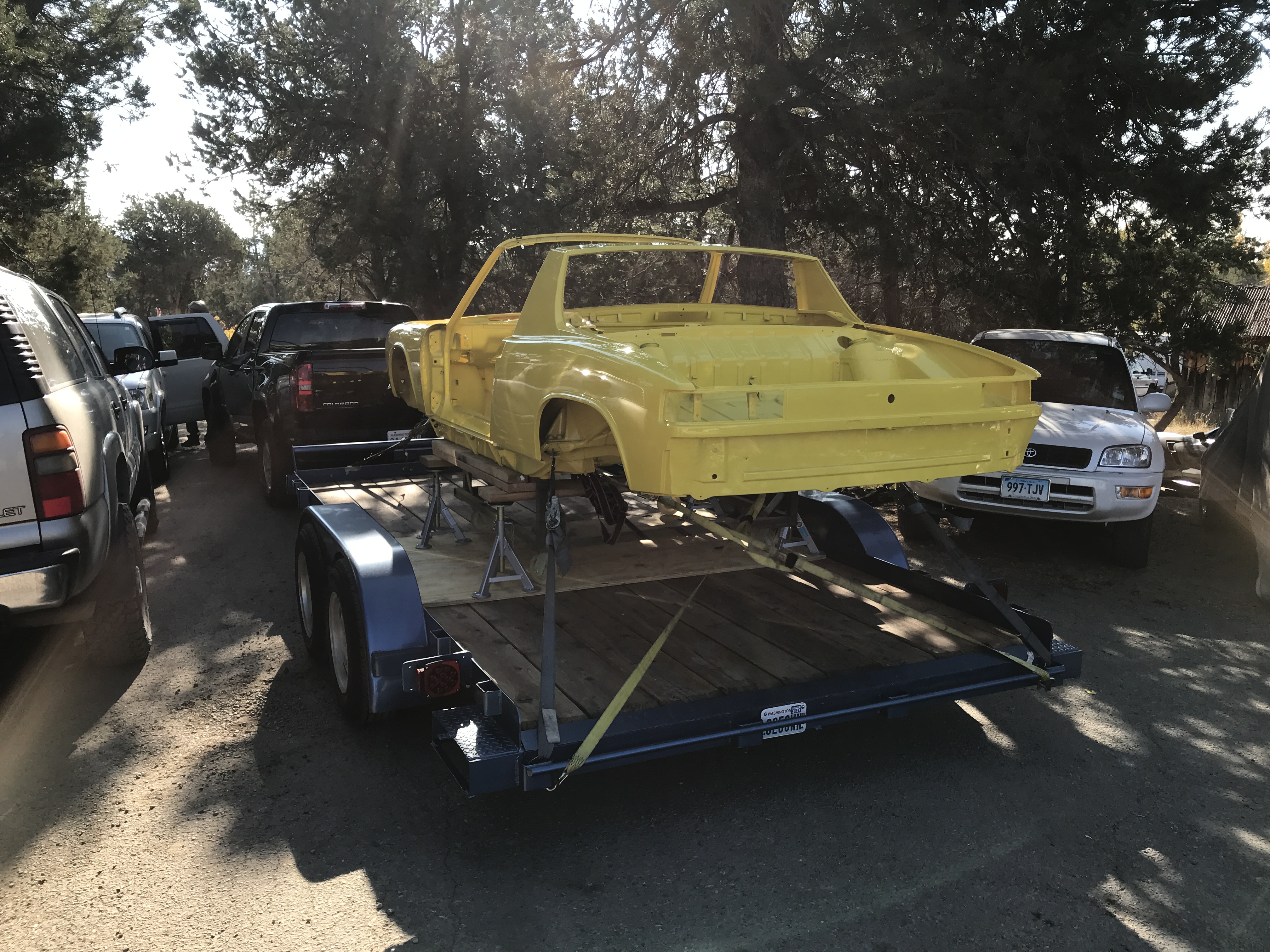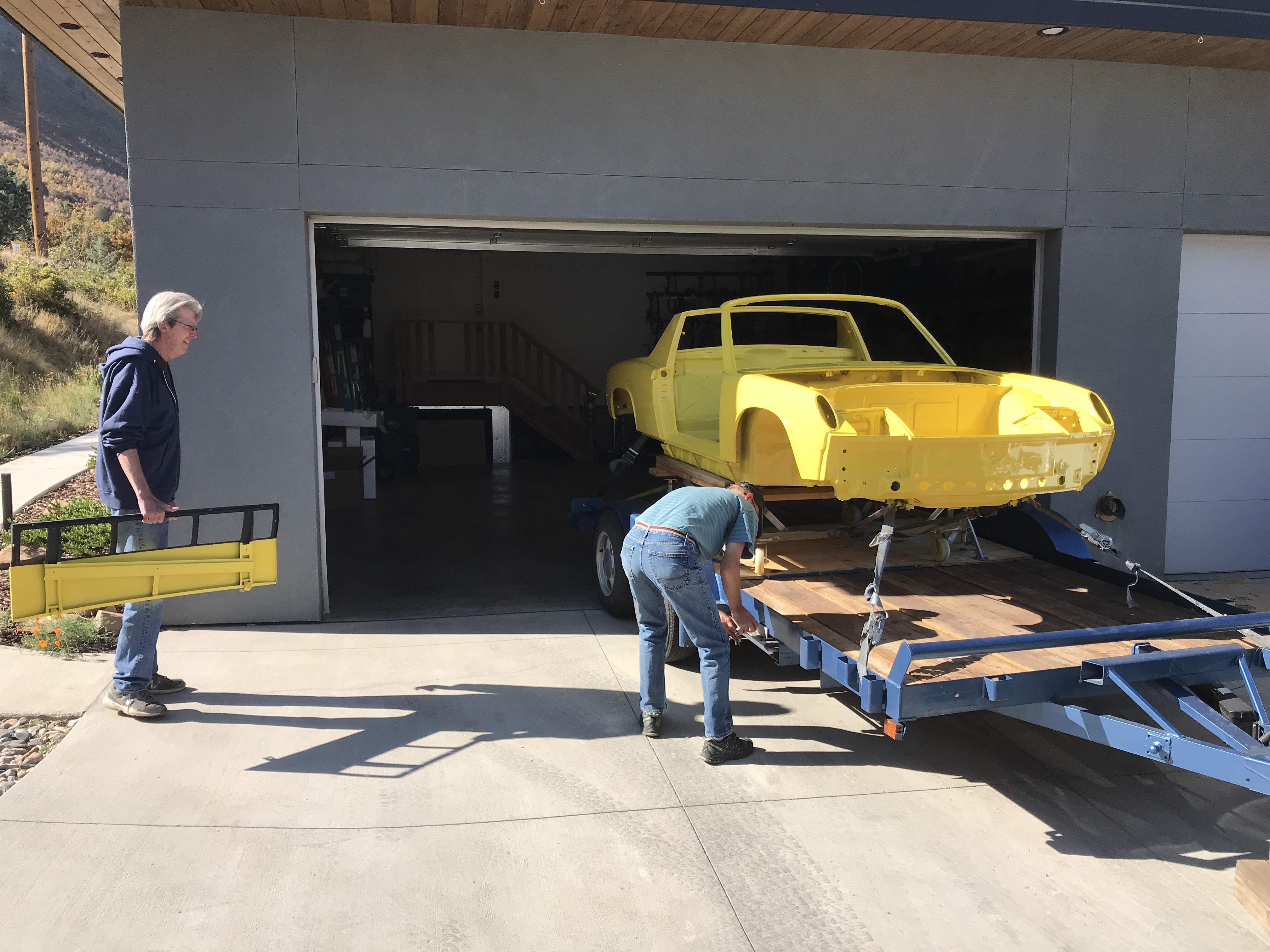 Also very satisfying to have great friends to help. We used the same method as back in July, with the car strapped to the dolly, rolled onto the trailer, then a wooden cradle supporting the longitudinals, and the cradle sitting on jack stands.