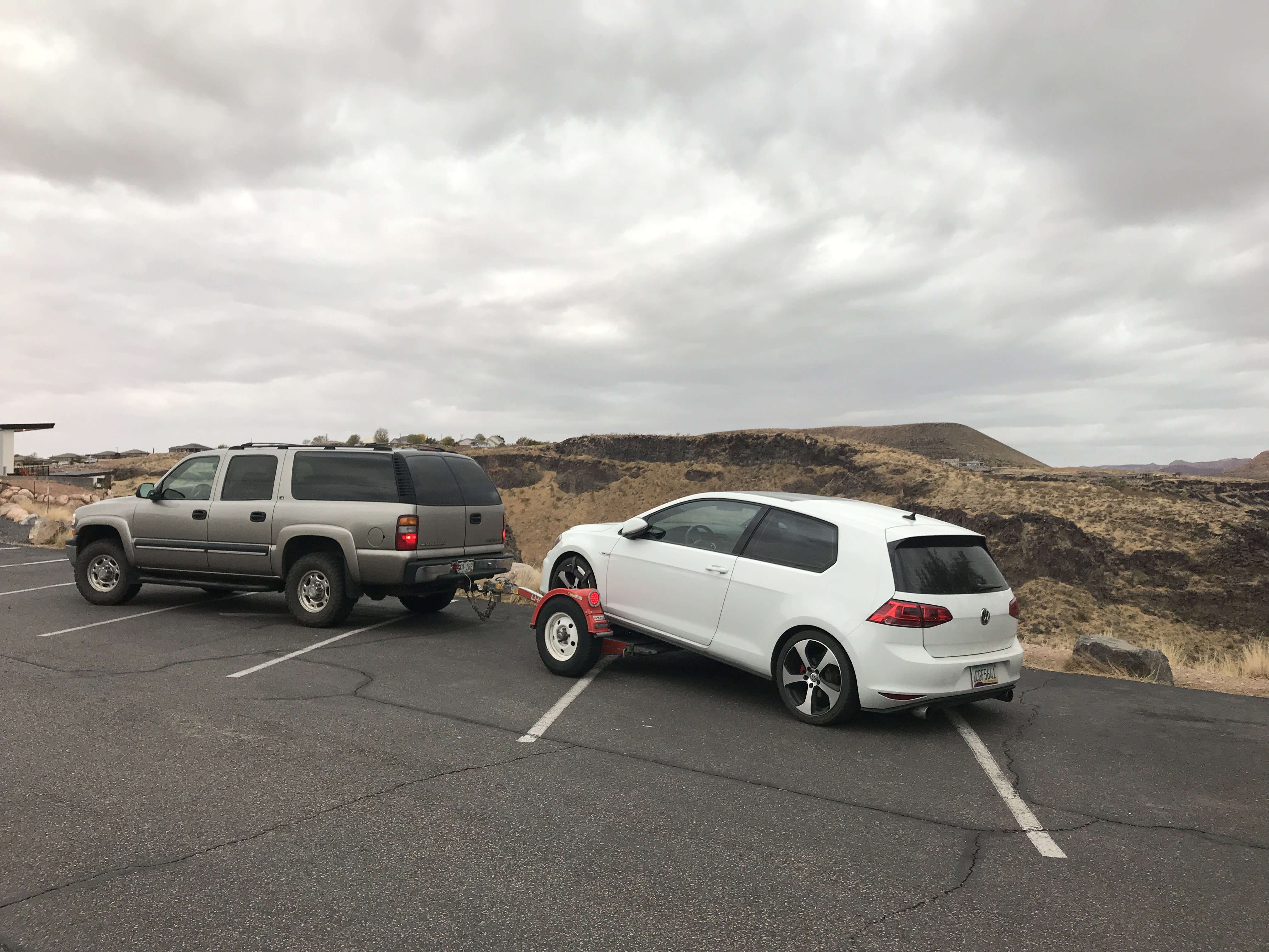 We both tried to determine options. The nearest VW dealer (St. George) did not have an oil pan in stock, and claimed about a week before they could do the job. For him to tow the car back home (Tucson) he would need to rent a trailer and box van from Uhaul, for at least several hundred $. Commercial towing would be silly expensive. So being a generous father, I volunteered to rent a tow dolly locally, and drive 400 miles to get him.