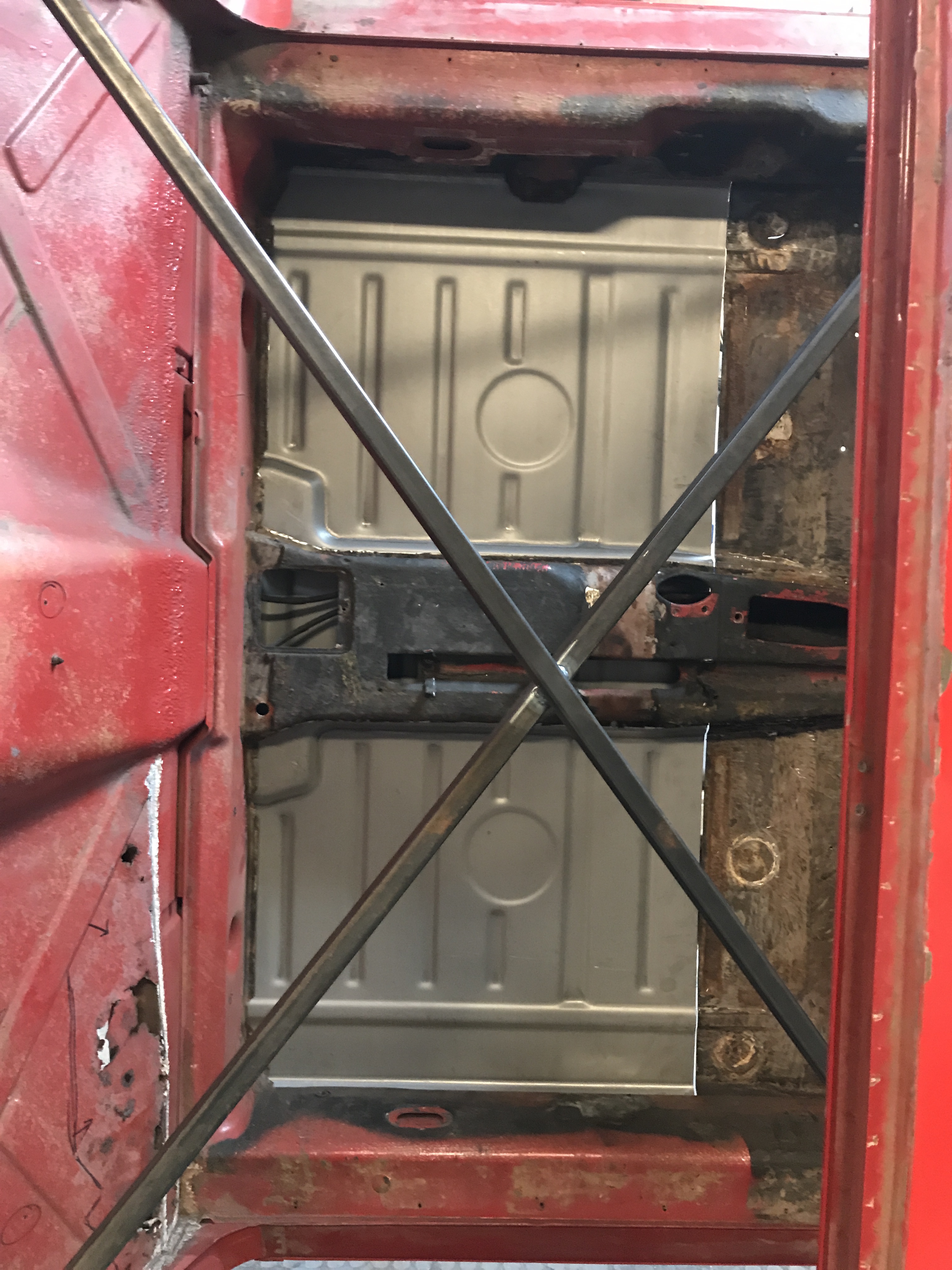 Then fitting the new floor section. First trim the excess around the edges, and then cut the remaining floor piece to fit. Decided to keep as much of the RD panel as possible since some of the rust extended forward of the cross brace.