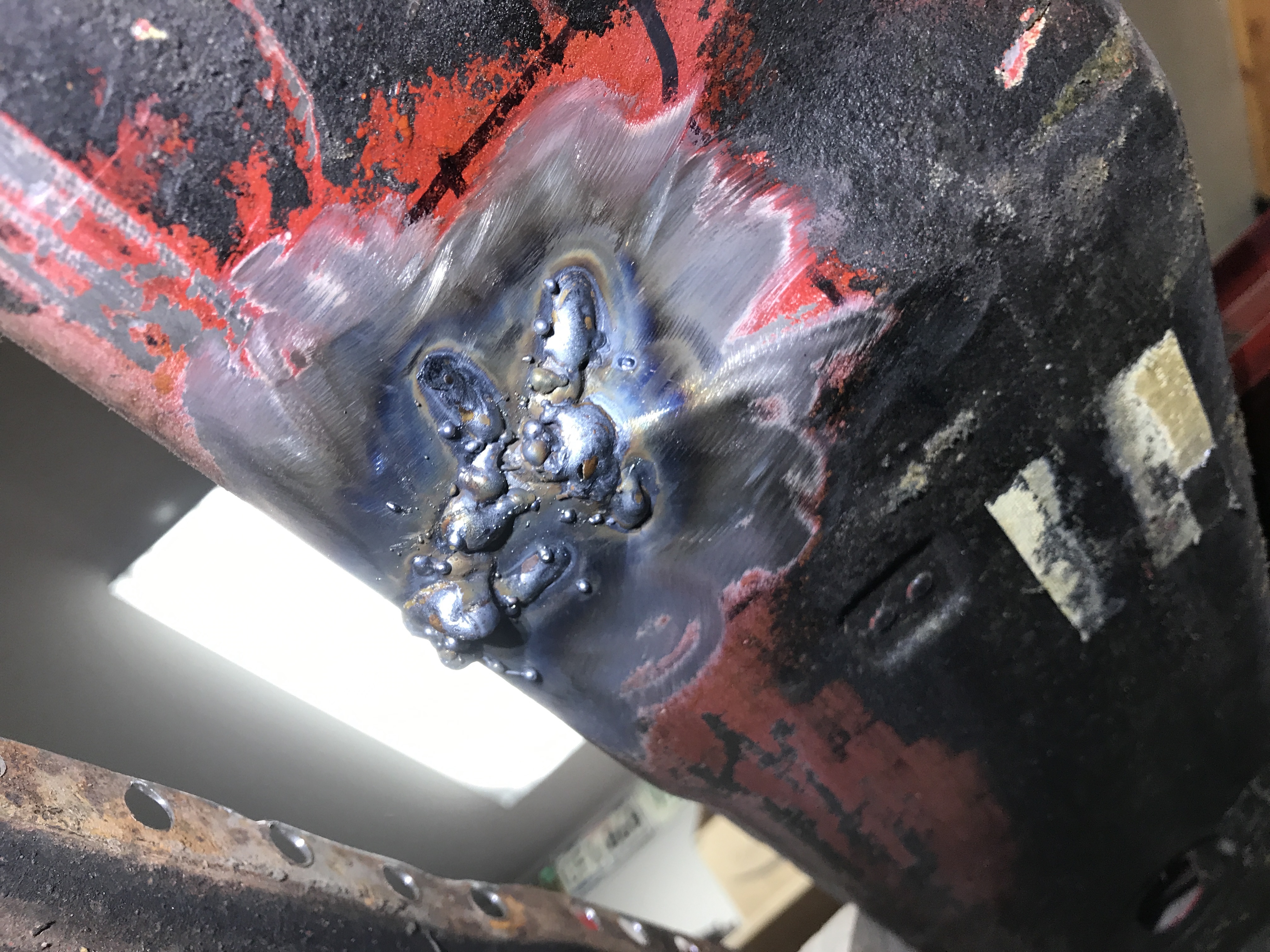 A few things to do before I can start welding in the floor. Item #1: welding the web of cracks in the left inner long, at the parking brake handle recess. A little sloppy (my excuse: upside down, which I could have corrected by rotating the rotisserie, but...).