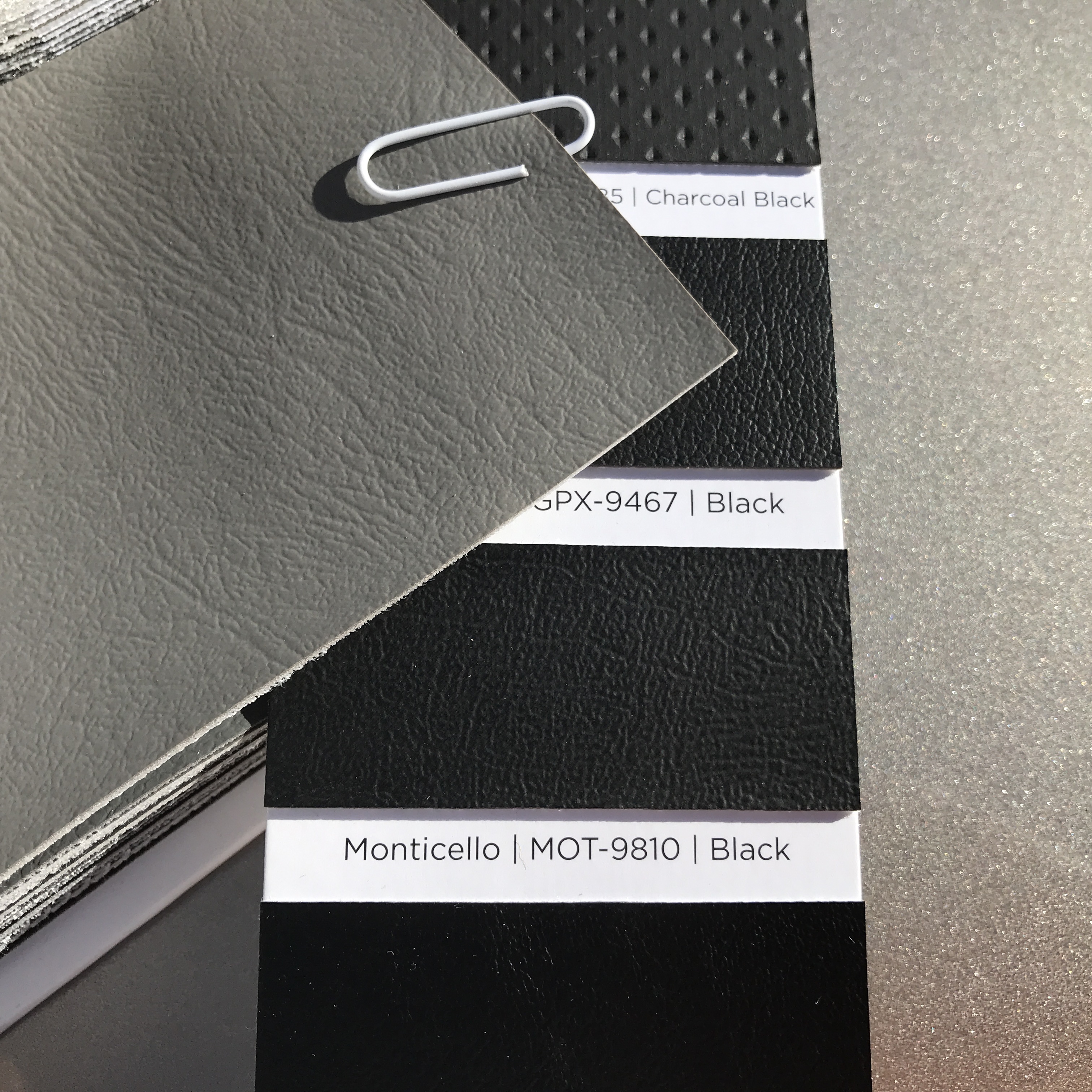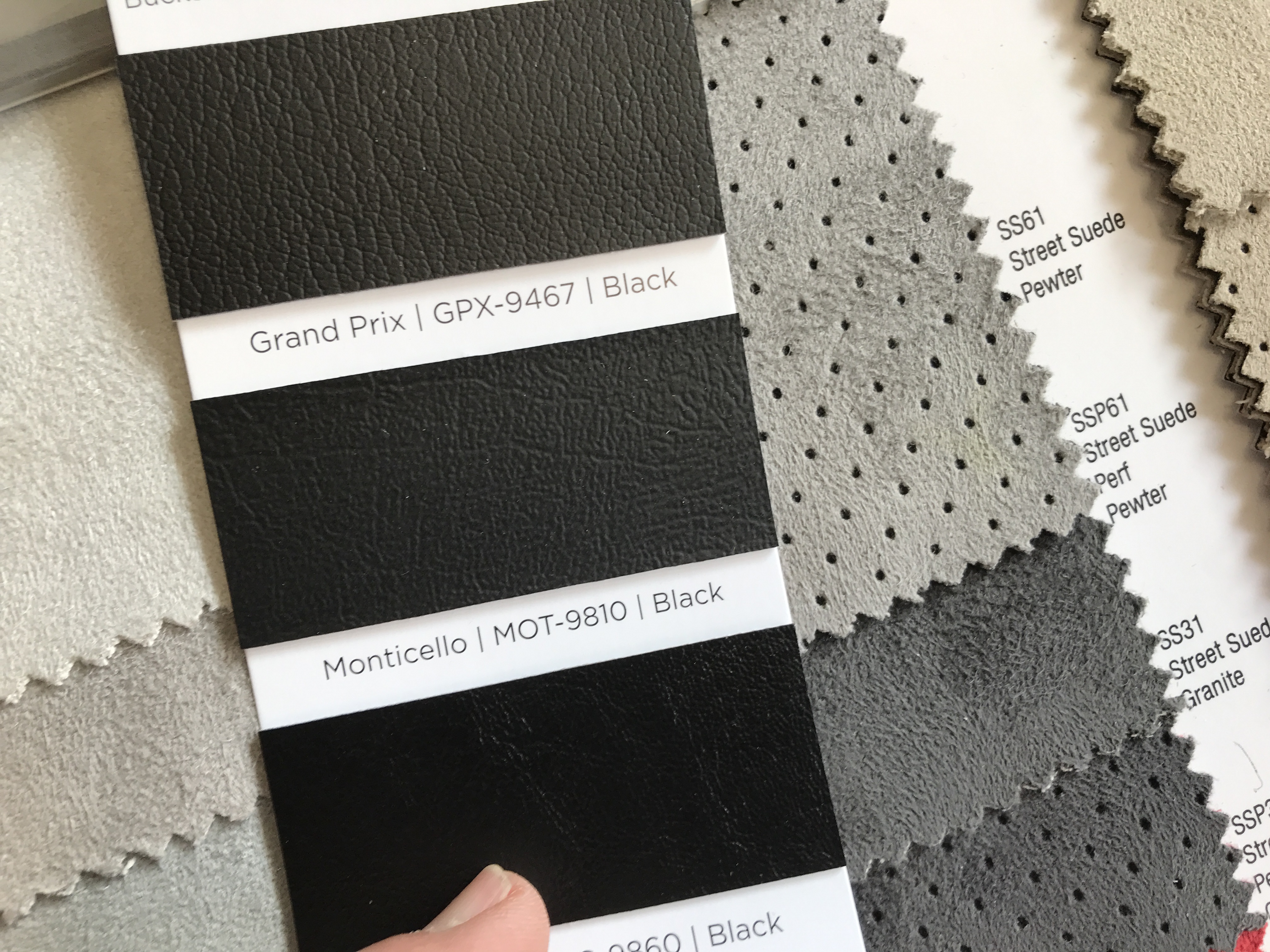 Back at the upholstery shop today, and I changed my mind about the alternate color material, for the seat cushions and the main part of the door panels. Instead of suede I will use vinyl, with perforations.