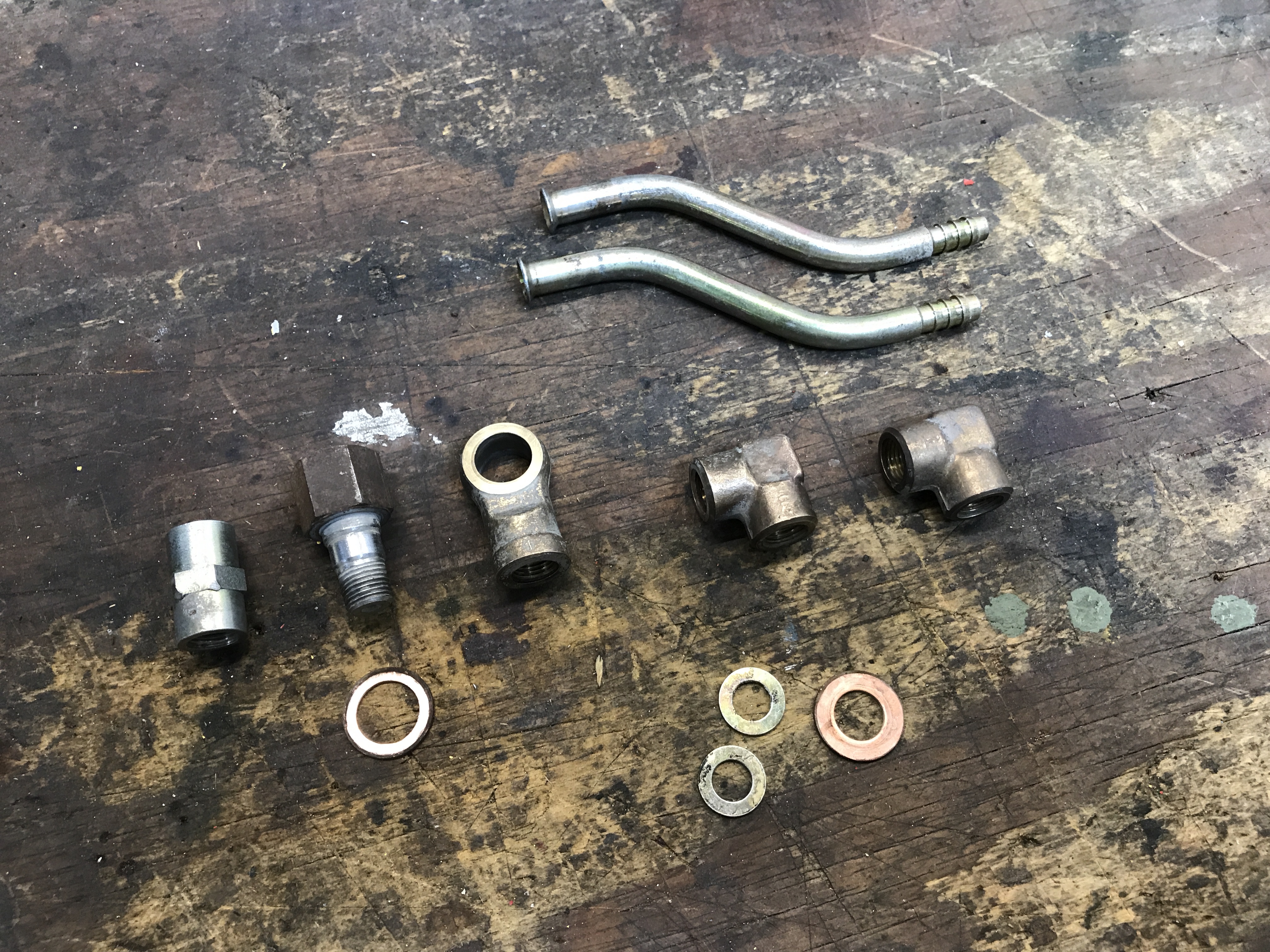 I also gathered the brake line fittings for cleaning. The master cylinder front line adapter is steel, and still needs some rust removal. Soaking that tonight in Evaporust.