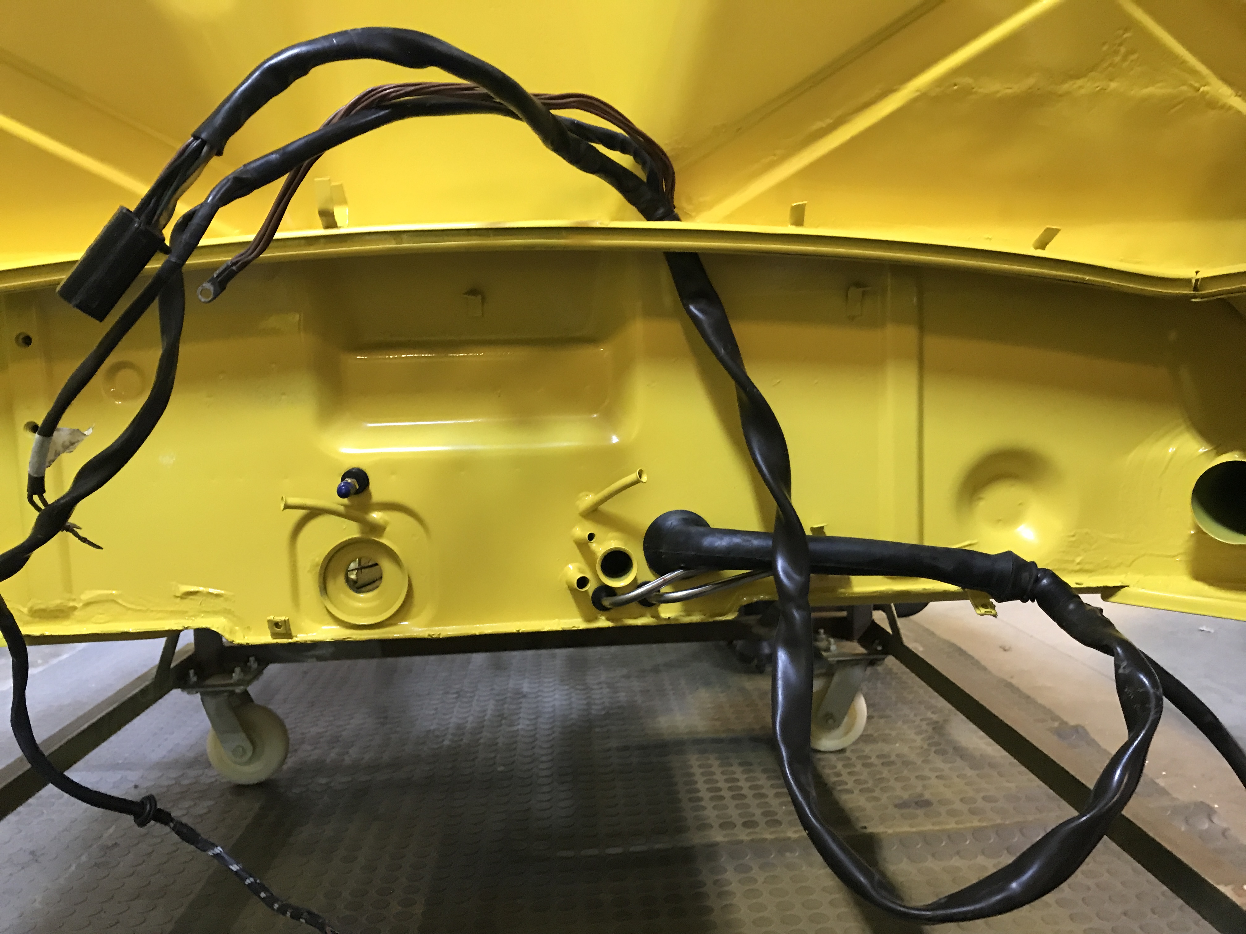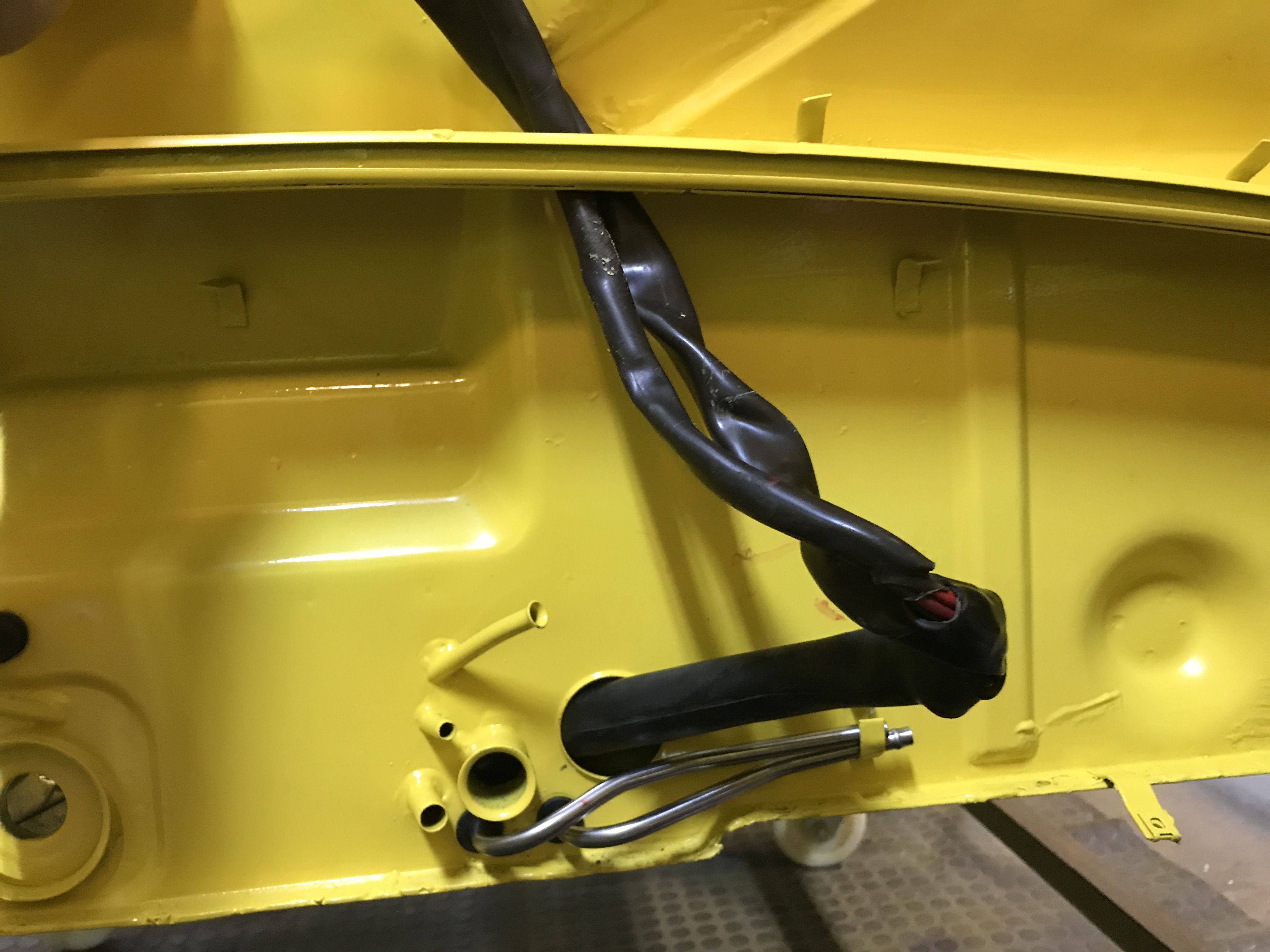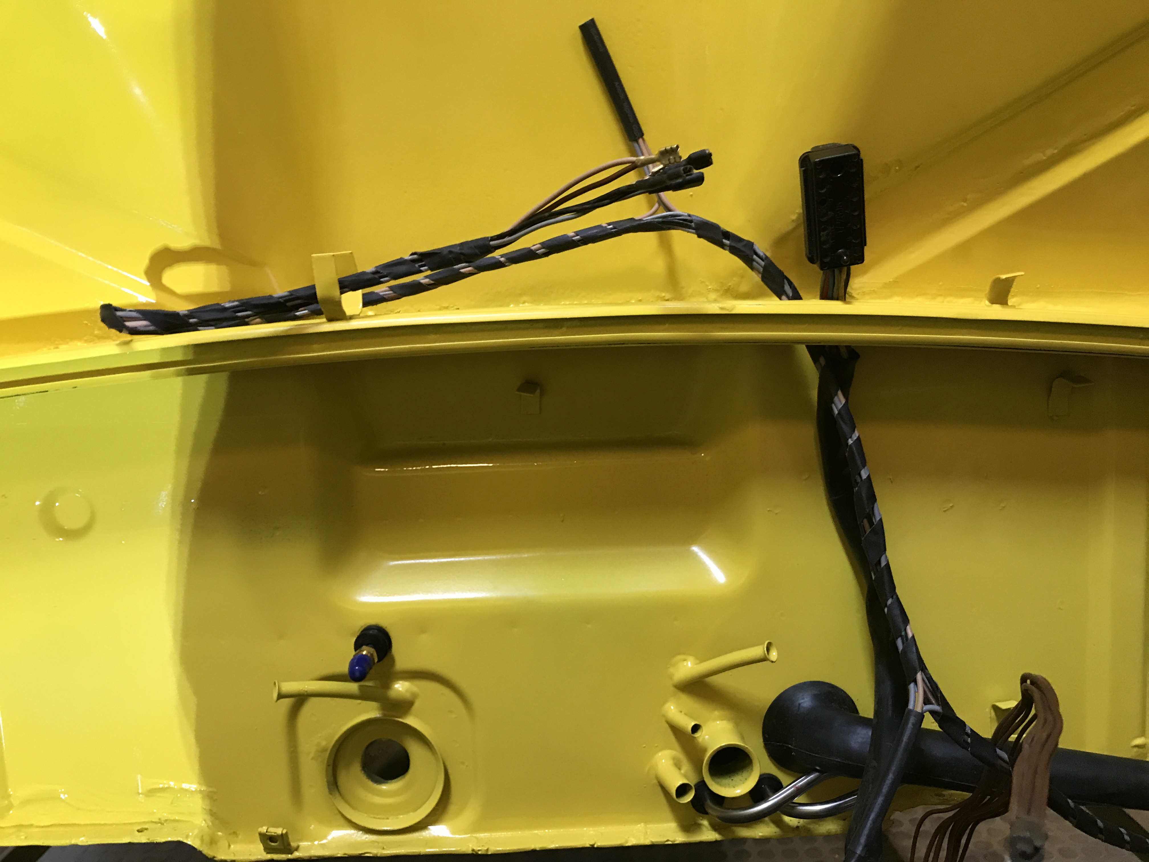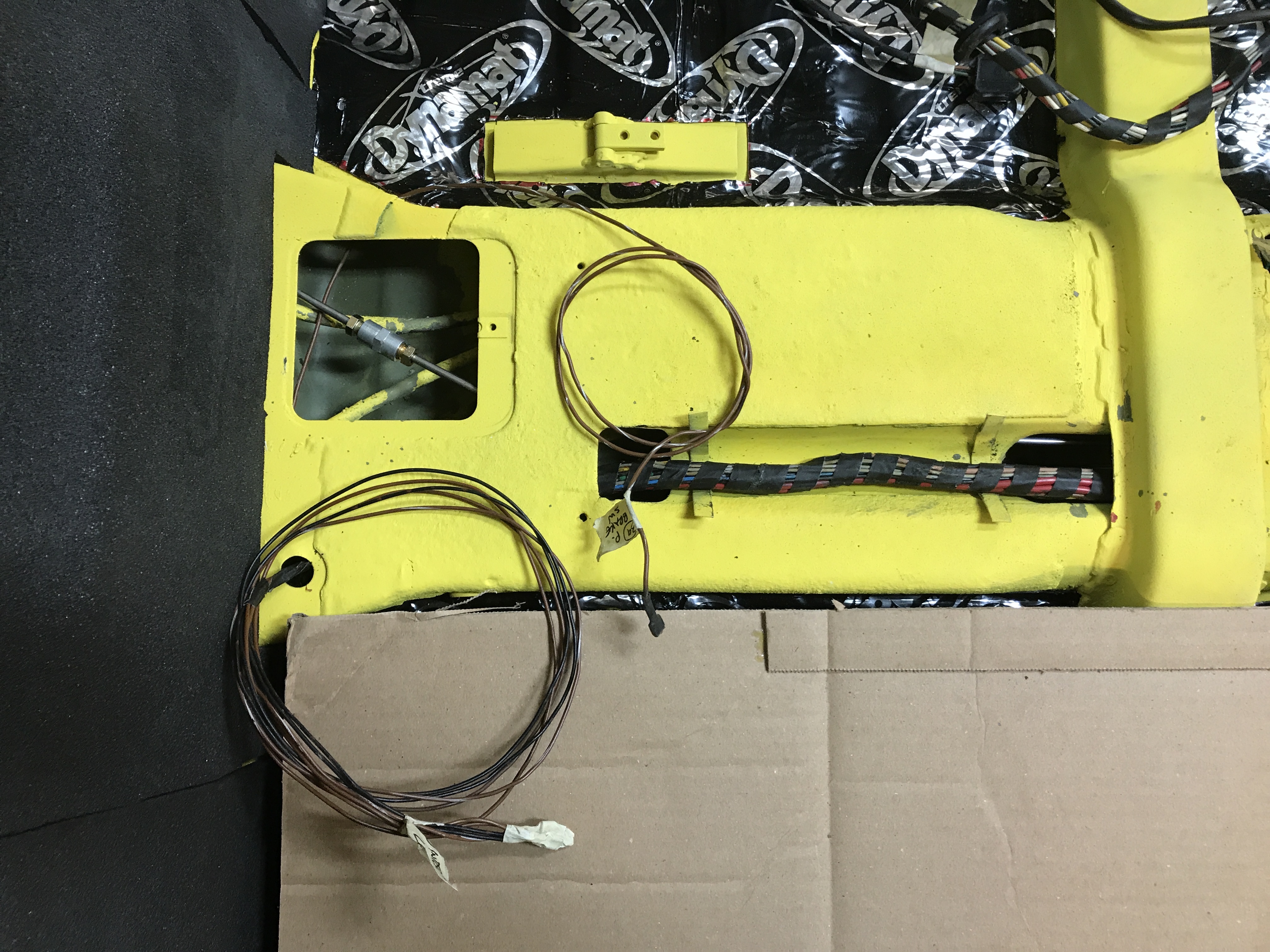 That's success for the rear harness through the tunnel and firewall! The coiled wires here are for the interior light and the parking brake. These need some grommets where they exit the tunnel.