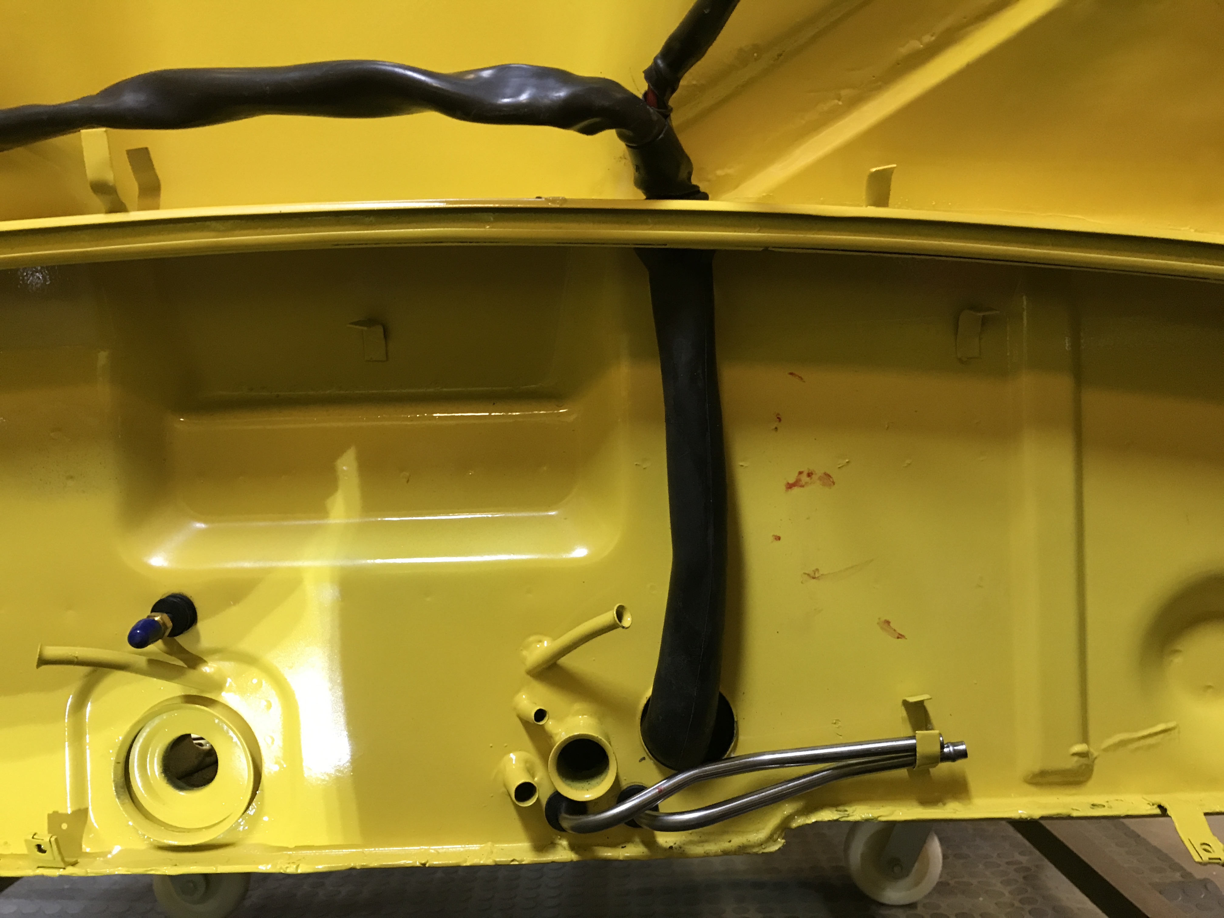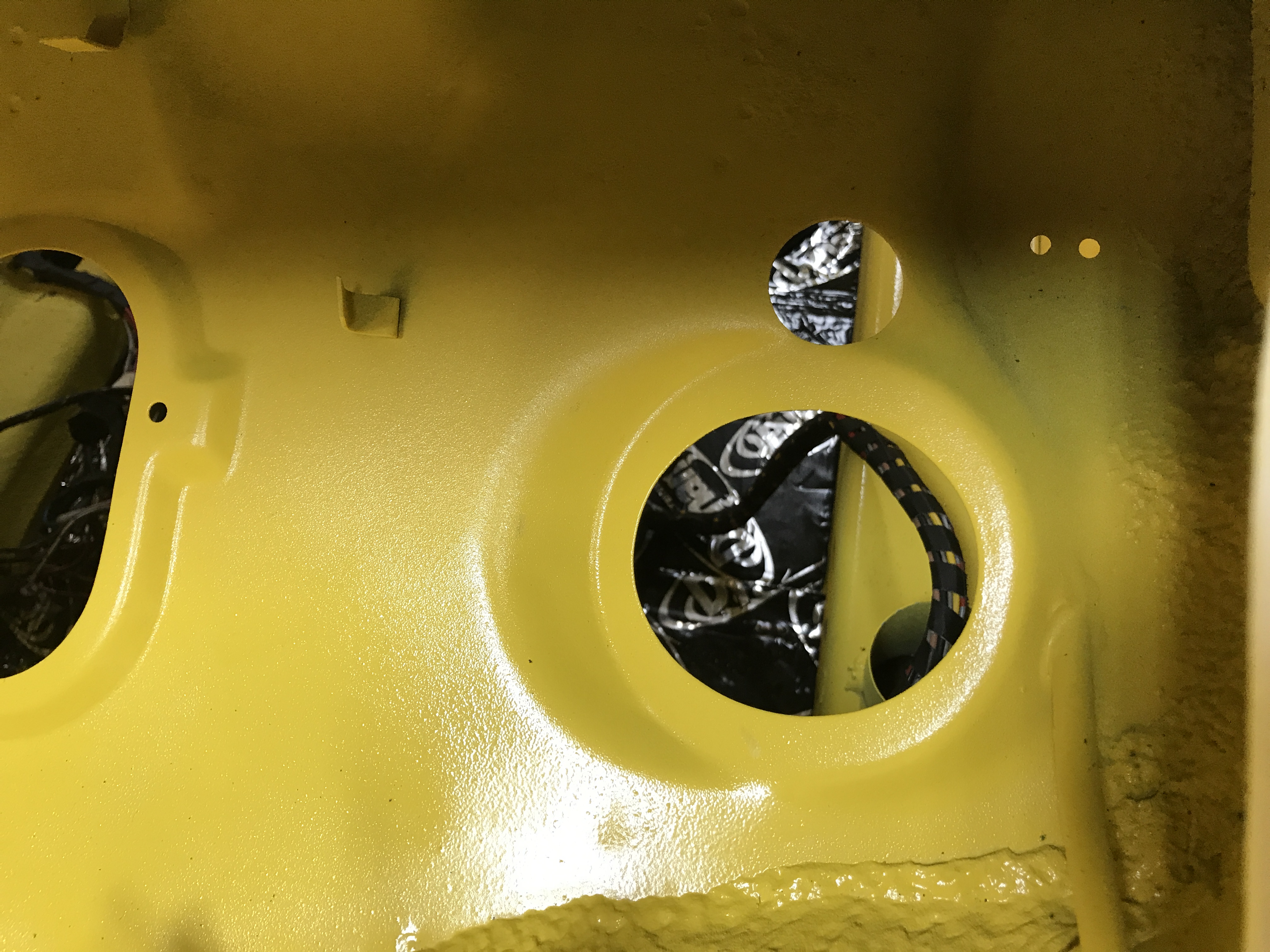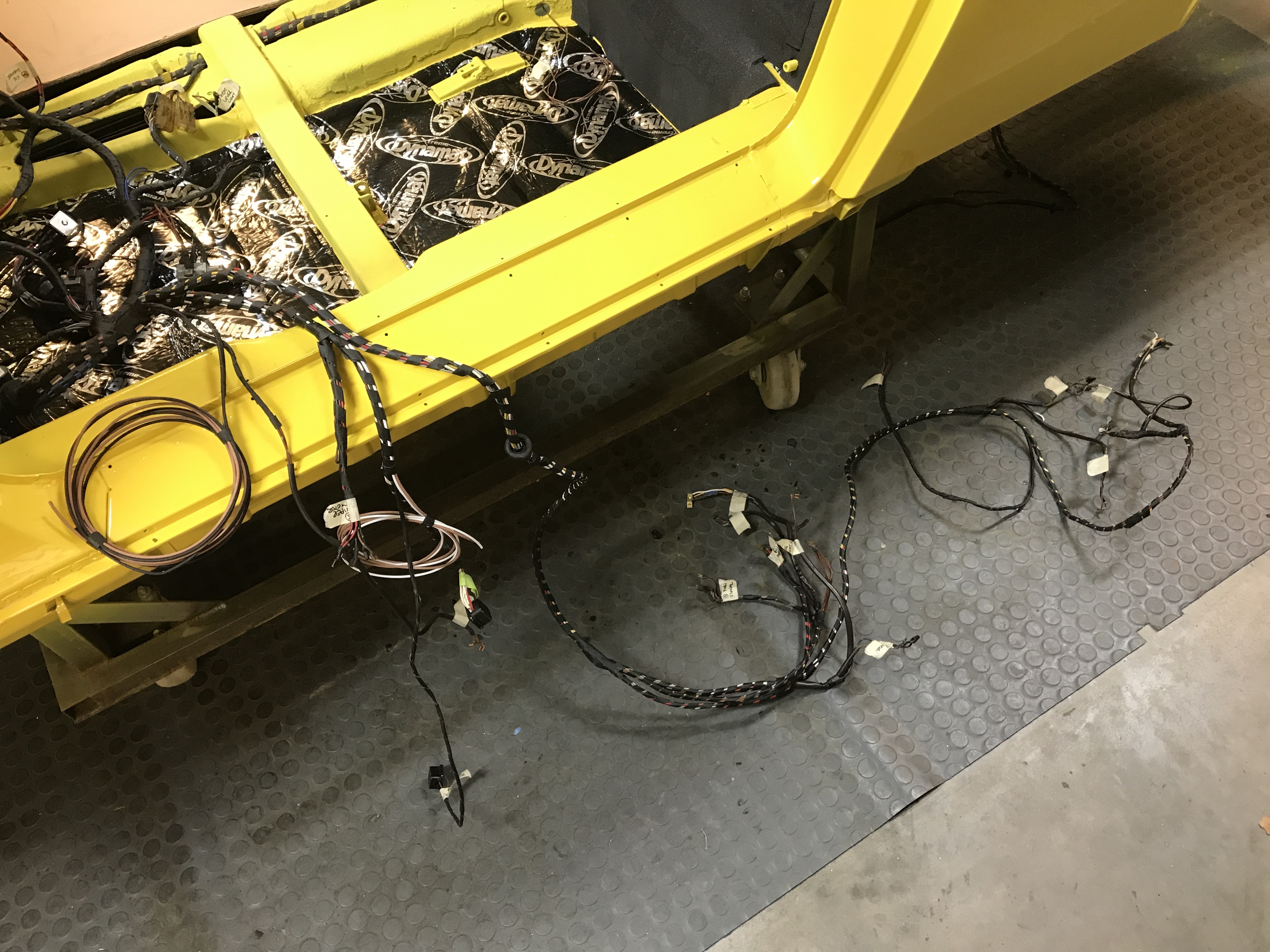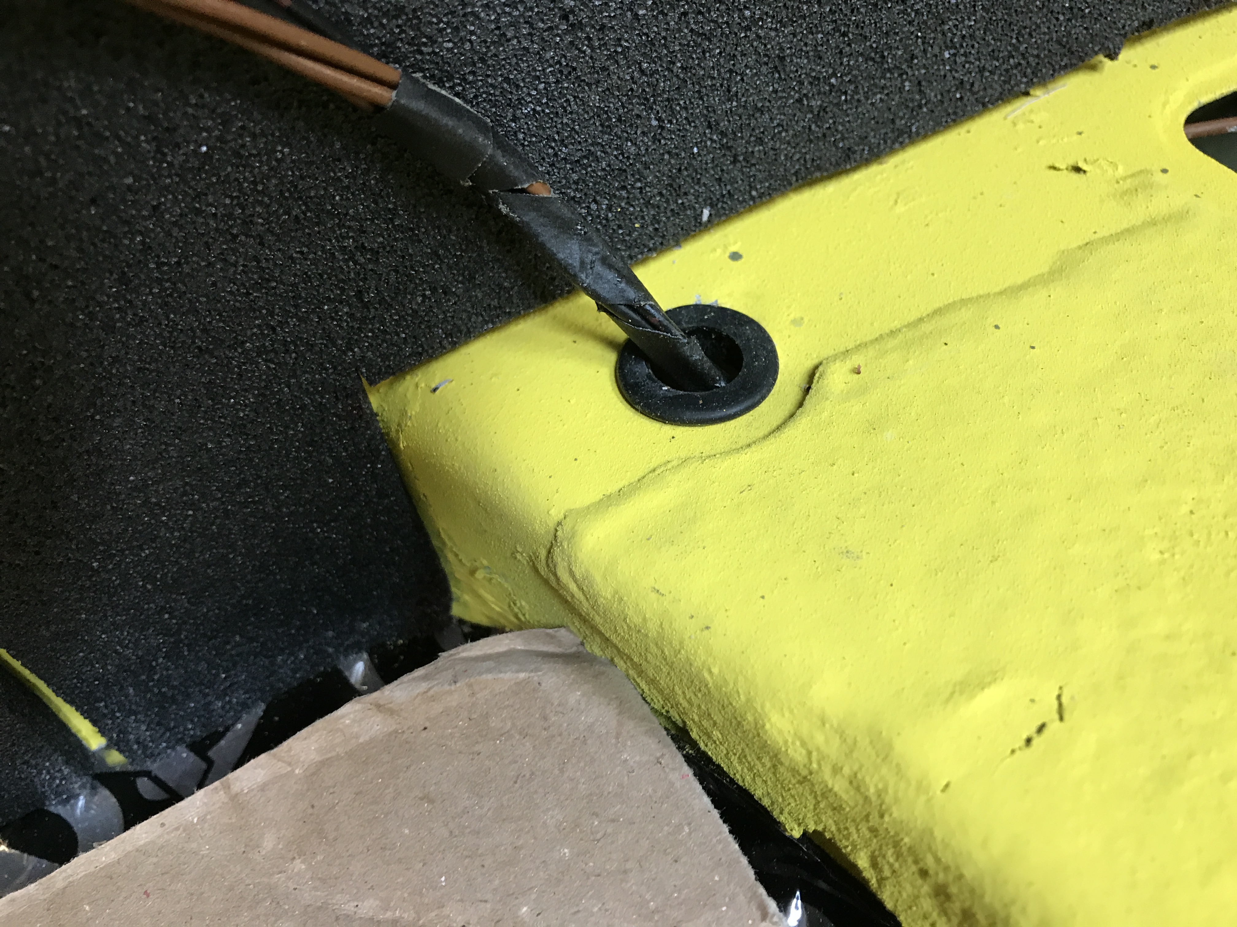 That's success for the rear harness through the tunnel and firewall! The coiled wires here are for the interior light and the parking brake. These need some grommets where they exit the tunnel.