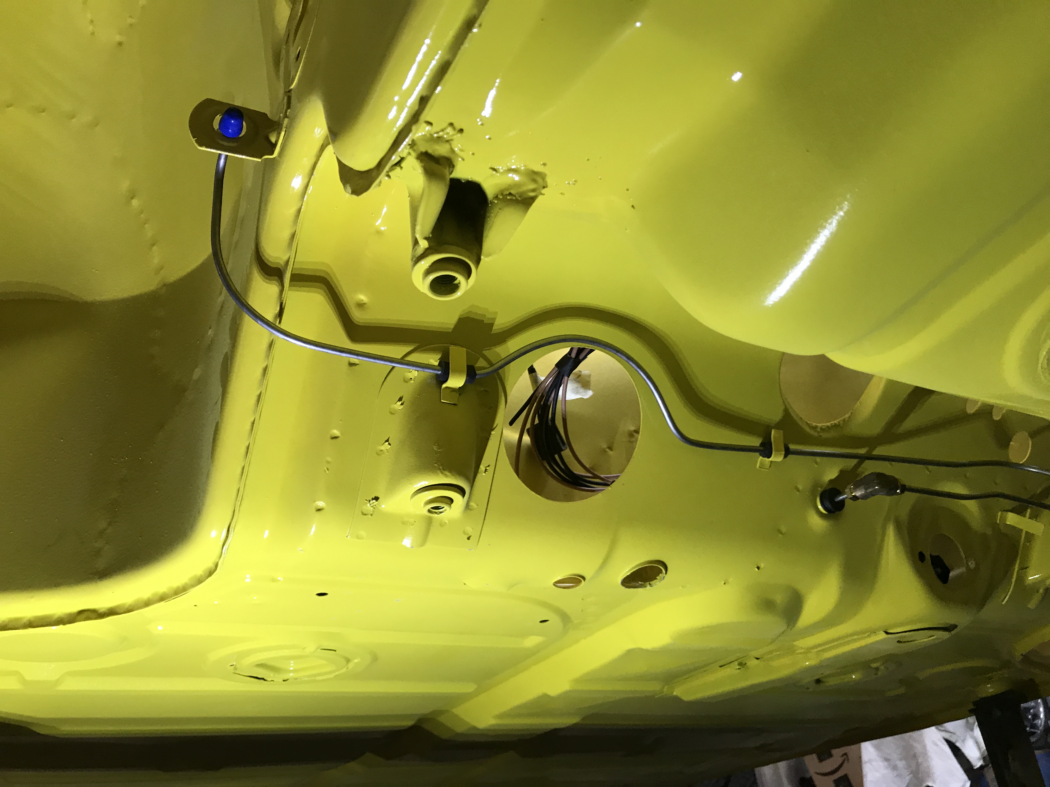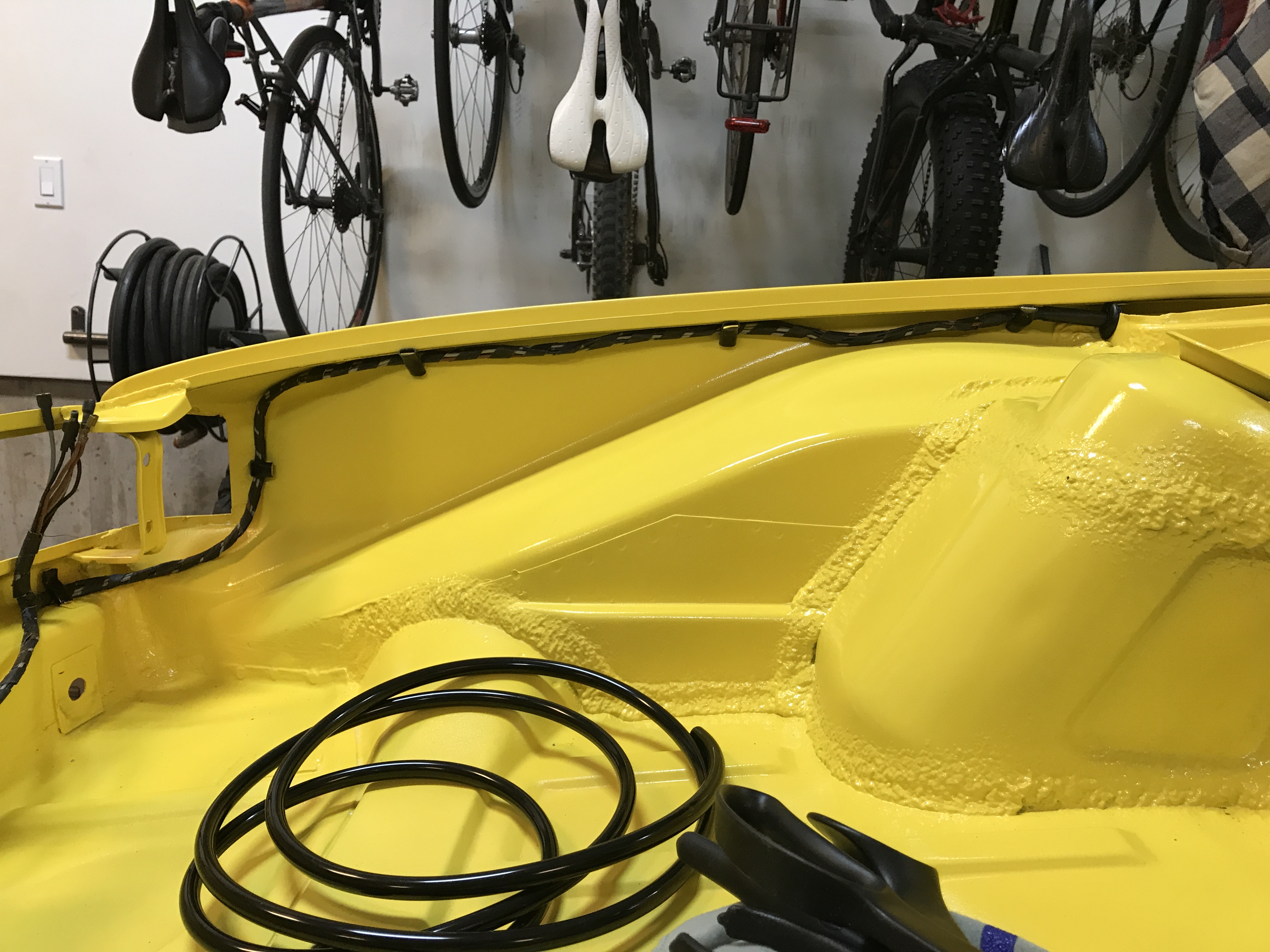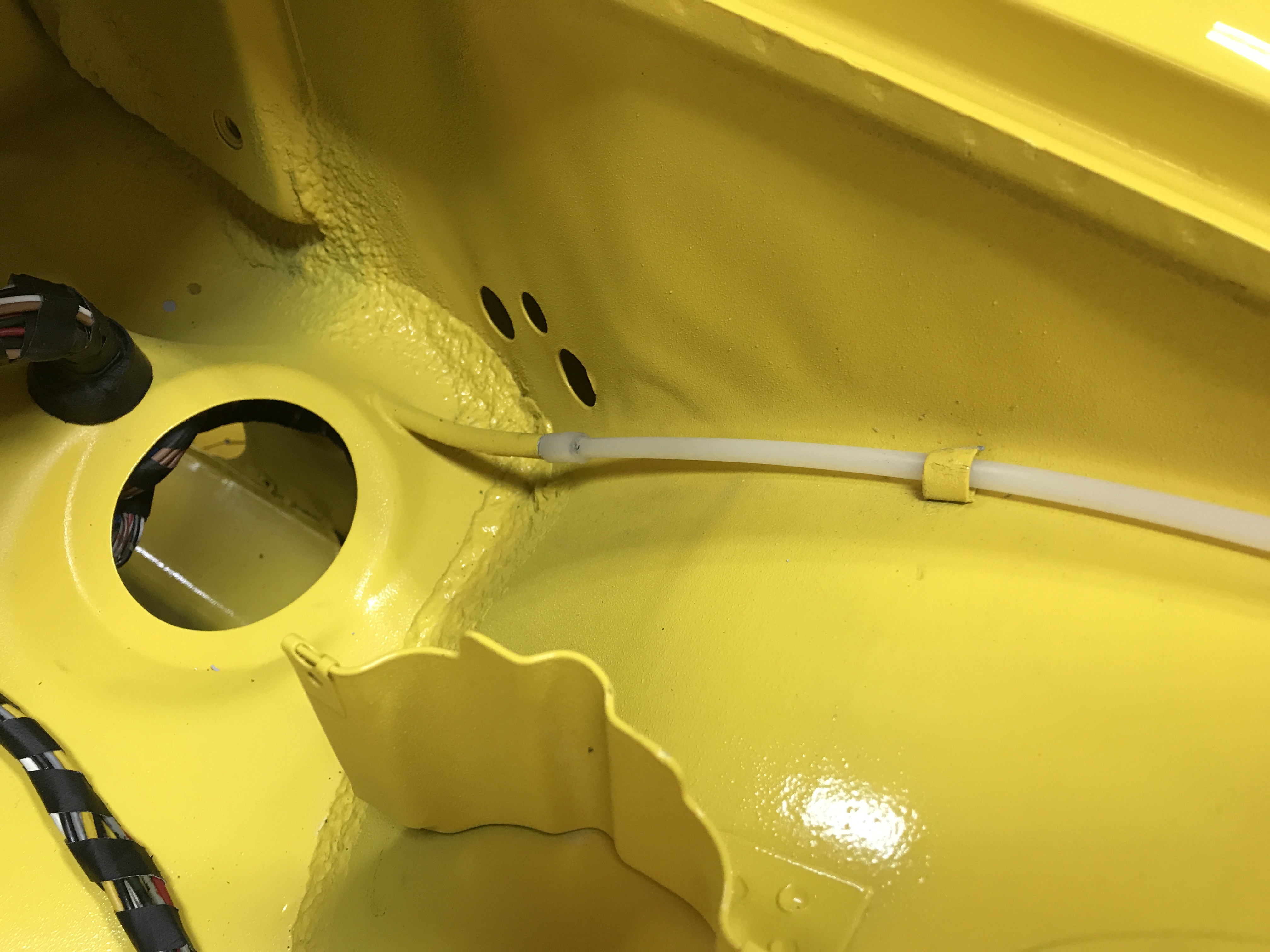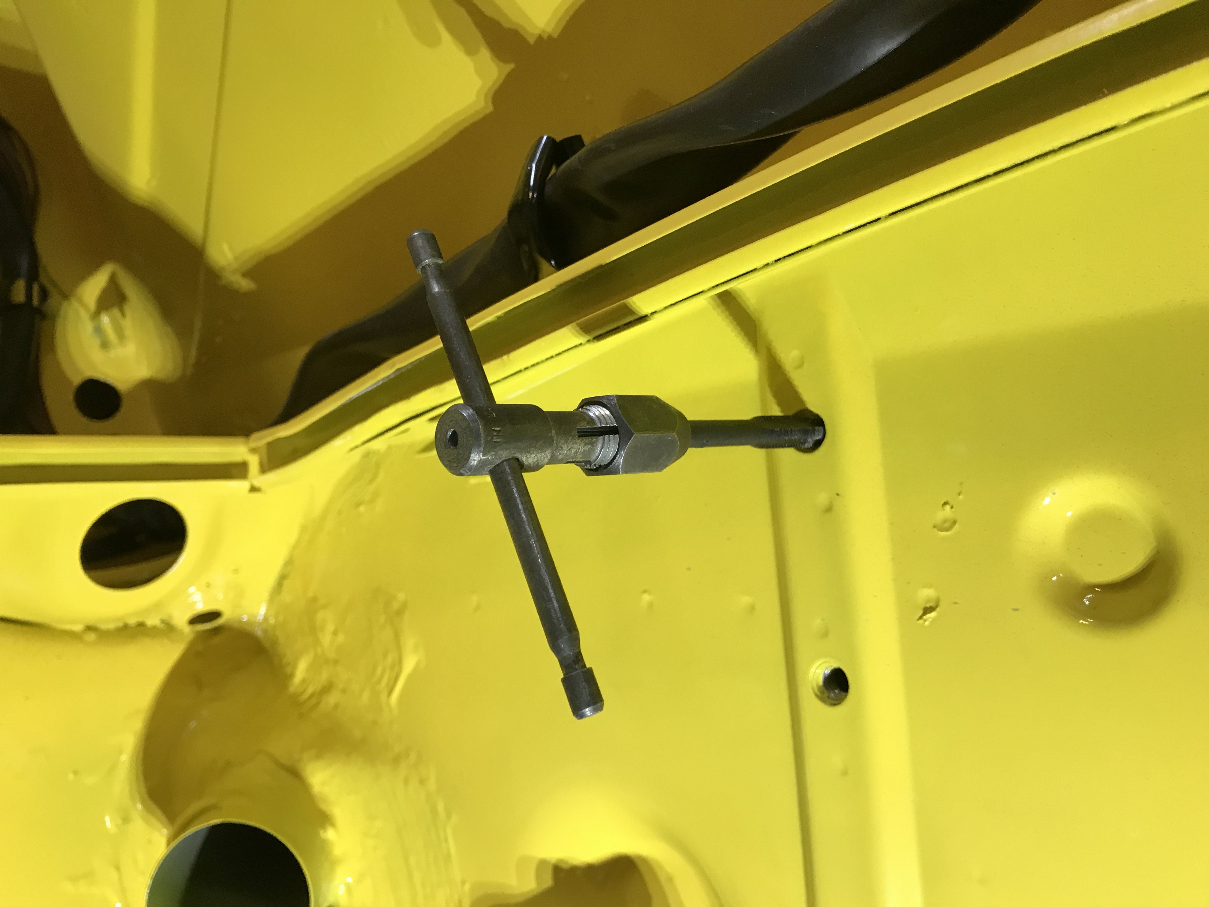 Another task: the frunk release. New cable housing, fed into the steel dash tube--a tight fit.