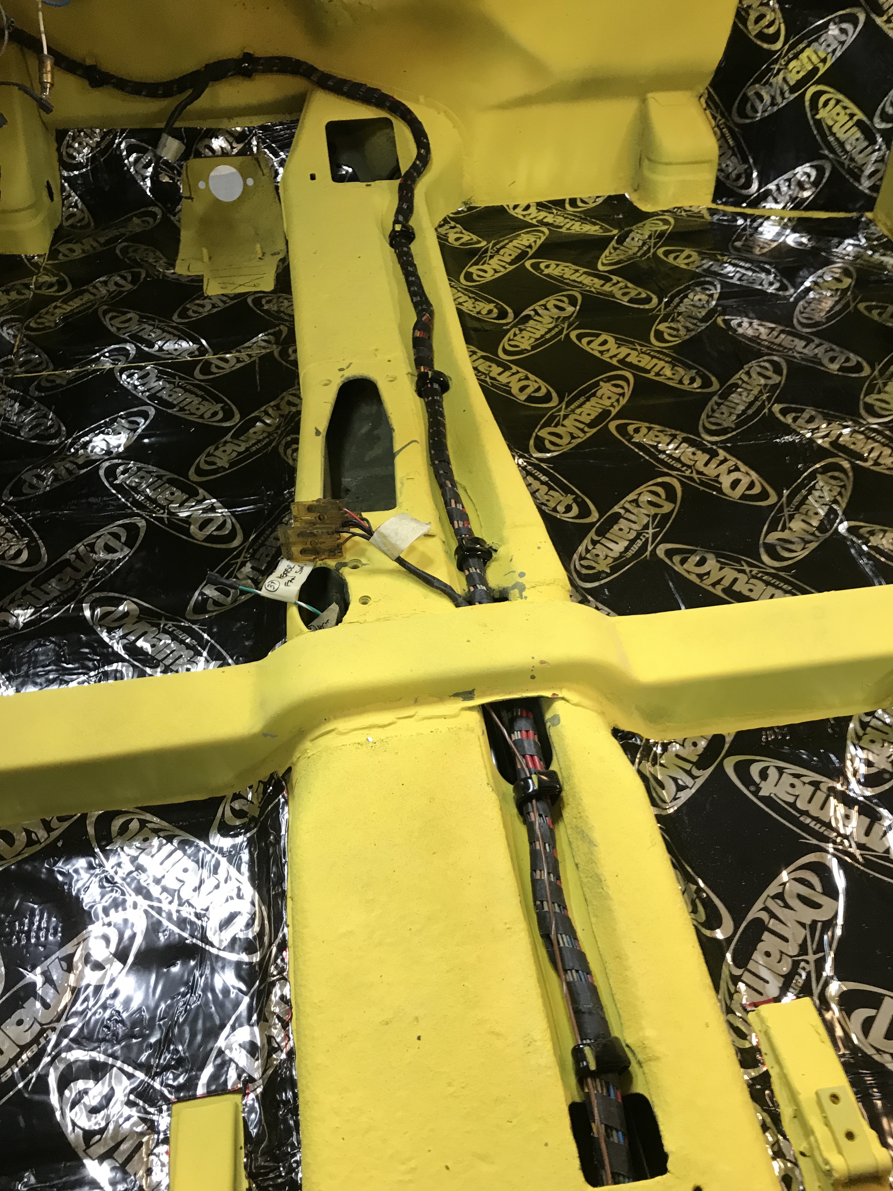 Finishing up tying down the harness, with the double tabs along the center tunnel.