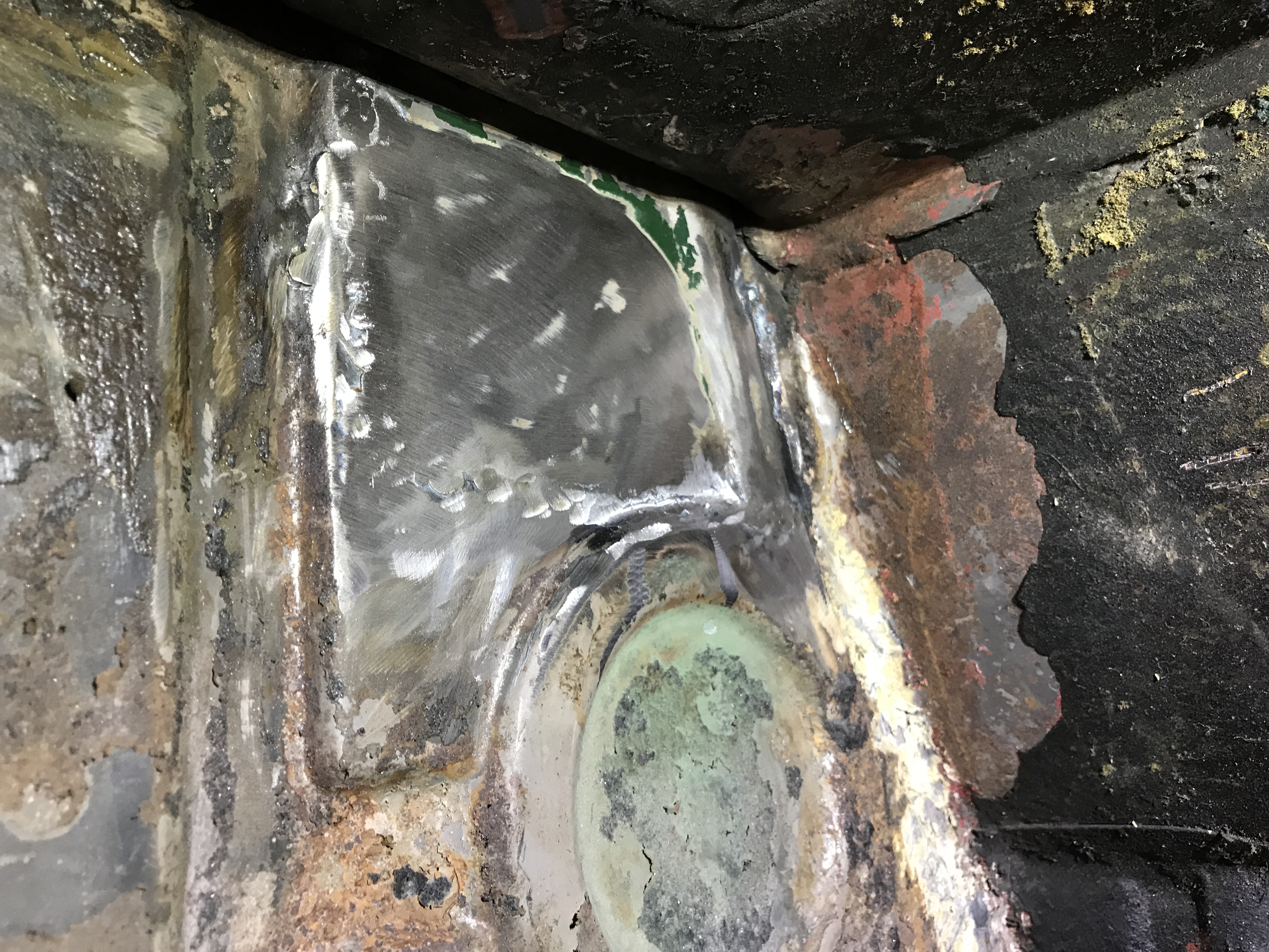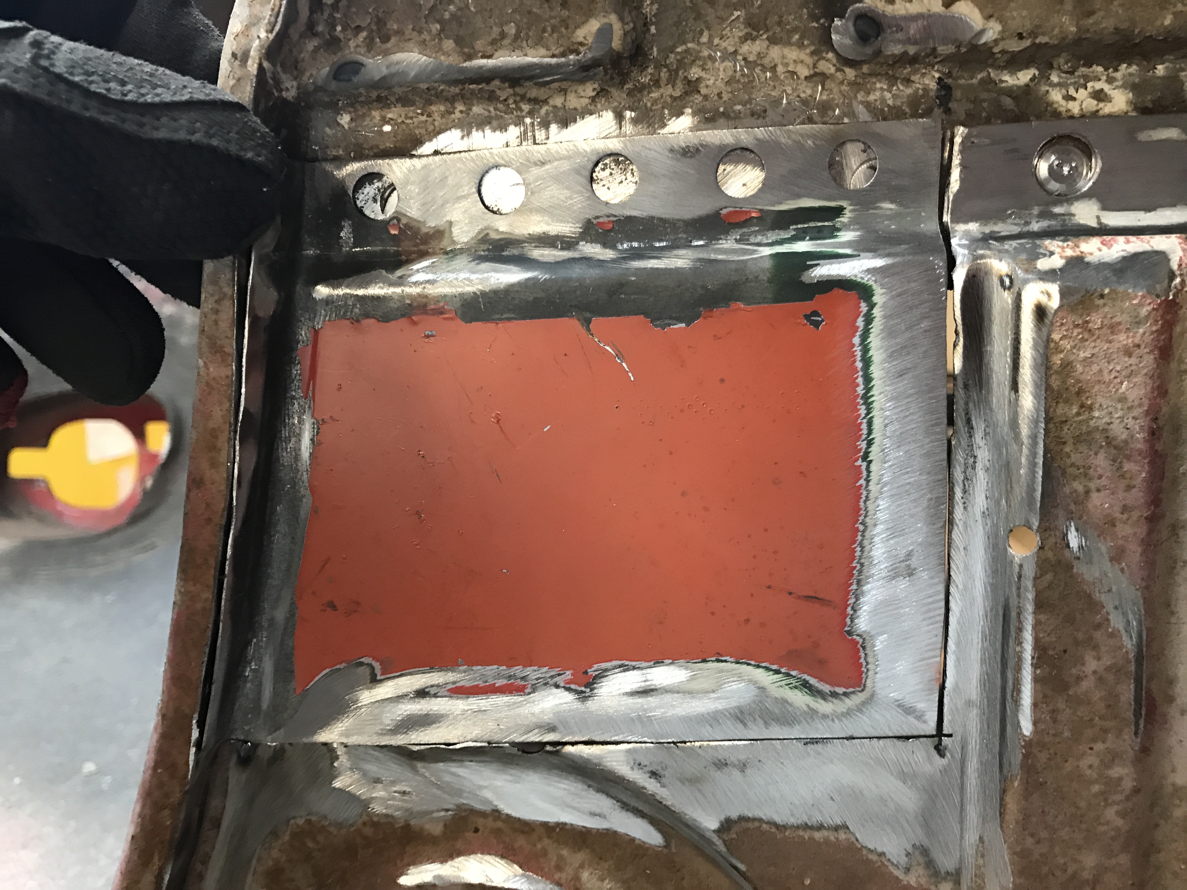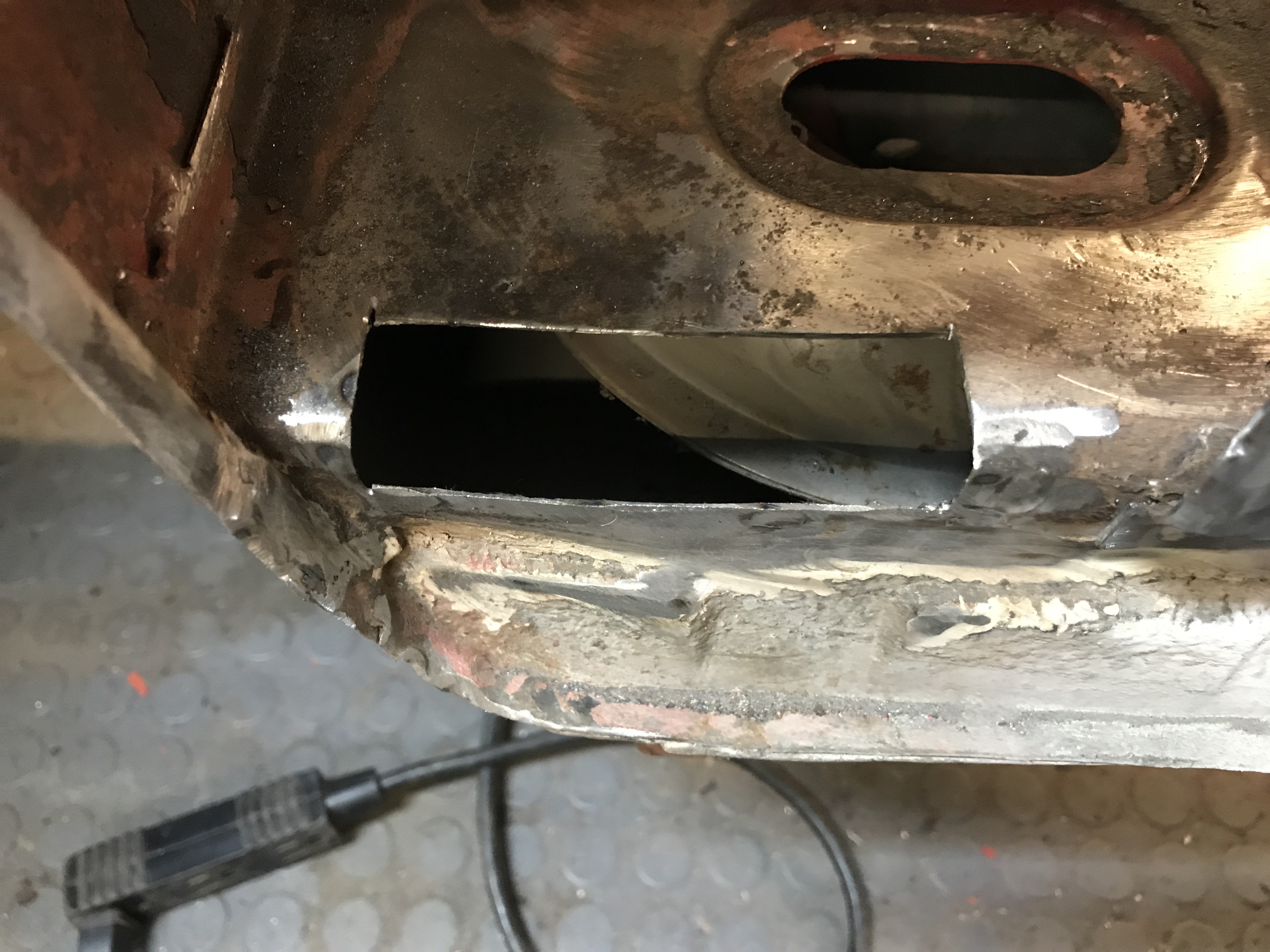 Item #3: patching the hole in the front inner right sill, where rust ate through (fortunately from outside in). Here's the hole after cutting.