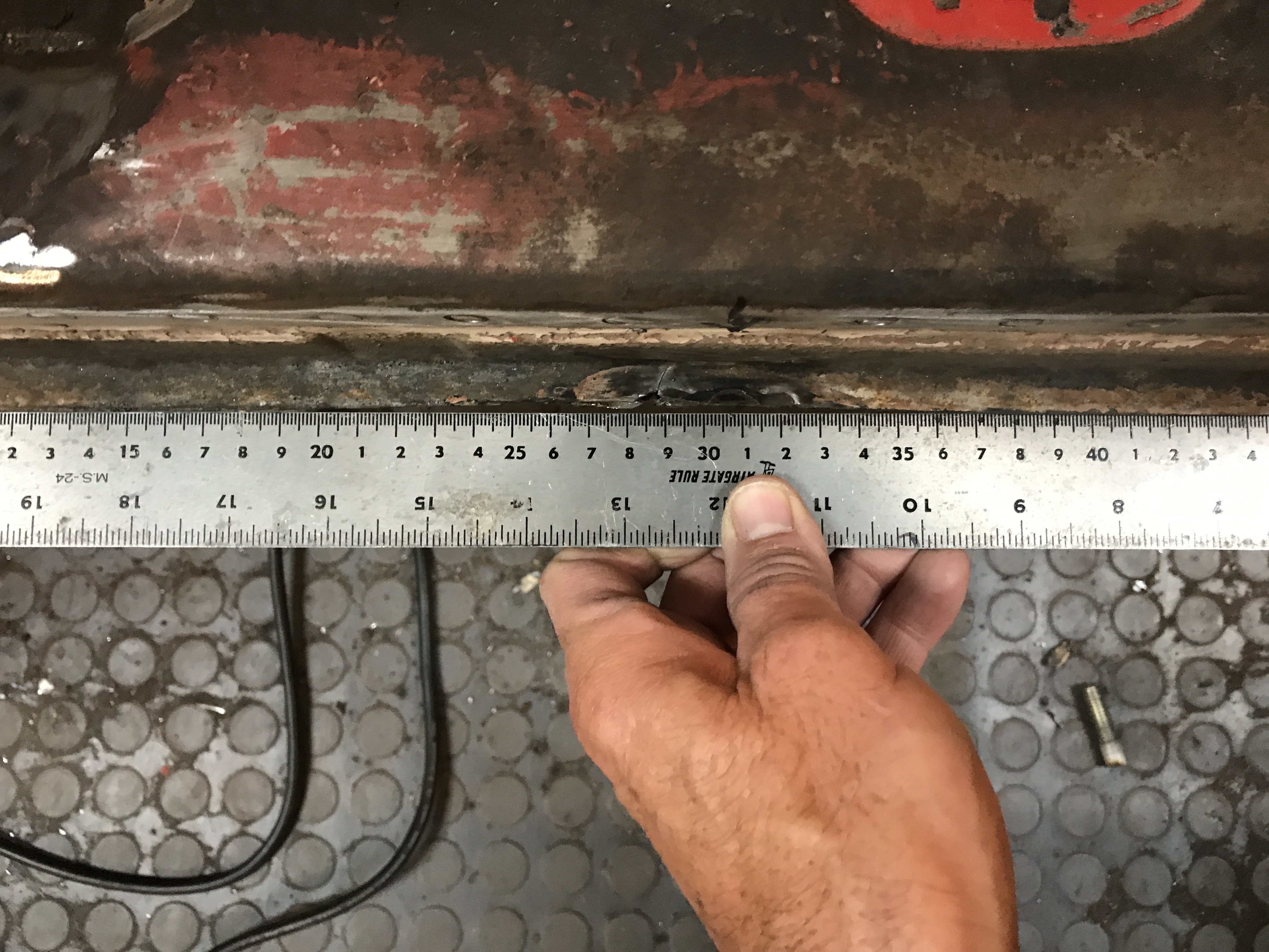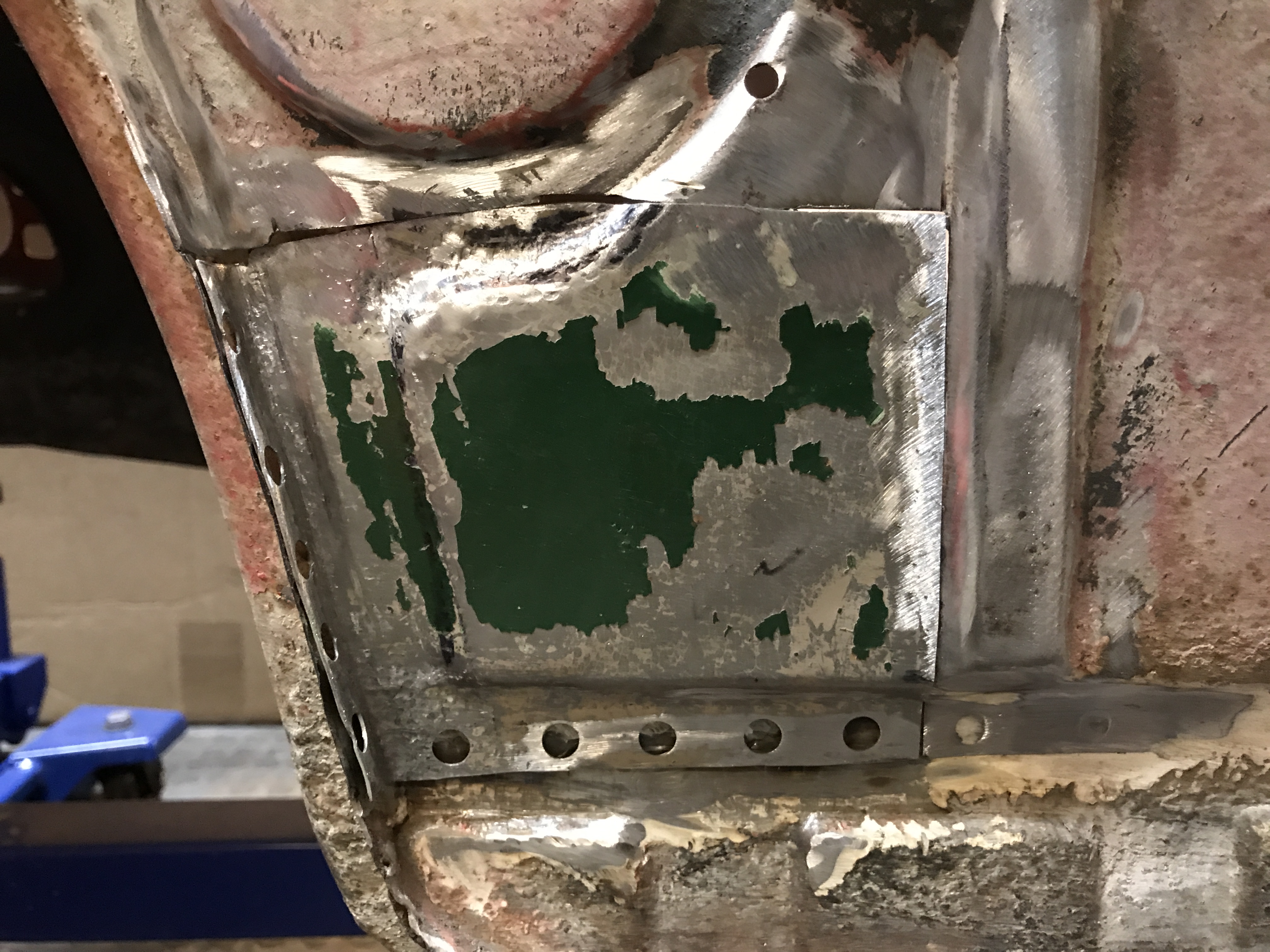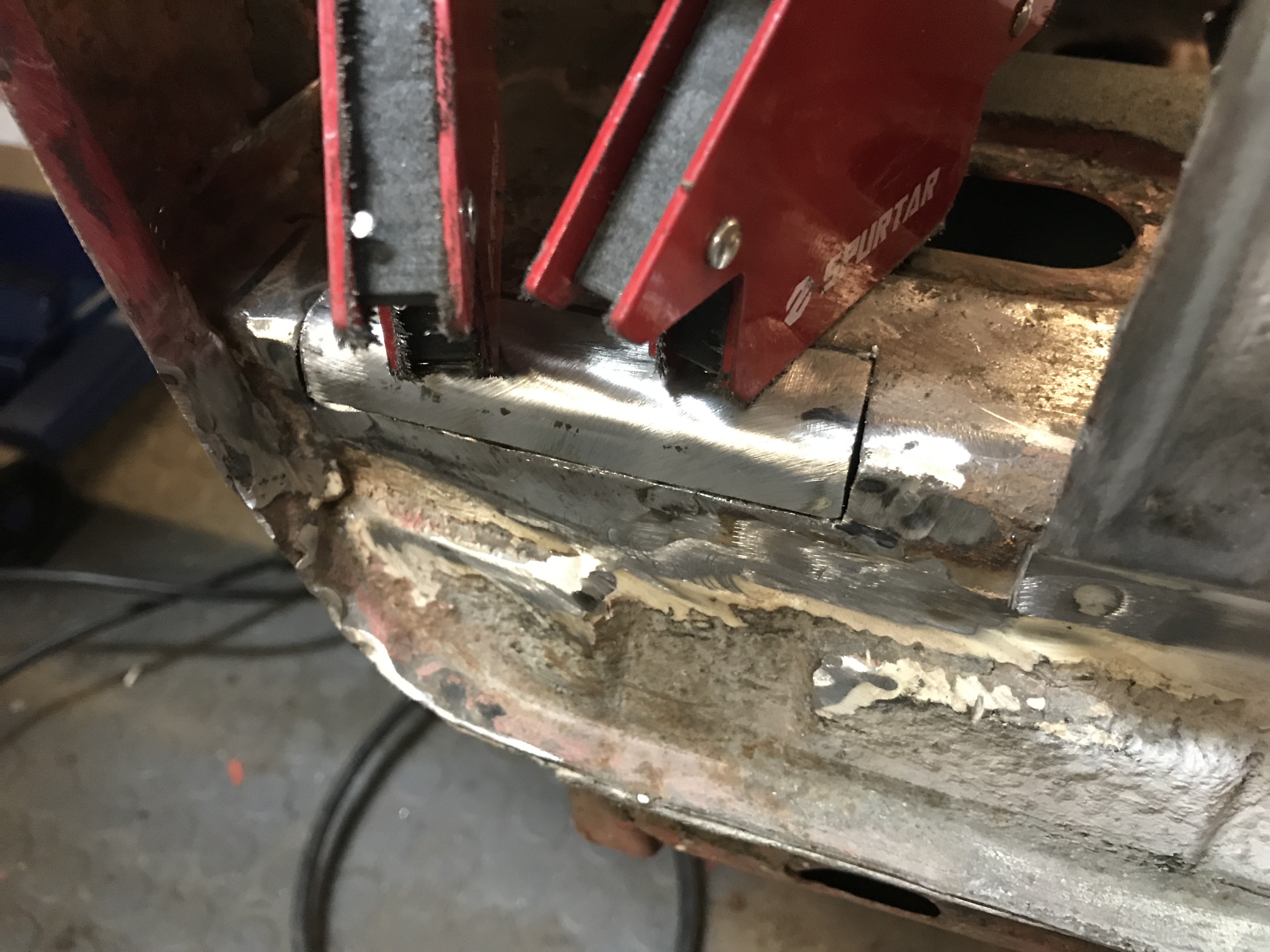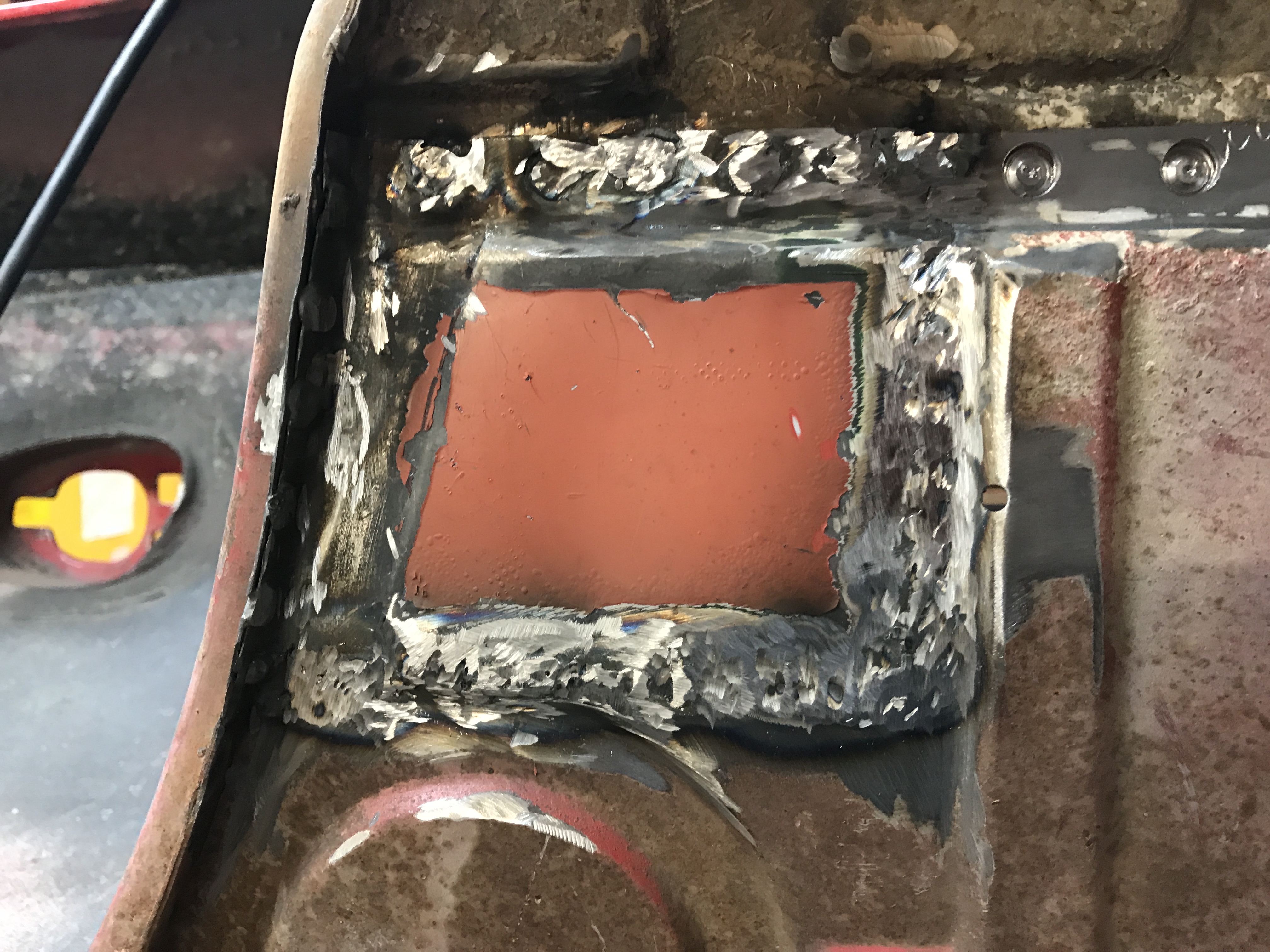 Item #3: patching the hole in the front inner right sill, where rust ate through (fortunately from outside in). Here's the hole after cutting.