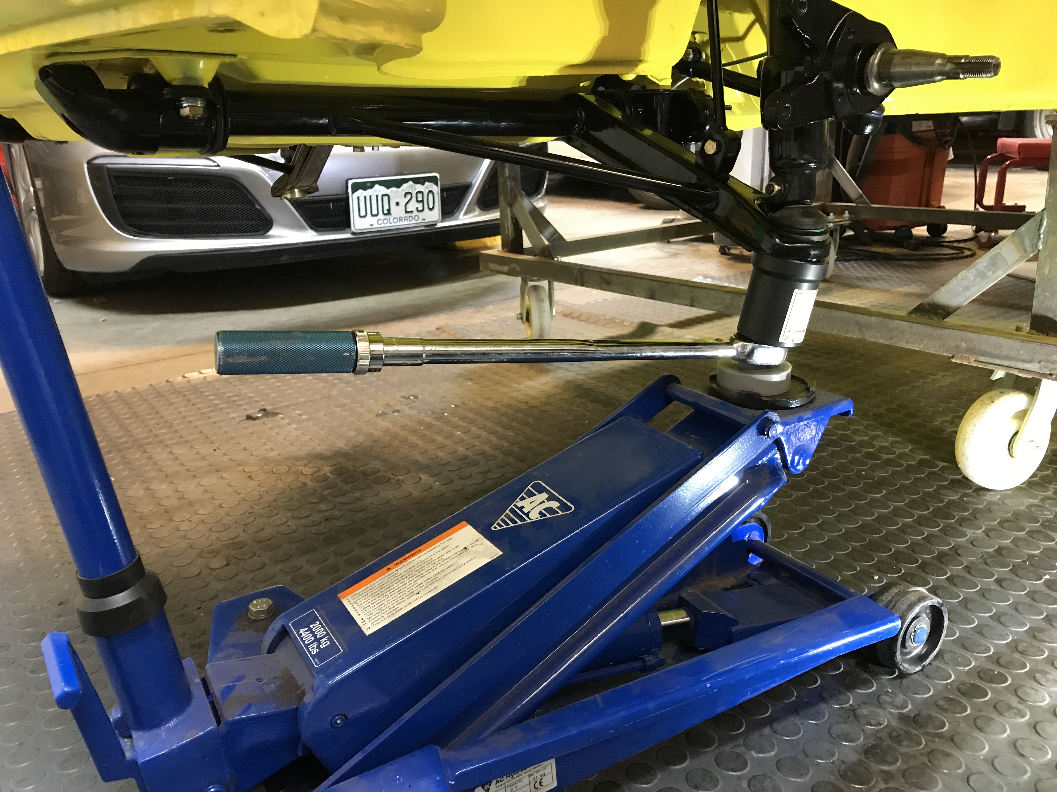 I then tried to torque the ball joint retainer rings. I used a floor jack to keep the socket from slipping, but still could not get the big torque required (25 map or 180 ft-lbs). Any suggestions?