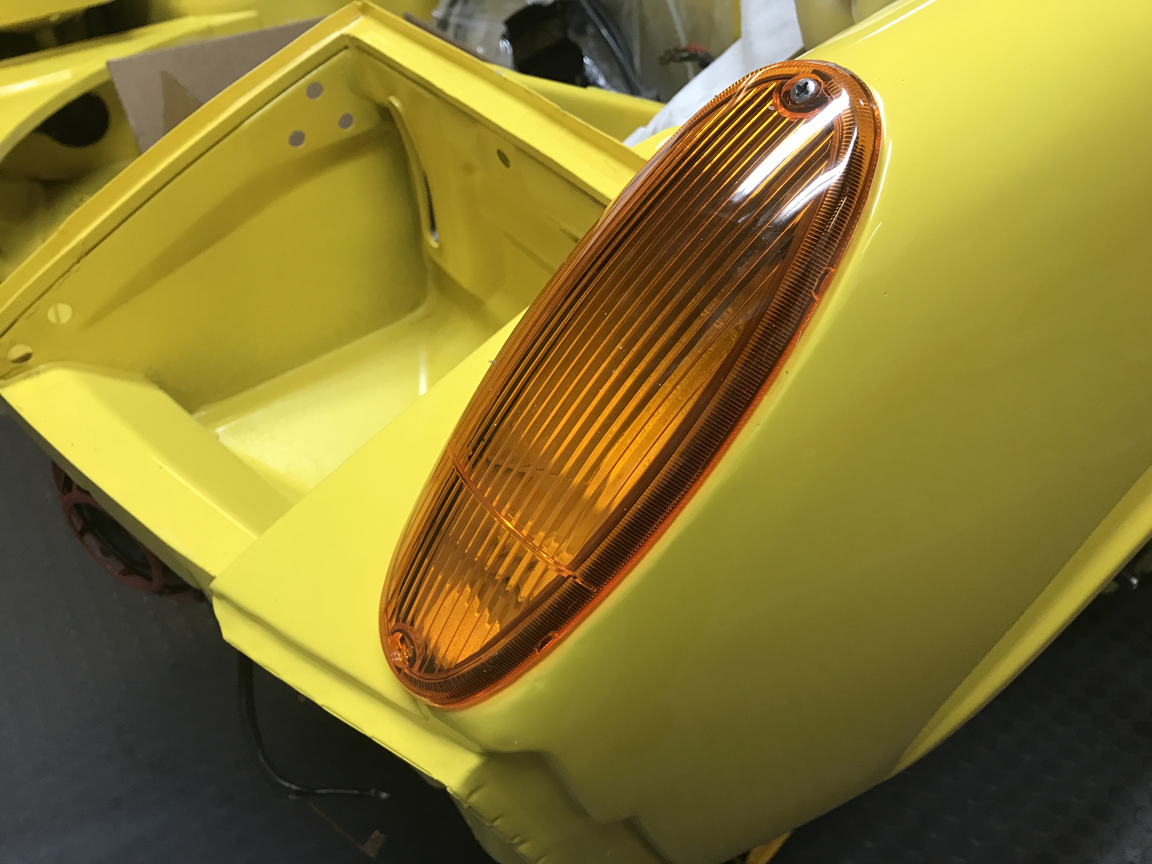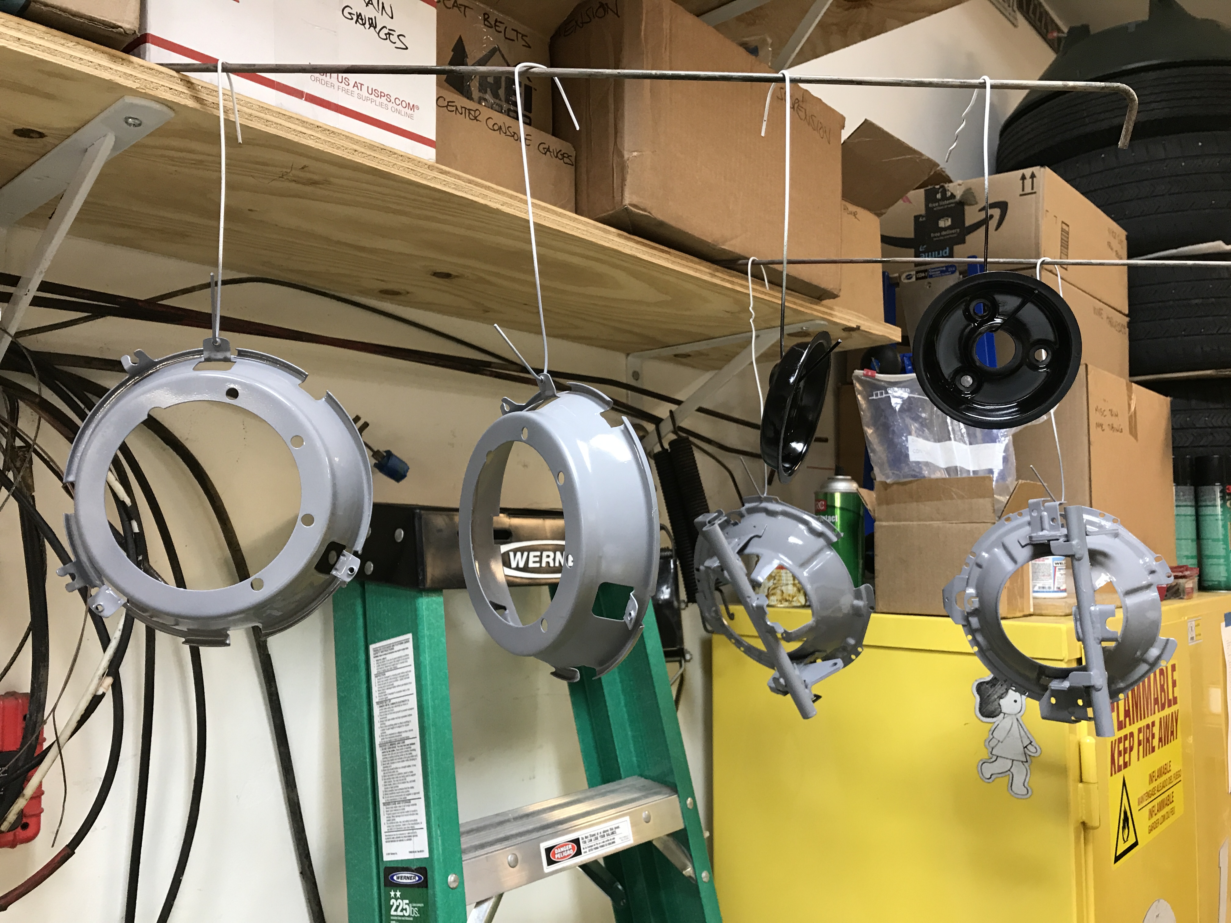 One other project started: painting the parts for the headlights. I found a semi-gloss gray Rustoleum spray that is pretty close to original, applied over self-etching primer.