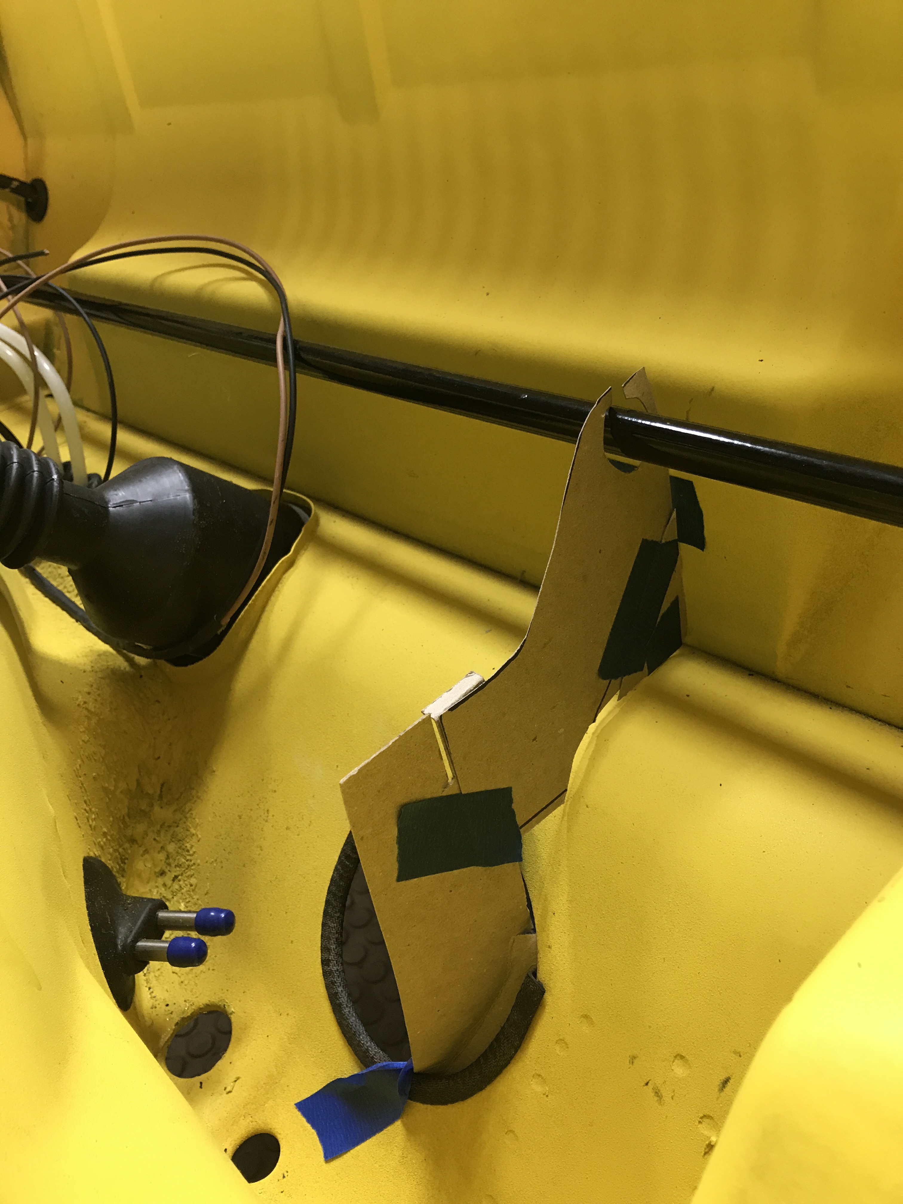 More work on mounting the fuel pump. I am still not sure where, but I favor under the tank and inside the body cavity. To check for clearance, I made a template to show the position of the bottom of the tank.