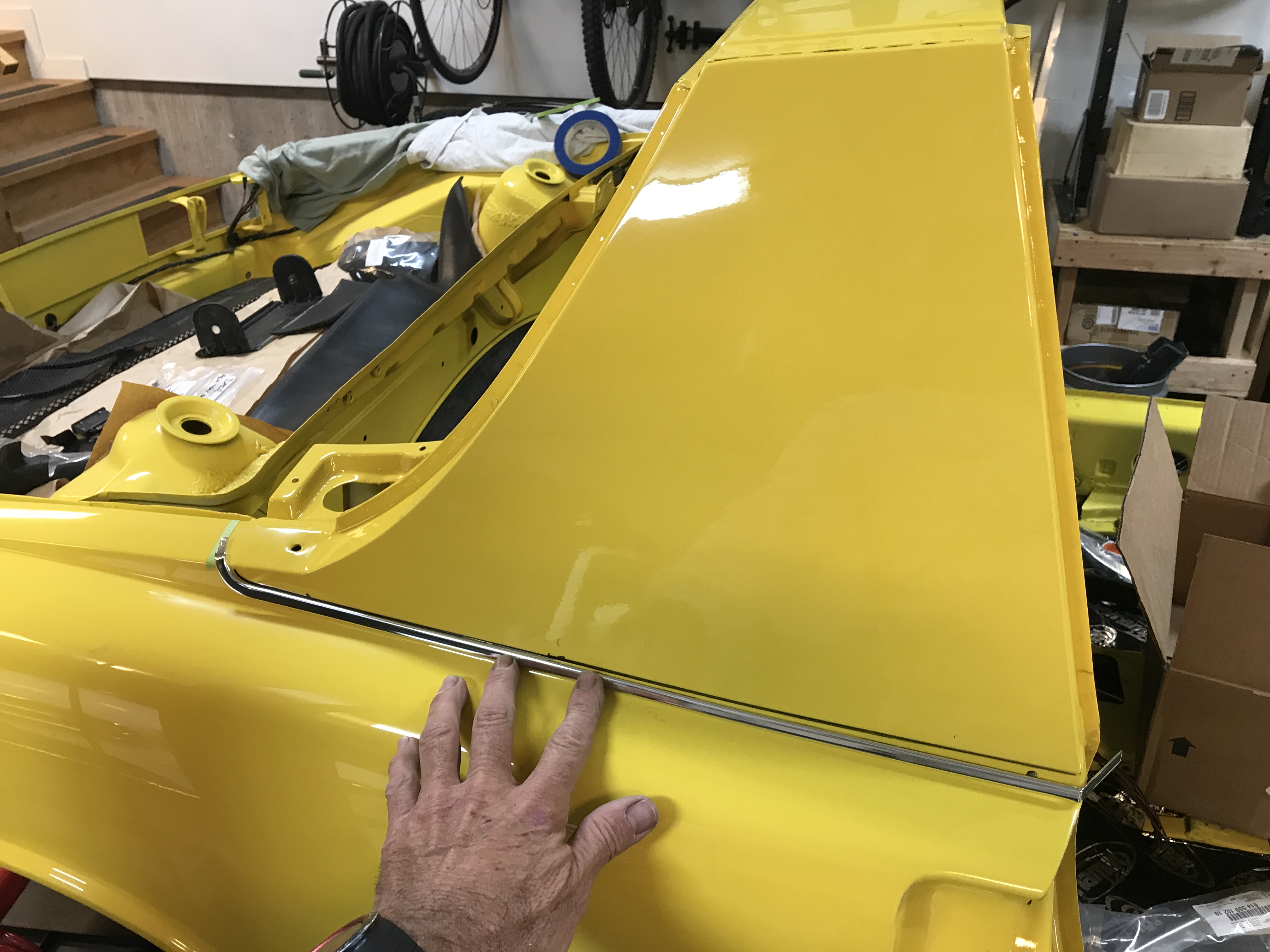 In the spirit of playing with as many different things as possible, I also pulled out the trim and vinyl for the targa hoop. This lower strip is the new Porsche part, which, like some others have mentioned, has a slightly different curve radius at the rear end. I marked the upper edge with a dry-erase marker.