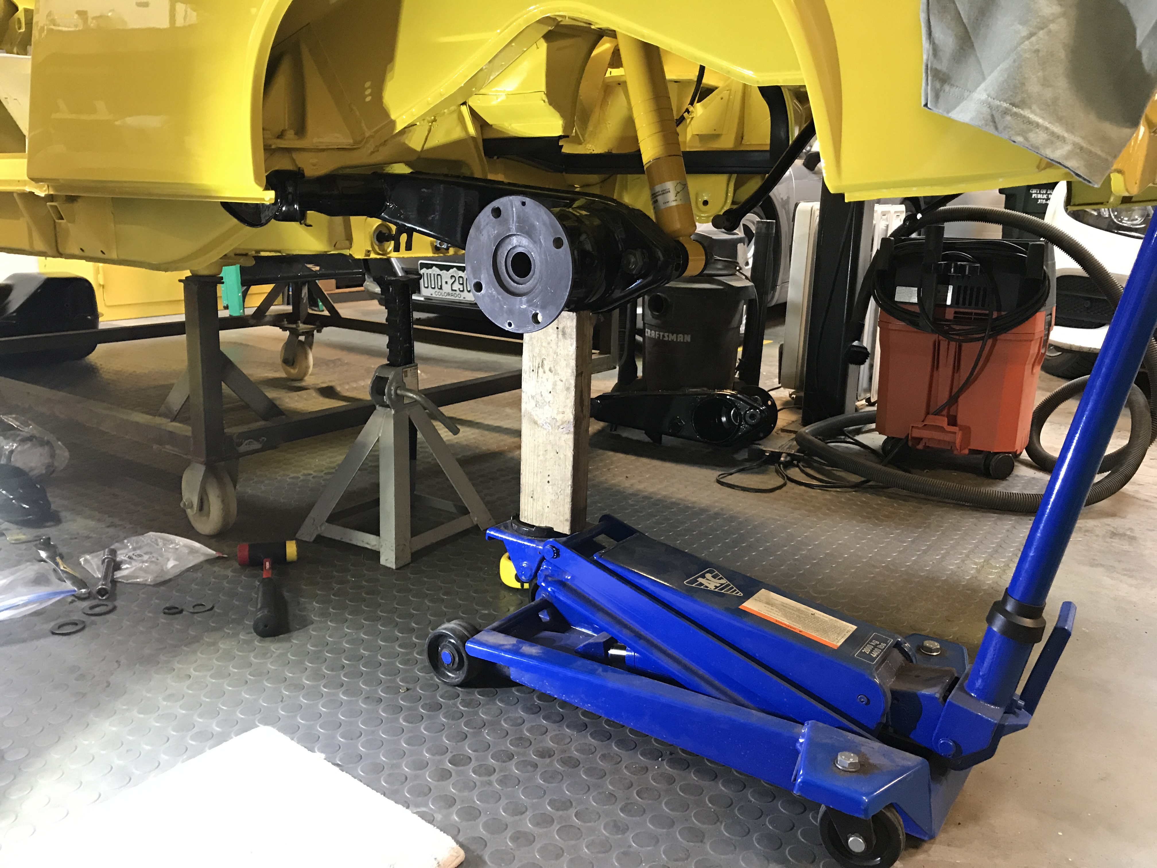 I also got parts and hardware for the rear suspension, except for the rubber bump stops. (See my other thread). So I decided to install one shock without the spring to see about dimensions and spacing for the bump stop. Since the Bilsteins are gas-charged, I used a floor jack to move the trailing arm up.