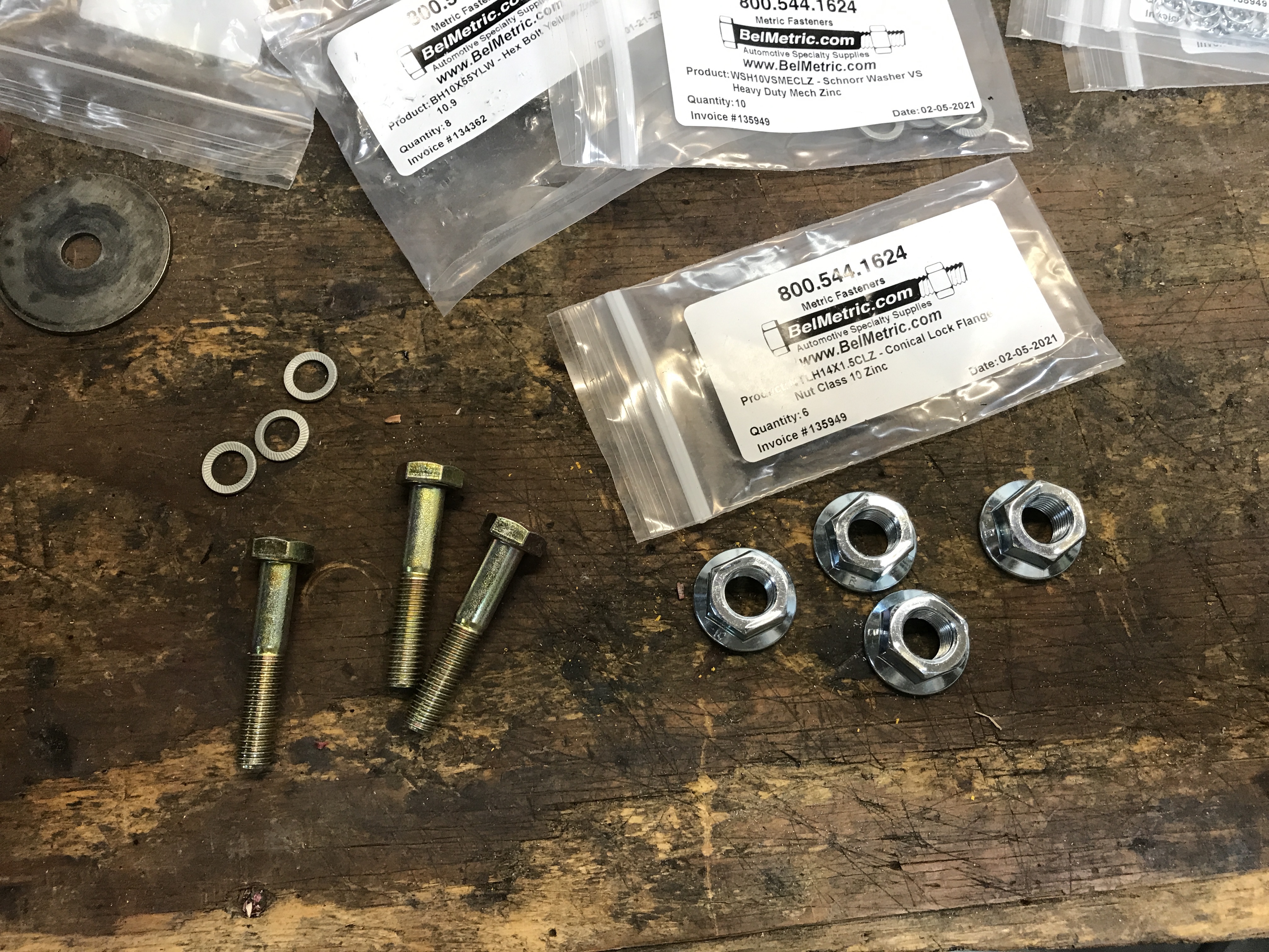 Here's the hardware I needed to complete the rear suspension installation, including new M14 lock nuts for the pivot shaft.