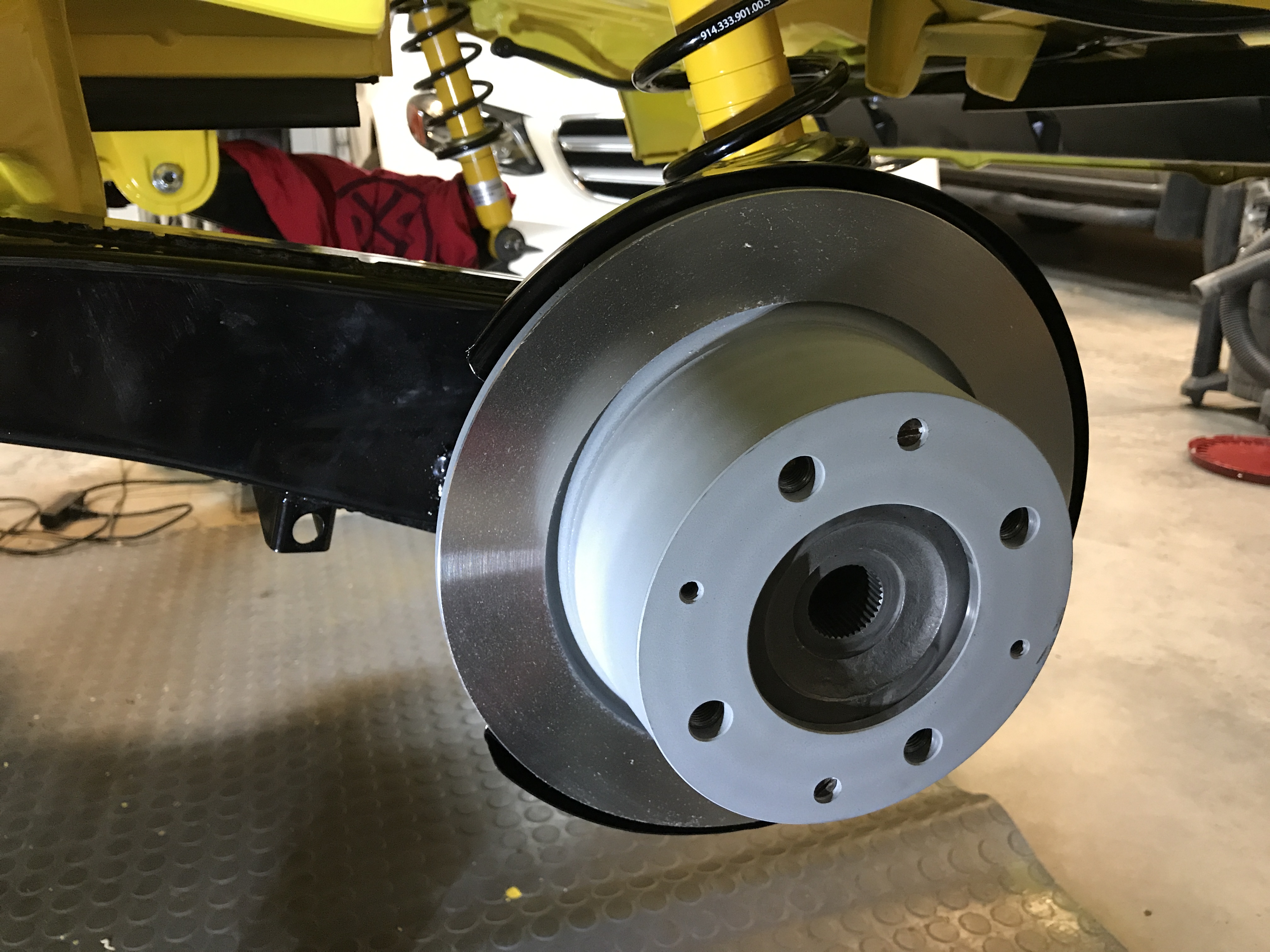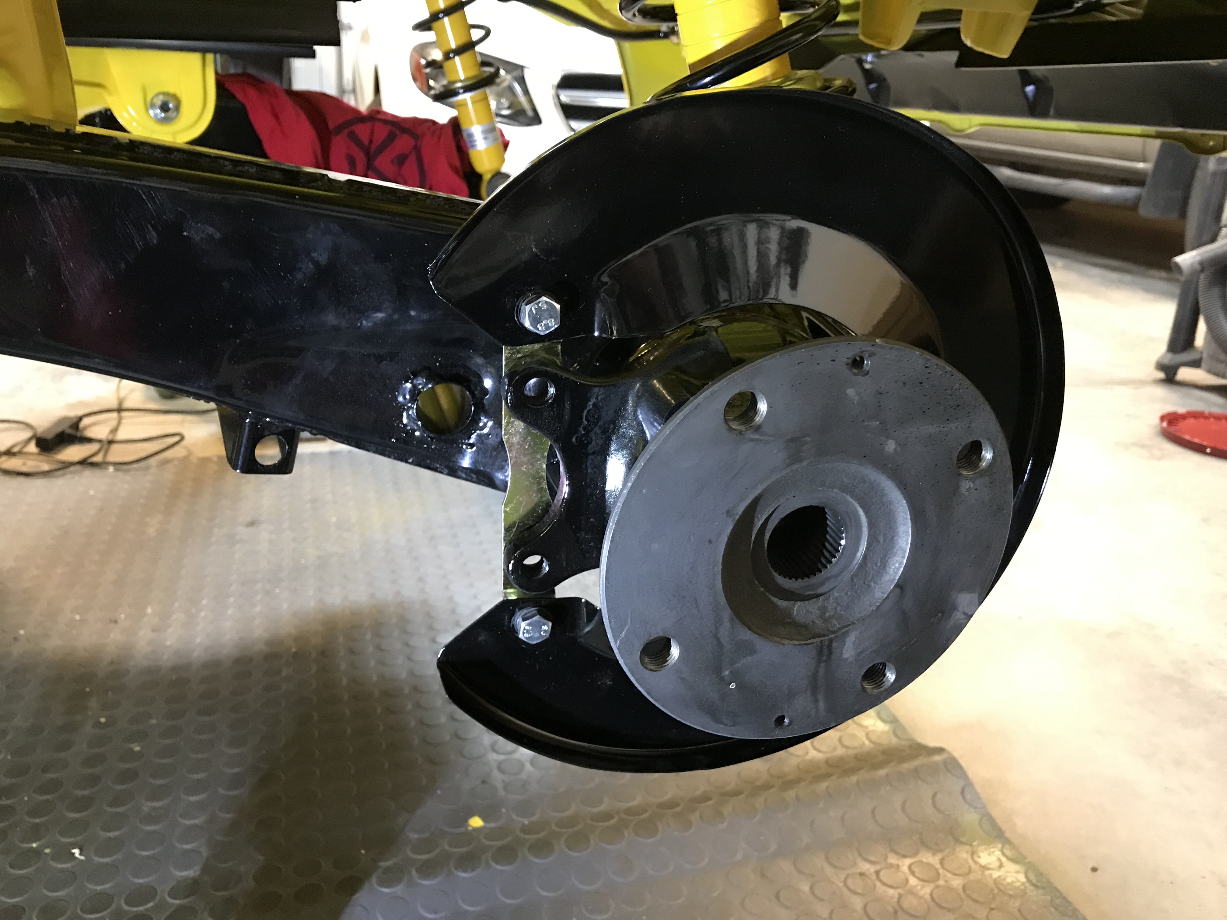 Mounted the backing plate. More new, re-plated, and powder-coated parts--shiny stuff.