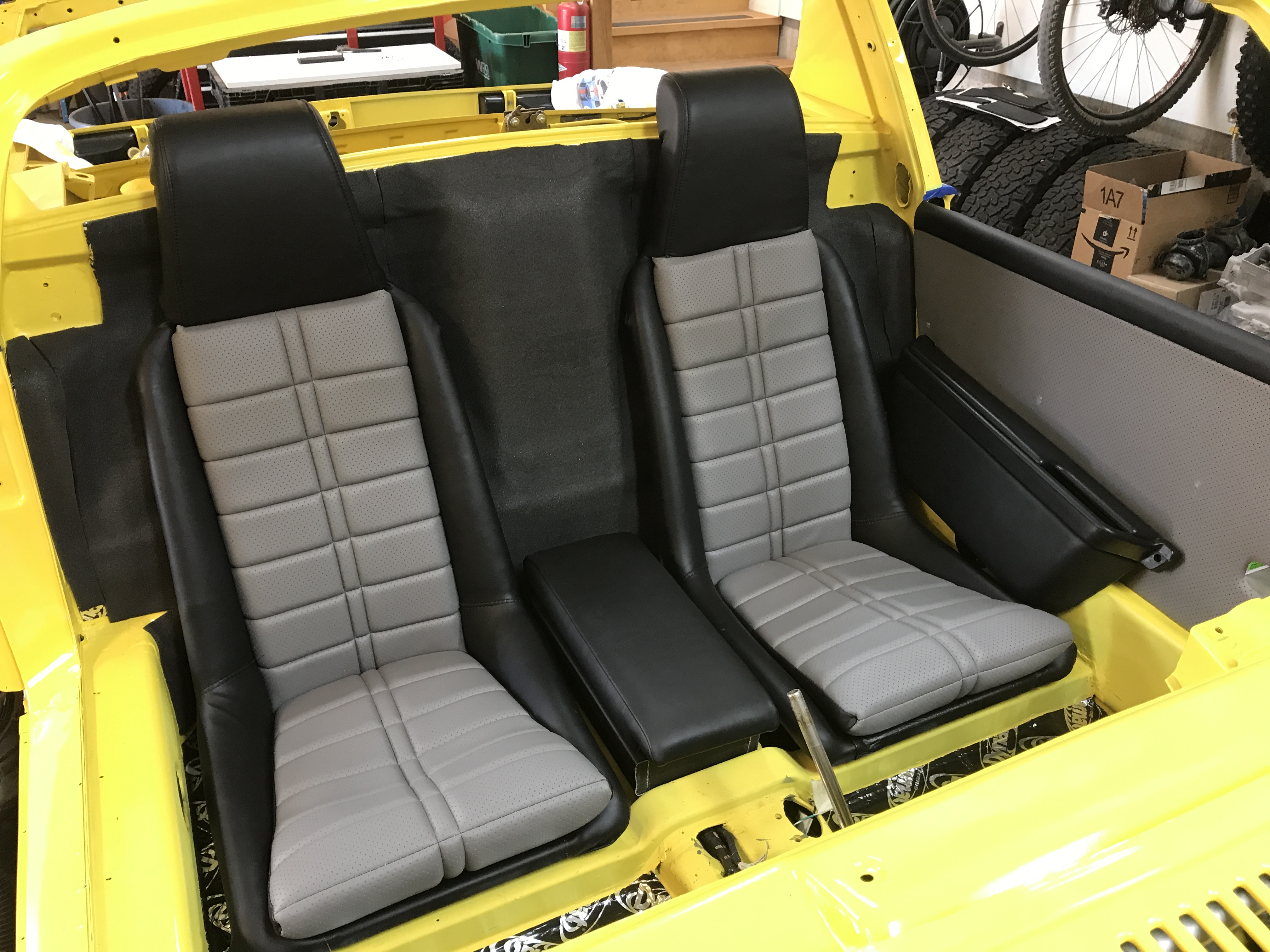 Finally home and ready to play in my garage again. Since I brought the recovered seats and interior parts home, I could not resist seeing how these look in the car.