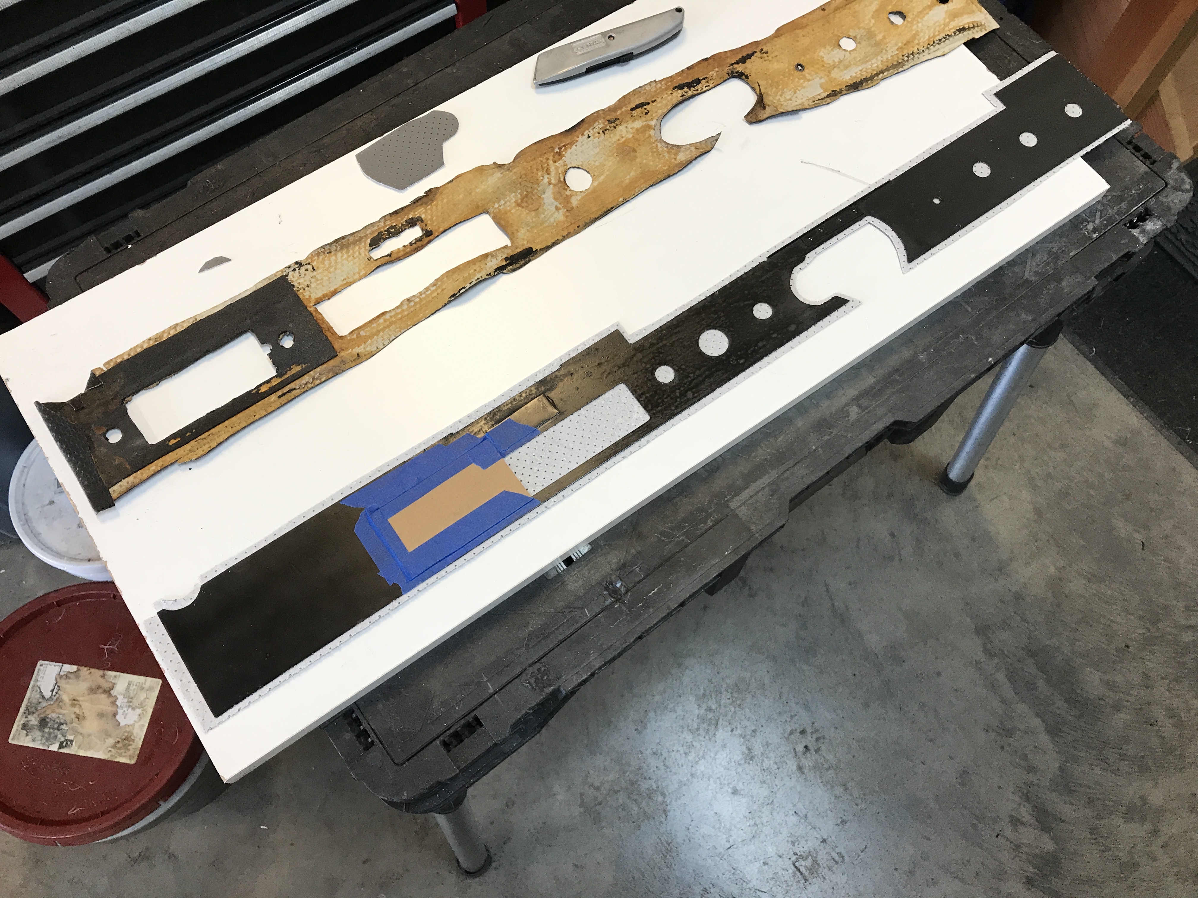 Today was my first play time with spray adhesive (DAP Landau gunk). I started with the dash center plates, which I covered with the same vinyl on my seats and door cards.