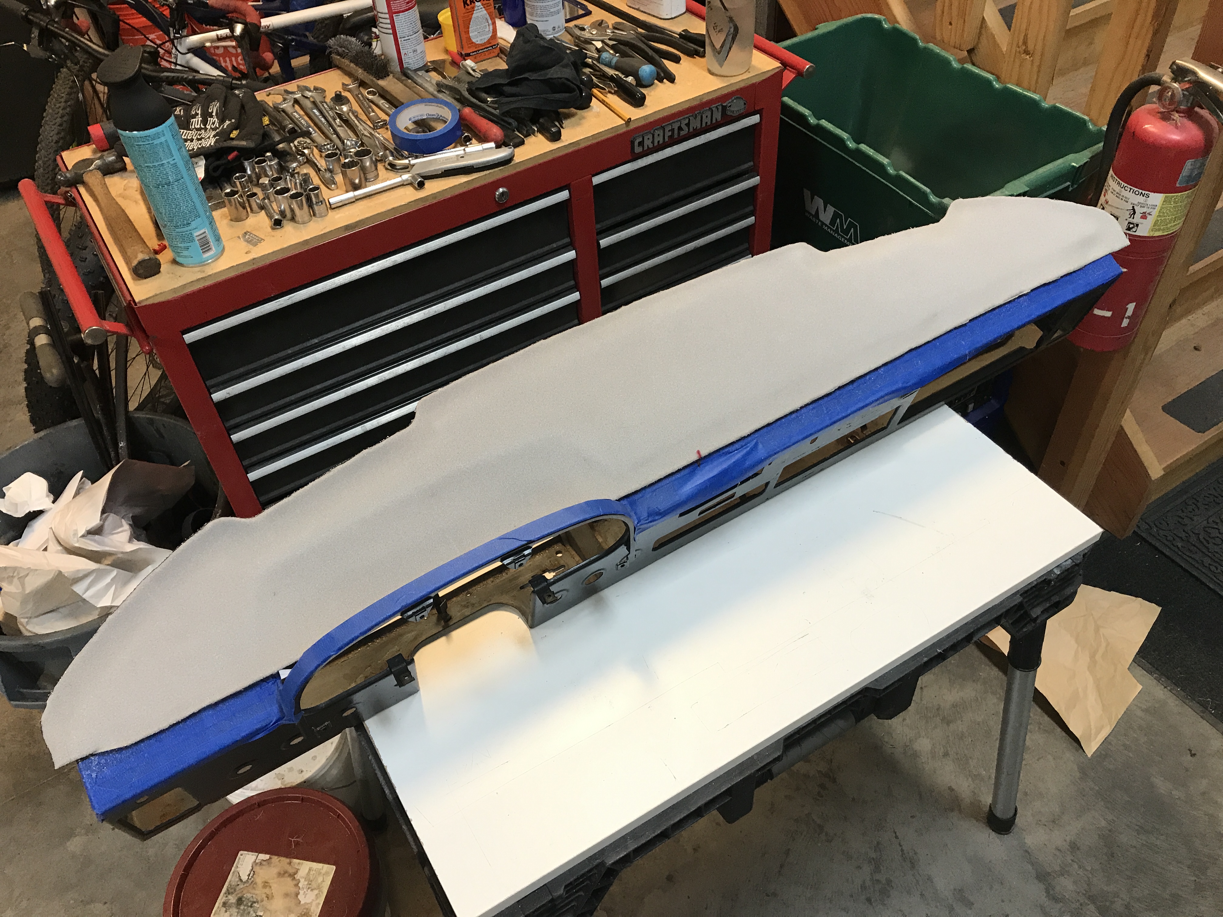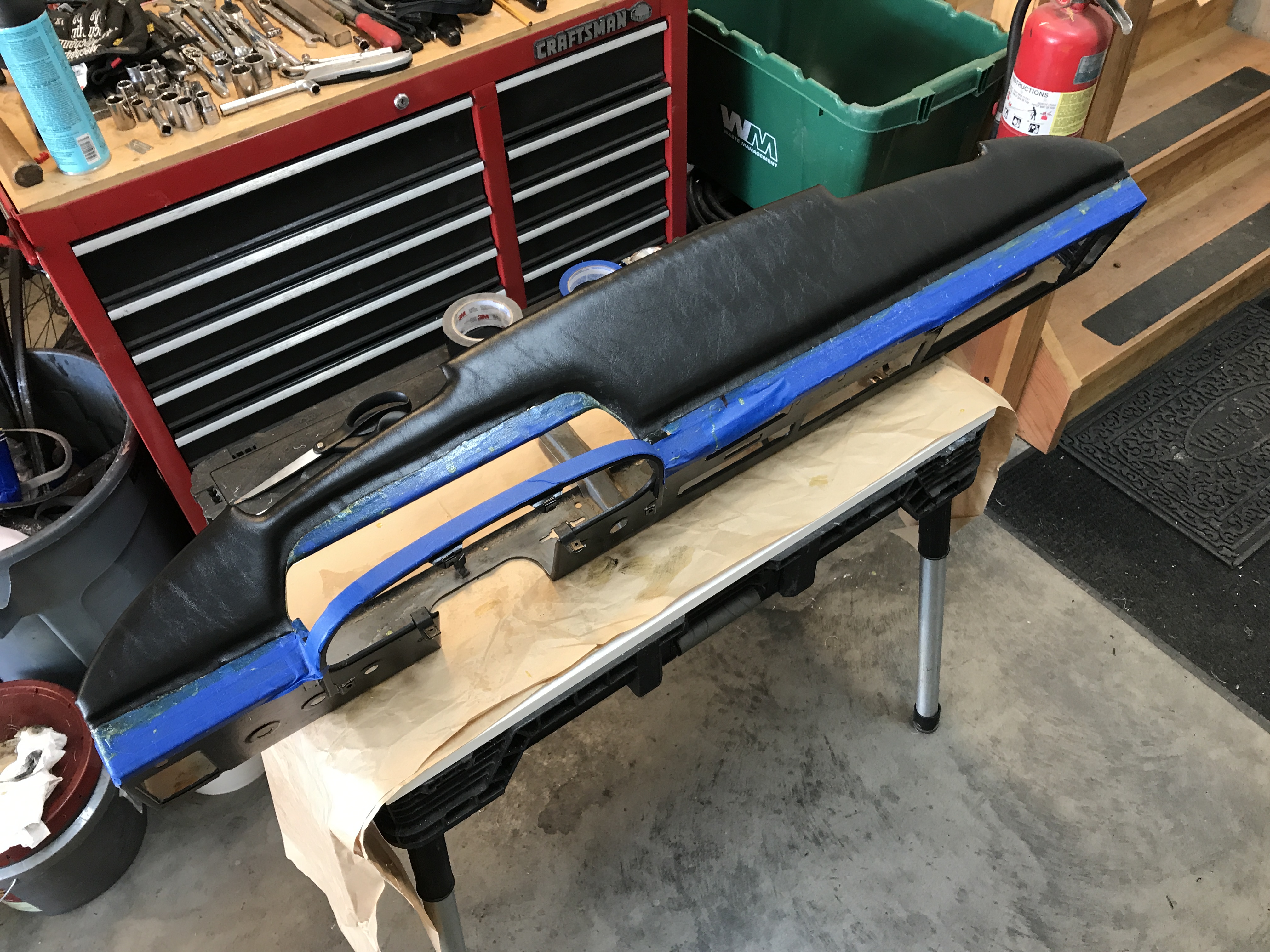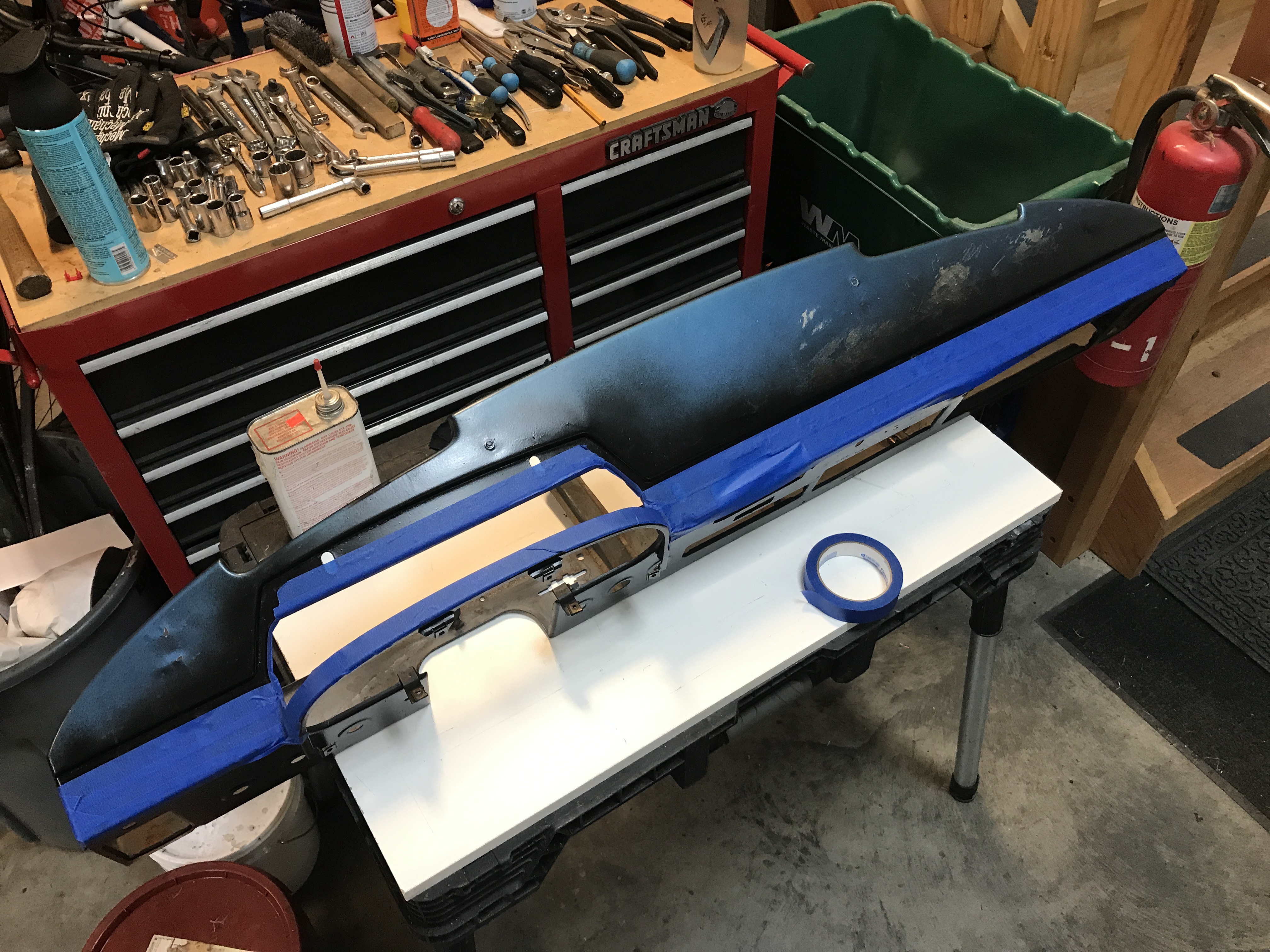 Speaking of the interior, I made some progress towards that today and tackled the dash top. I masked off the new paint near the areas to get adhesive. More to come about the paint and adhesive...