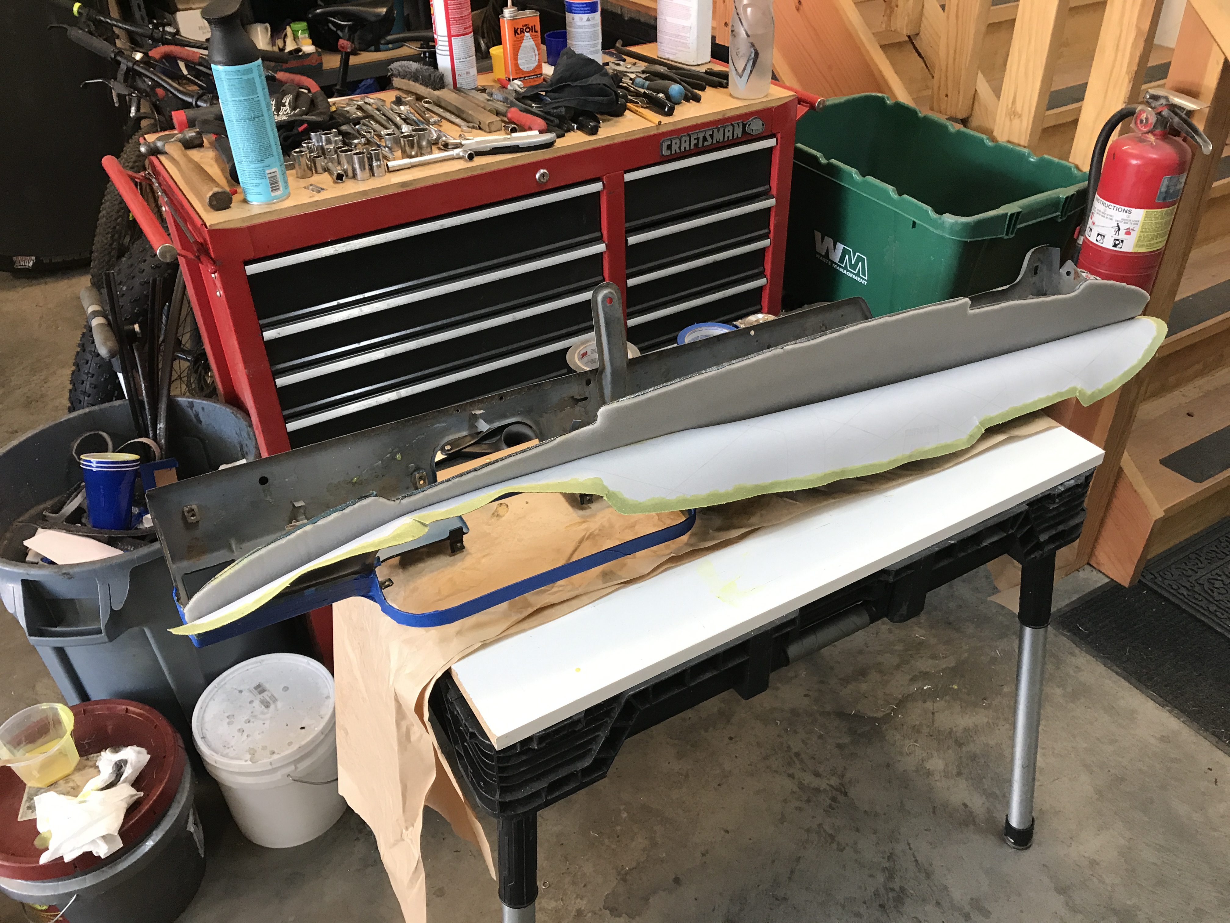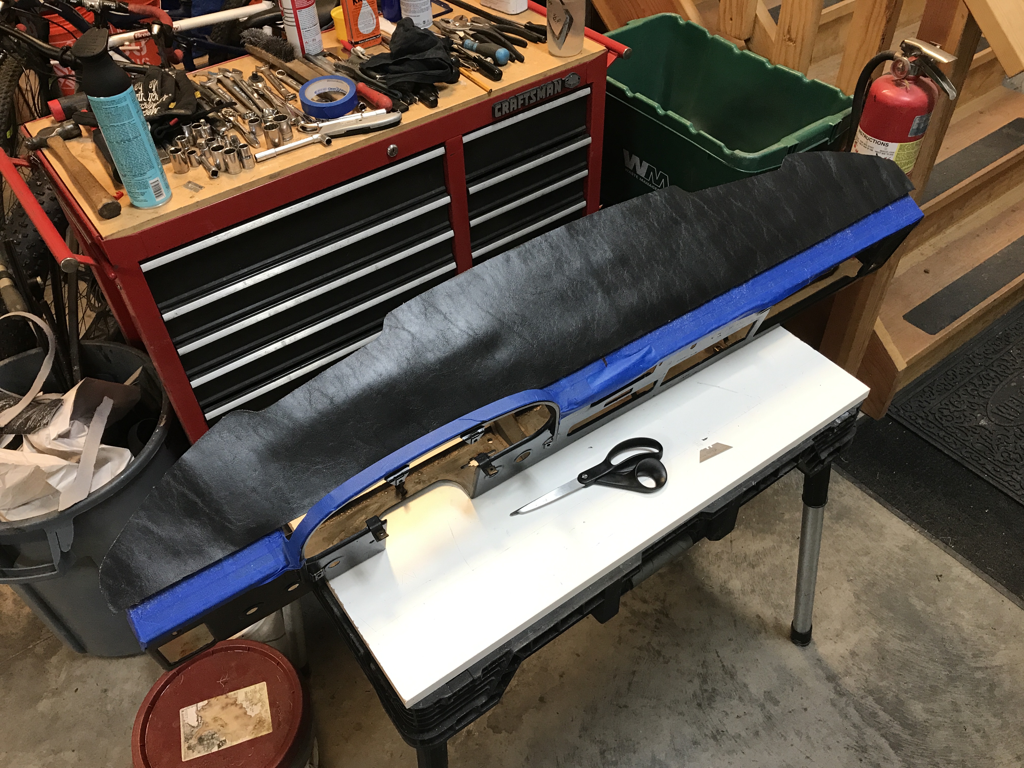 Then I first glued along the inside edge, about 1/2 inch below the raised area (and foam padding). Sorry, no picture. I brushed adhesive onto the dash and the edge of the vinyl. On the first attempt, I realized the adhesive solvent was lifting the black paint (Rustoleum semi-gloss rattle can). I had to clean that up with acetone, and apply another coat of adhesive. Attached thumbnail(s) |