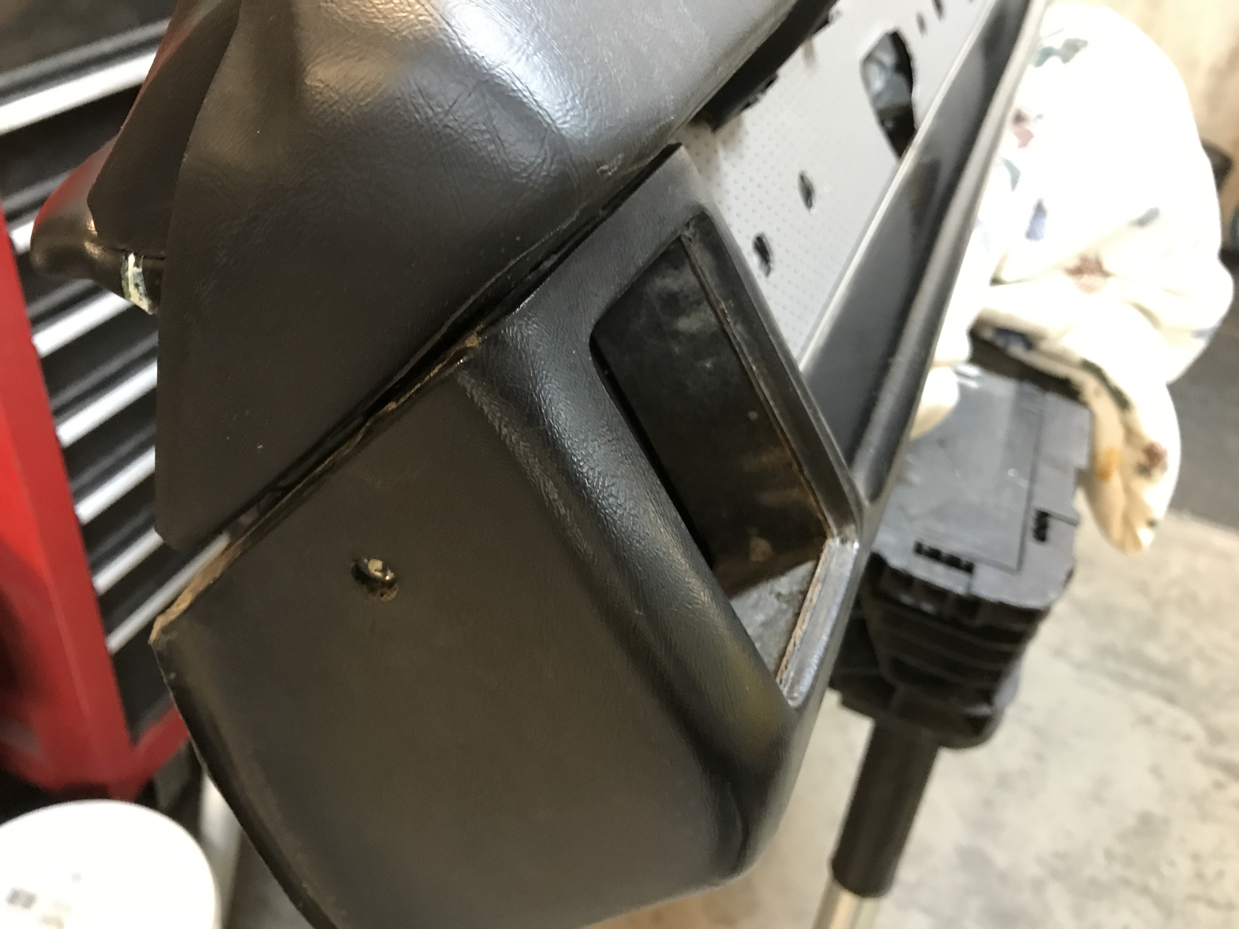 After I mounted the front plate to the dash frame, I cut out all the holes in the dash face, without thinking. On my car, switches fill the 3 holes left of the steering wheel, and the cigarette lighter goes in the big hole on the right. But now I have 2 extra holes!
