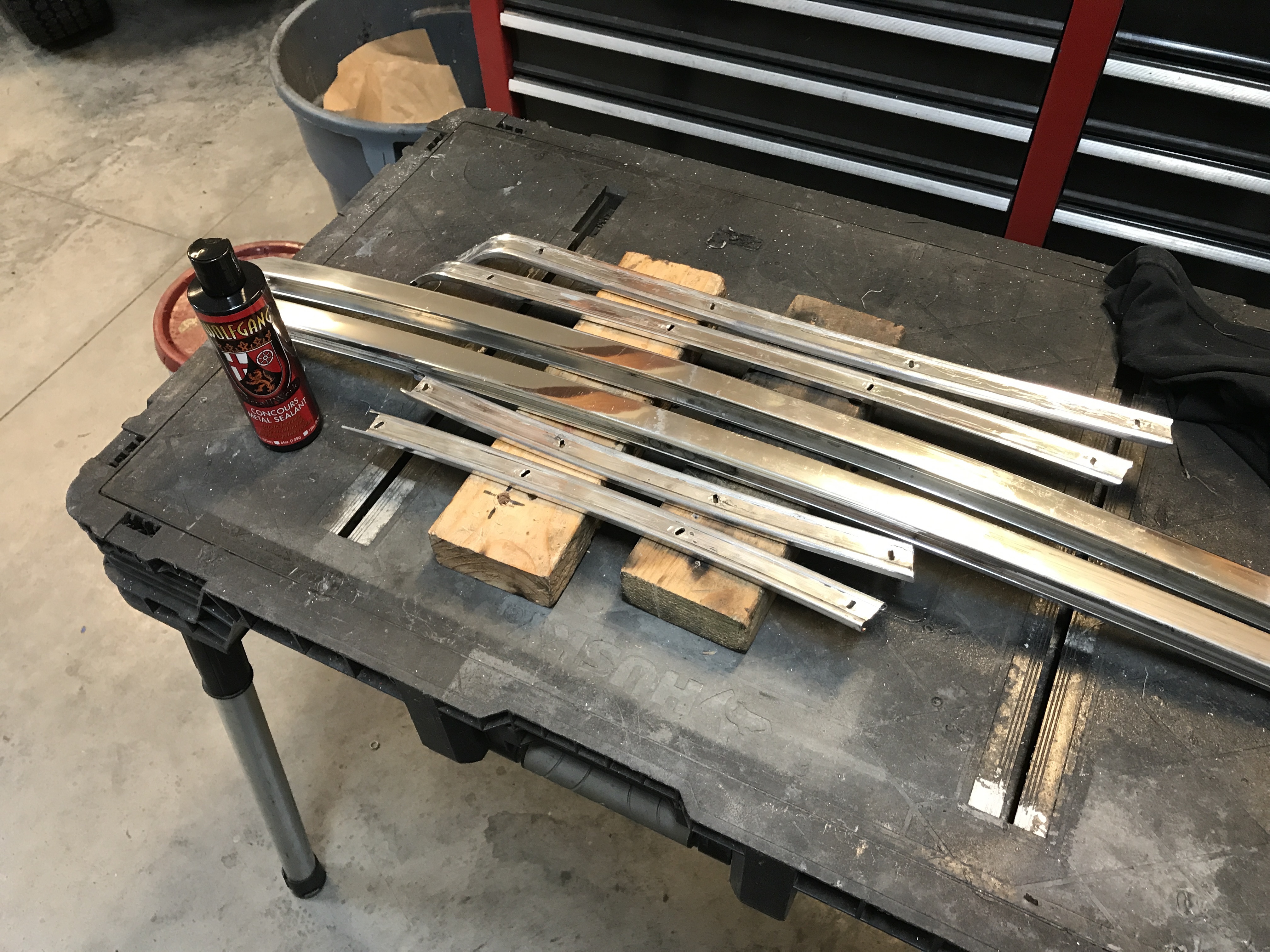 While I think about what to do with the dash, I got going on the targa hoop vinyl and trim. A couple of weeks ago, I polished some aluminum trim, including the pieces that mount along the window sides of the sails. But I left the metal unprotected. Rather than clear coat, I decided to try a metal polish.