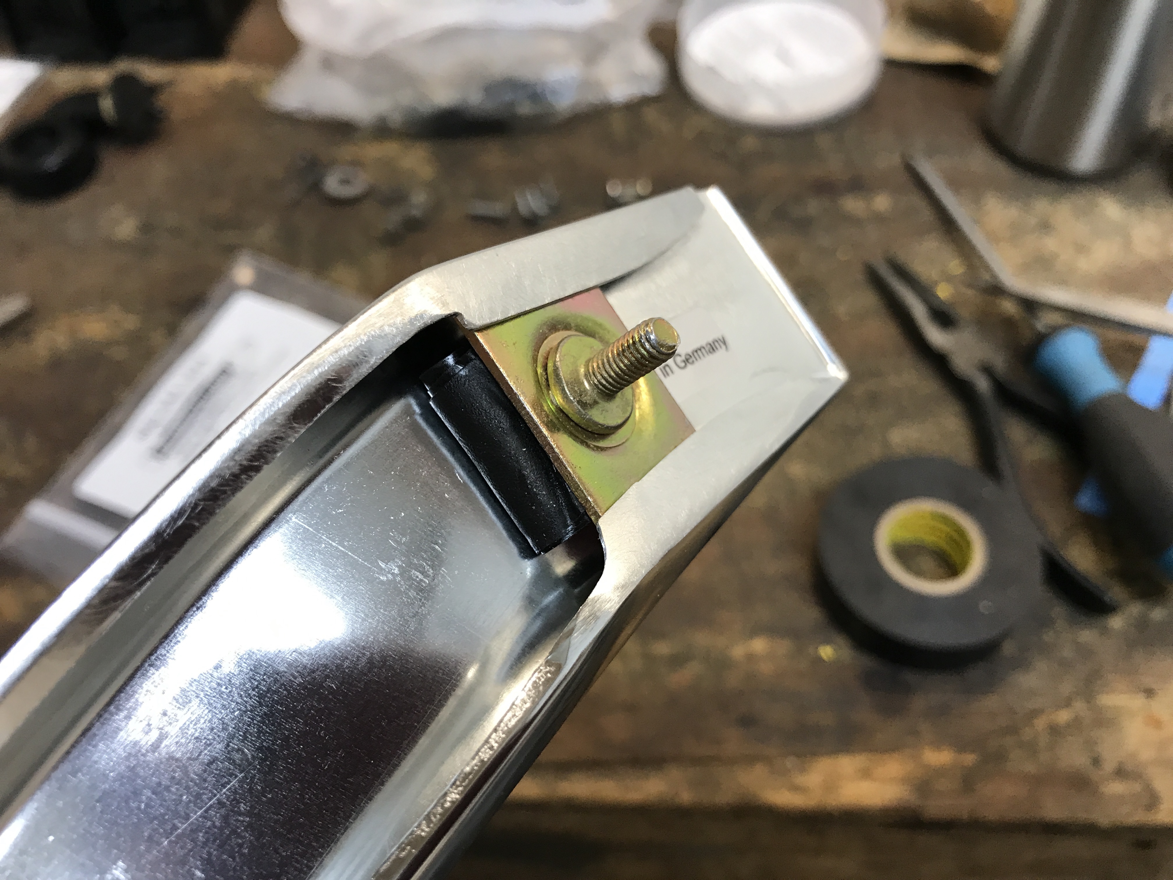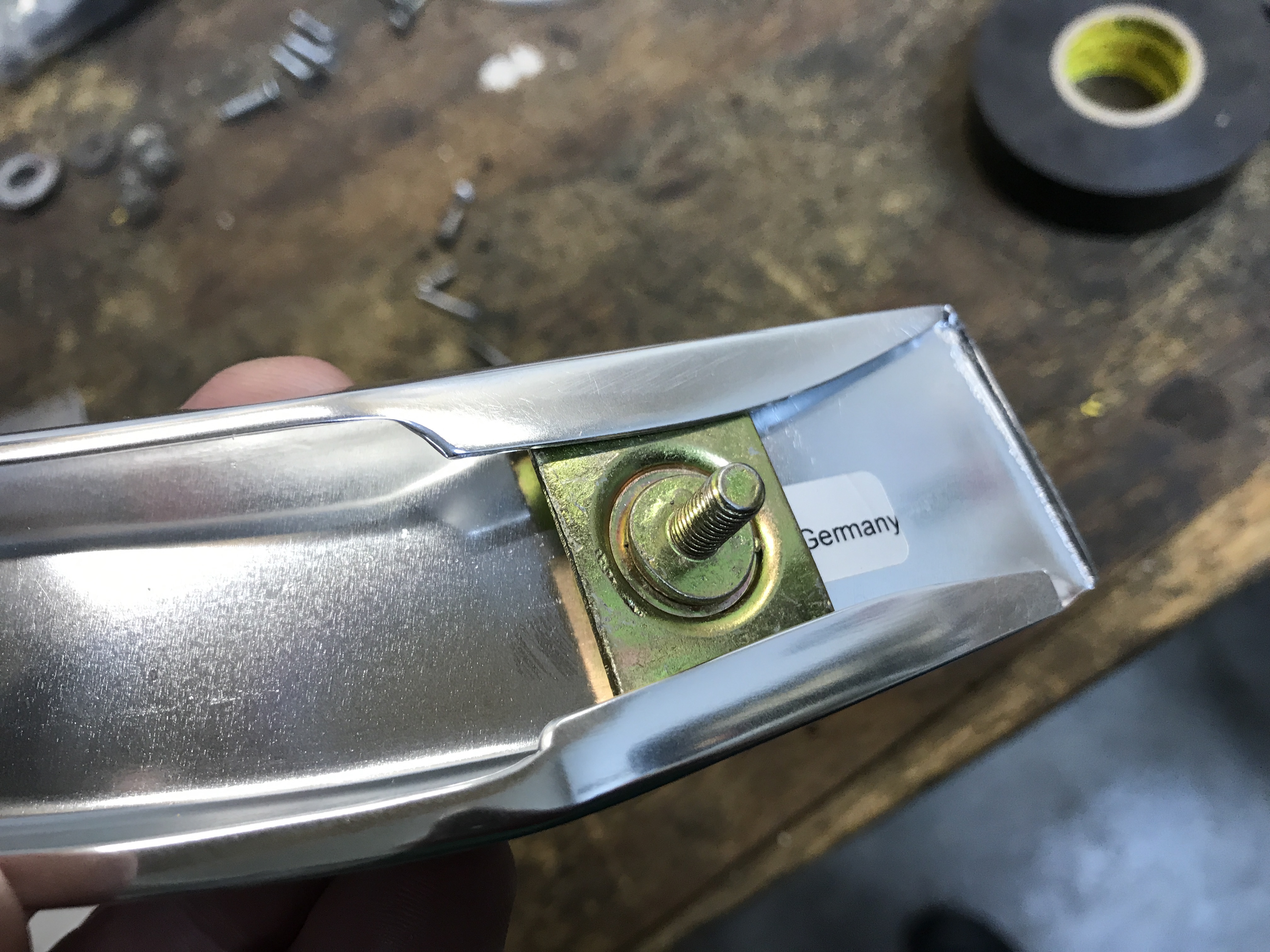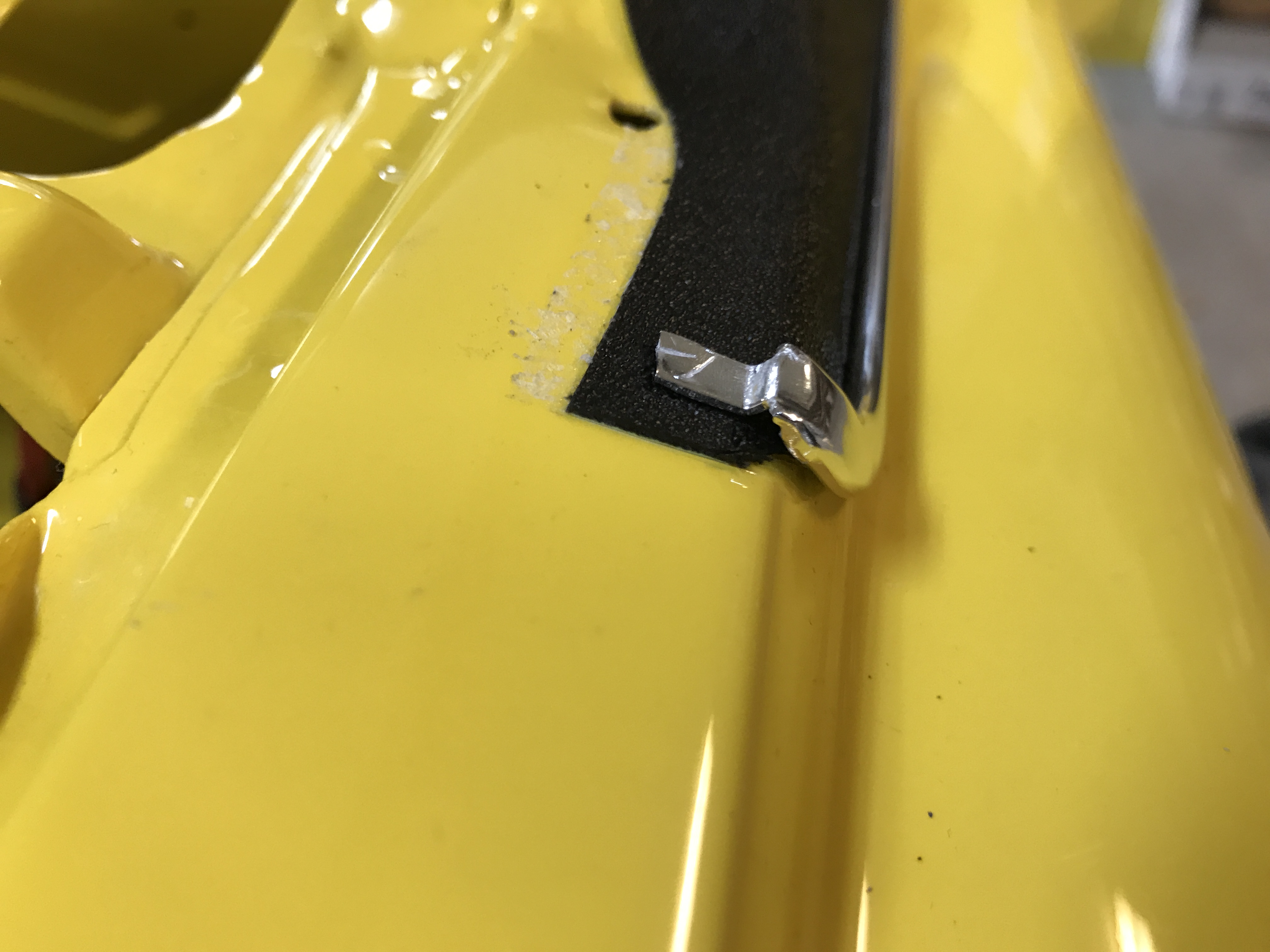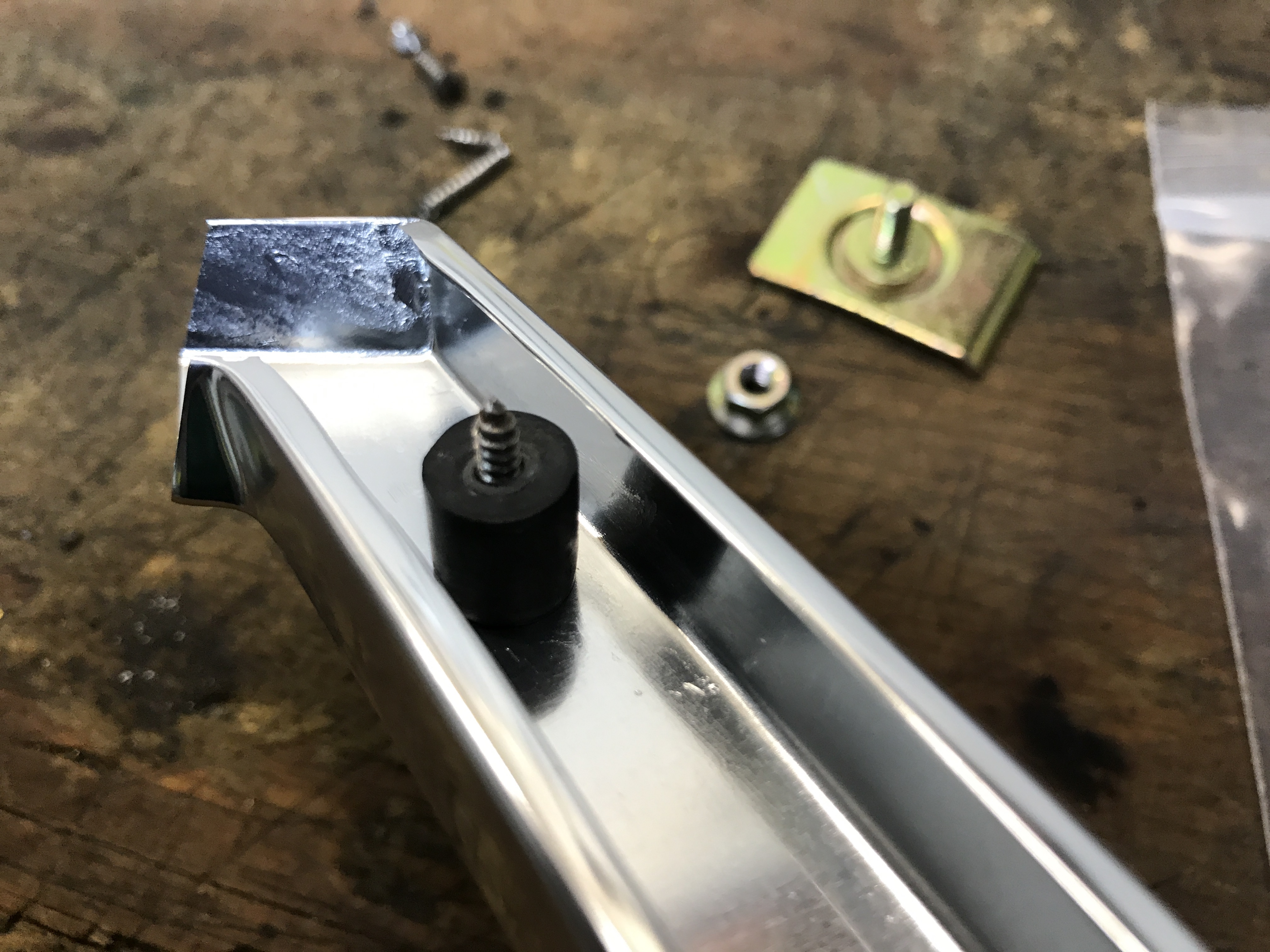 Here's the trailing edge retaining clip, slid into the trim. But the fit is sloppy, so when I tried to get the nut started inside the fender, the protruding bolt vanished into the hole.