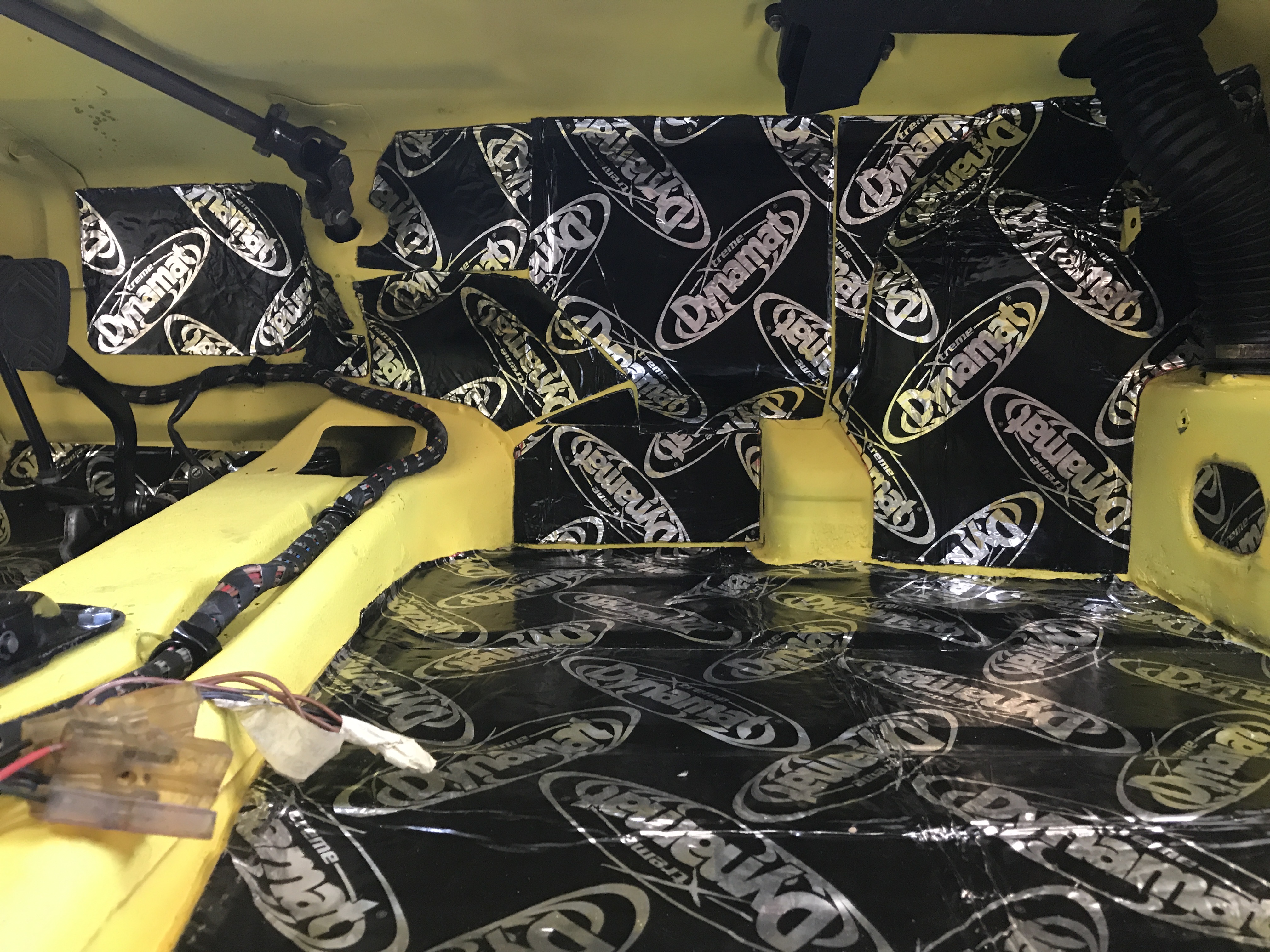 I found my left-over Dynamat, and decided to use some scraps on the bulkhead under the dash, since the relocated fuel pump is on the other side of this sheet metal.