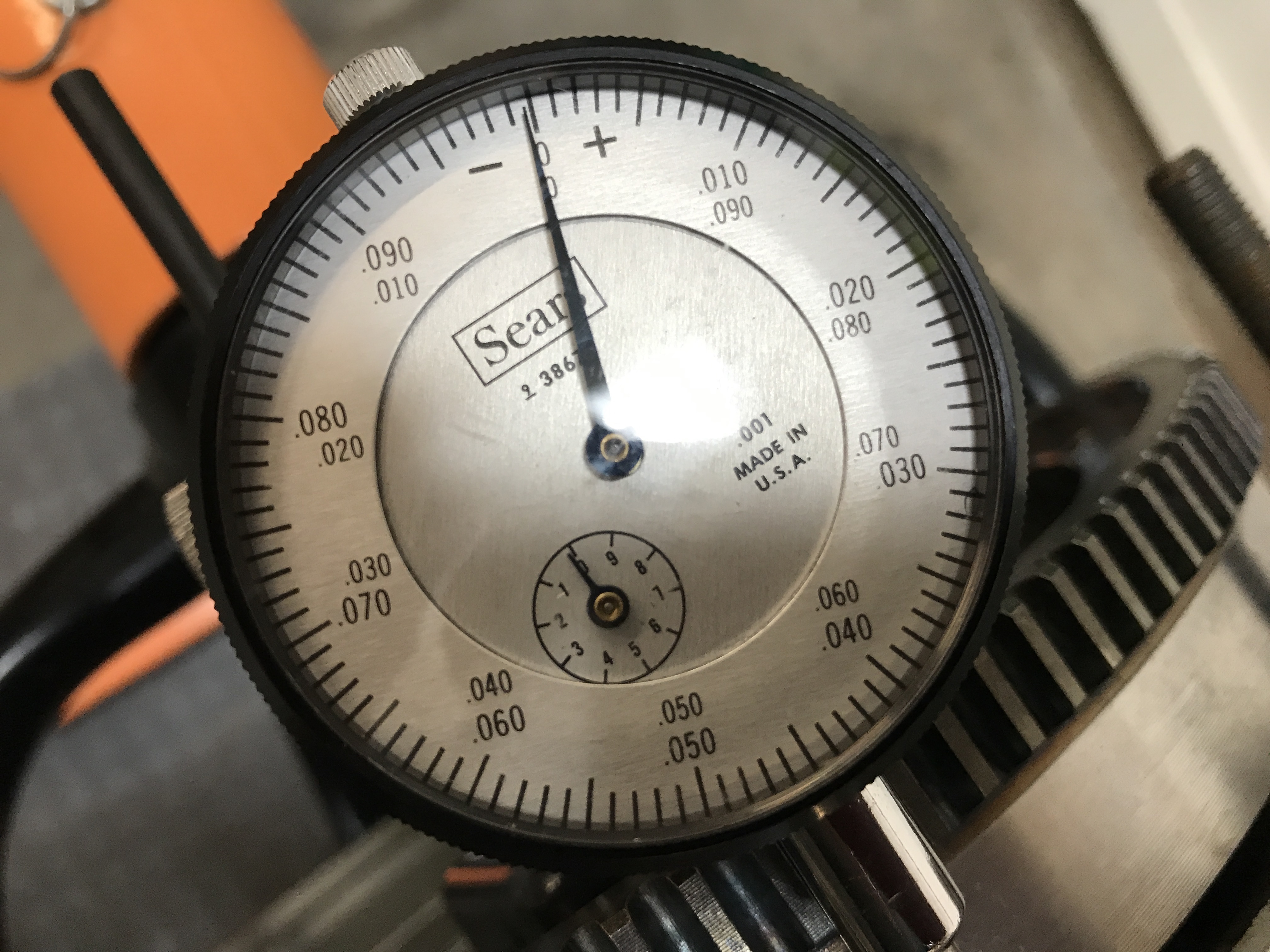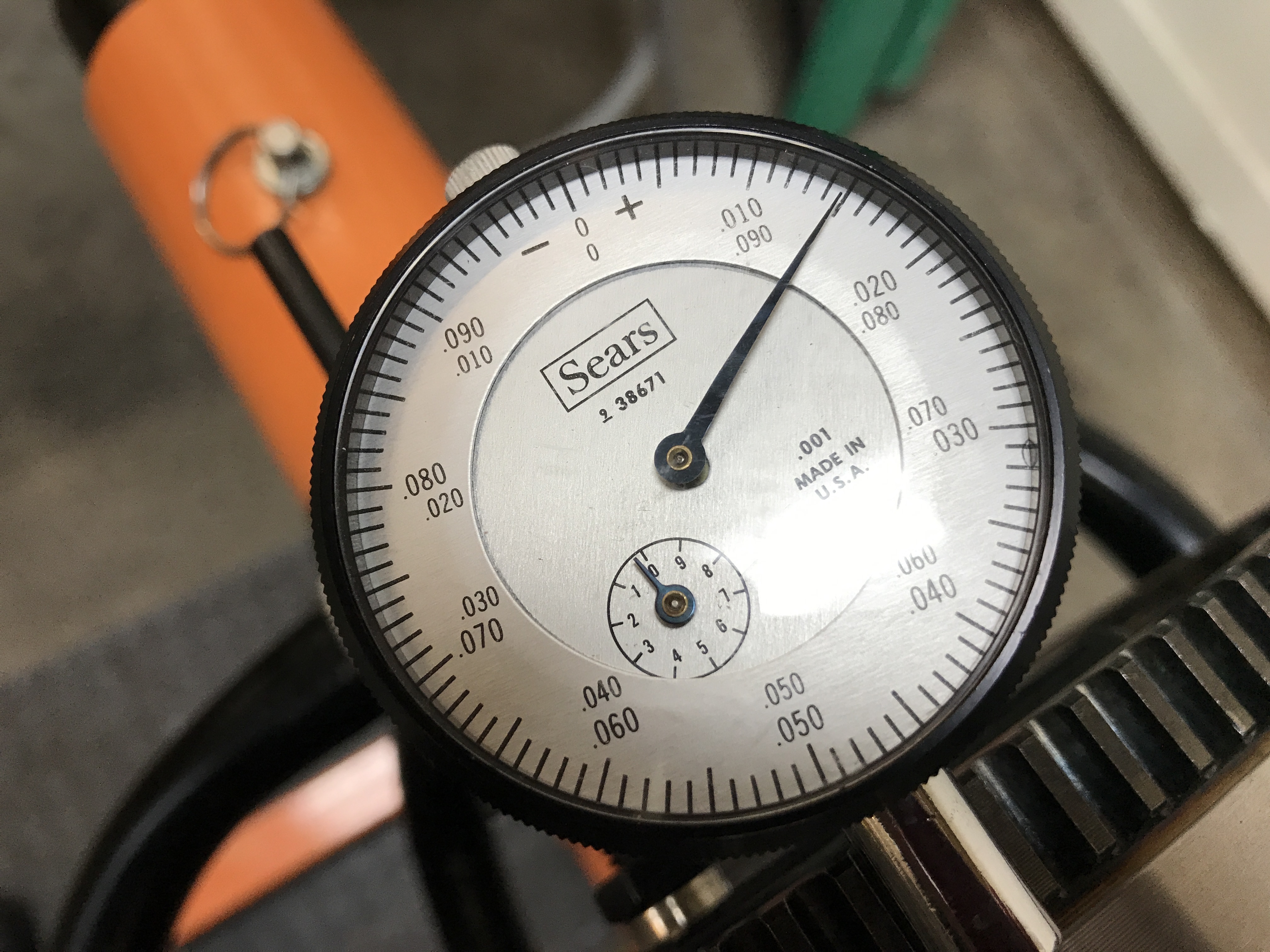 With the bolts tight, I made sure the crank had some axial play. Then I mounted my dial gauge and zeroed it.