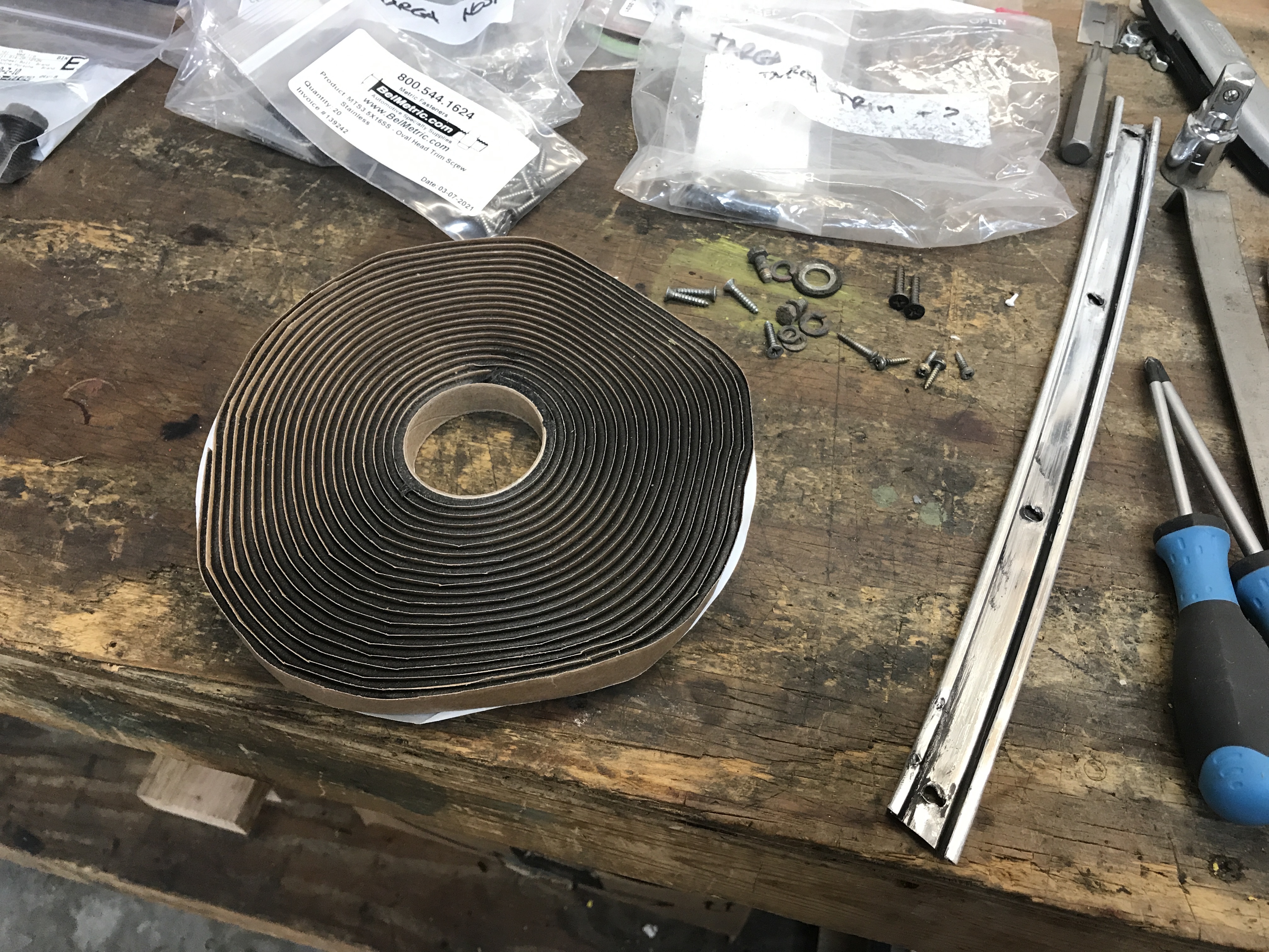 Here's the thin butyl strip material I found, 1/8 x 1/2", and one of the aluminum trim strips that goes on the leading edge of the targa sail.
