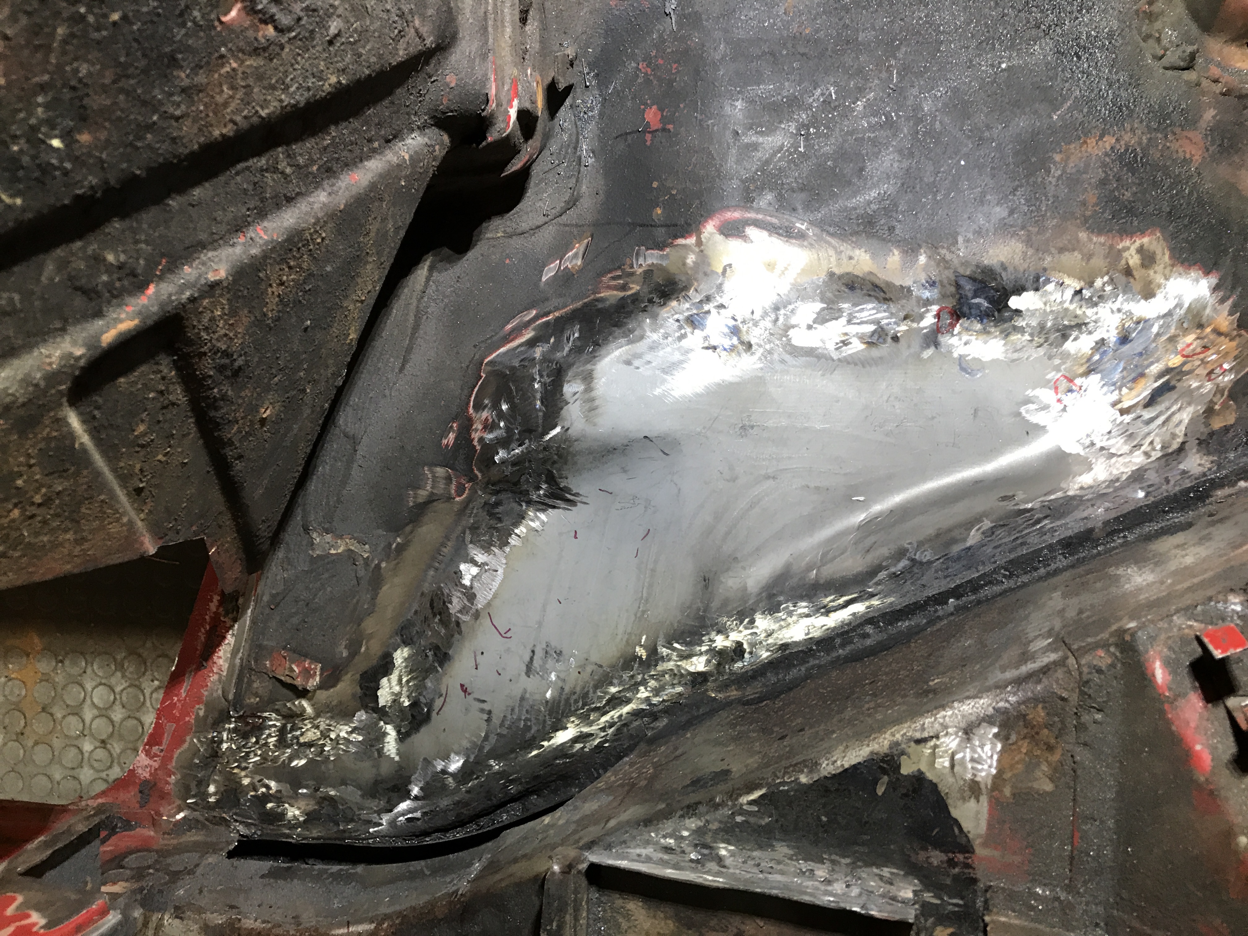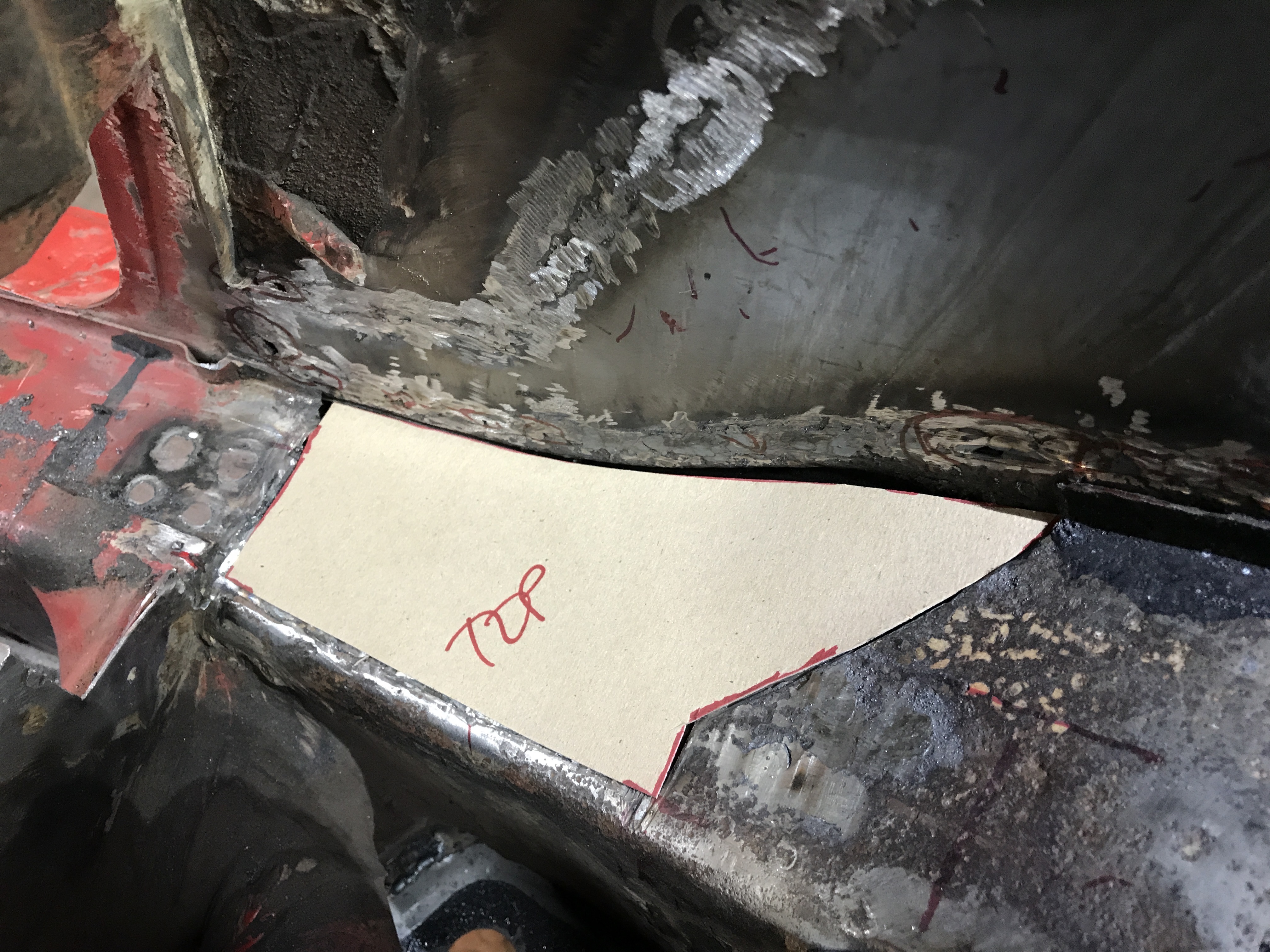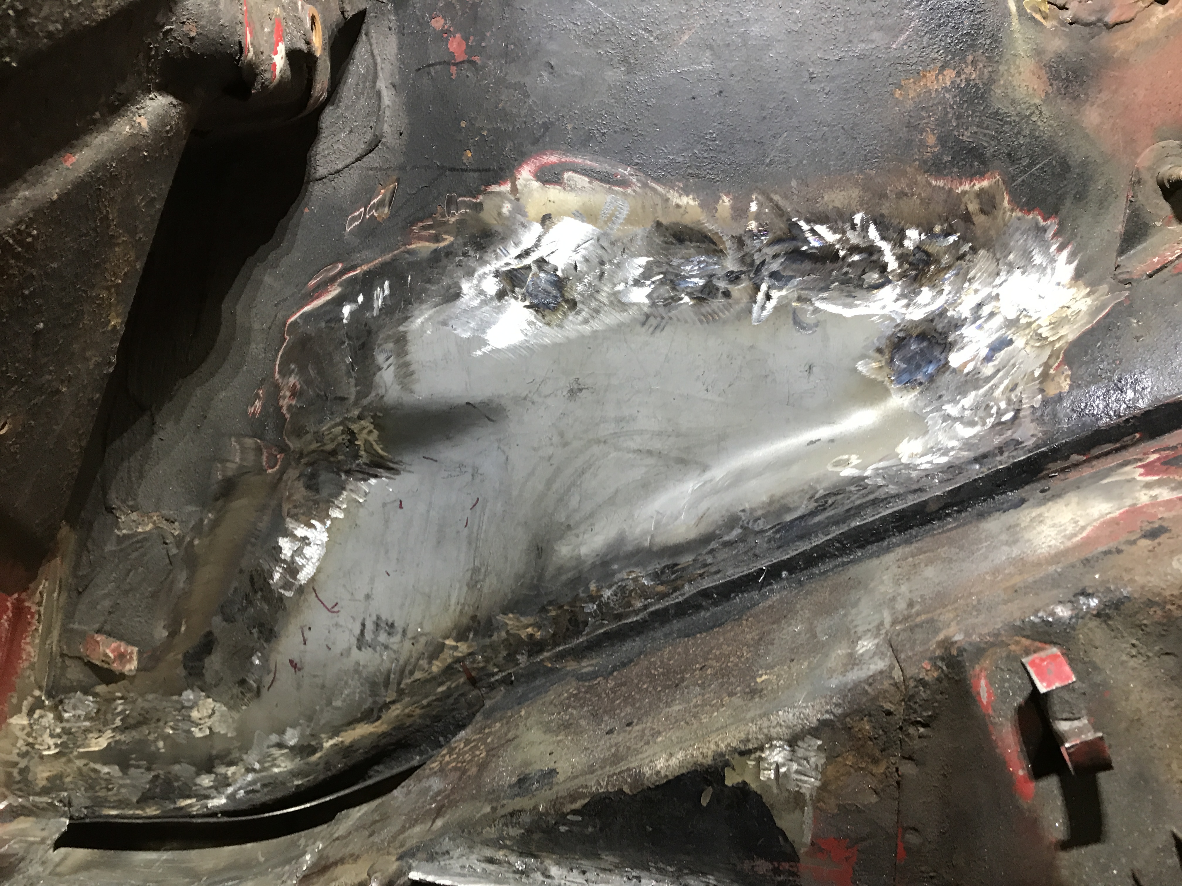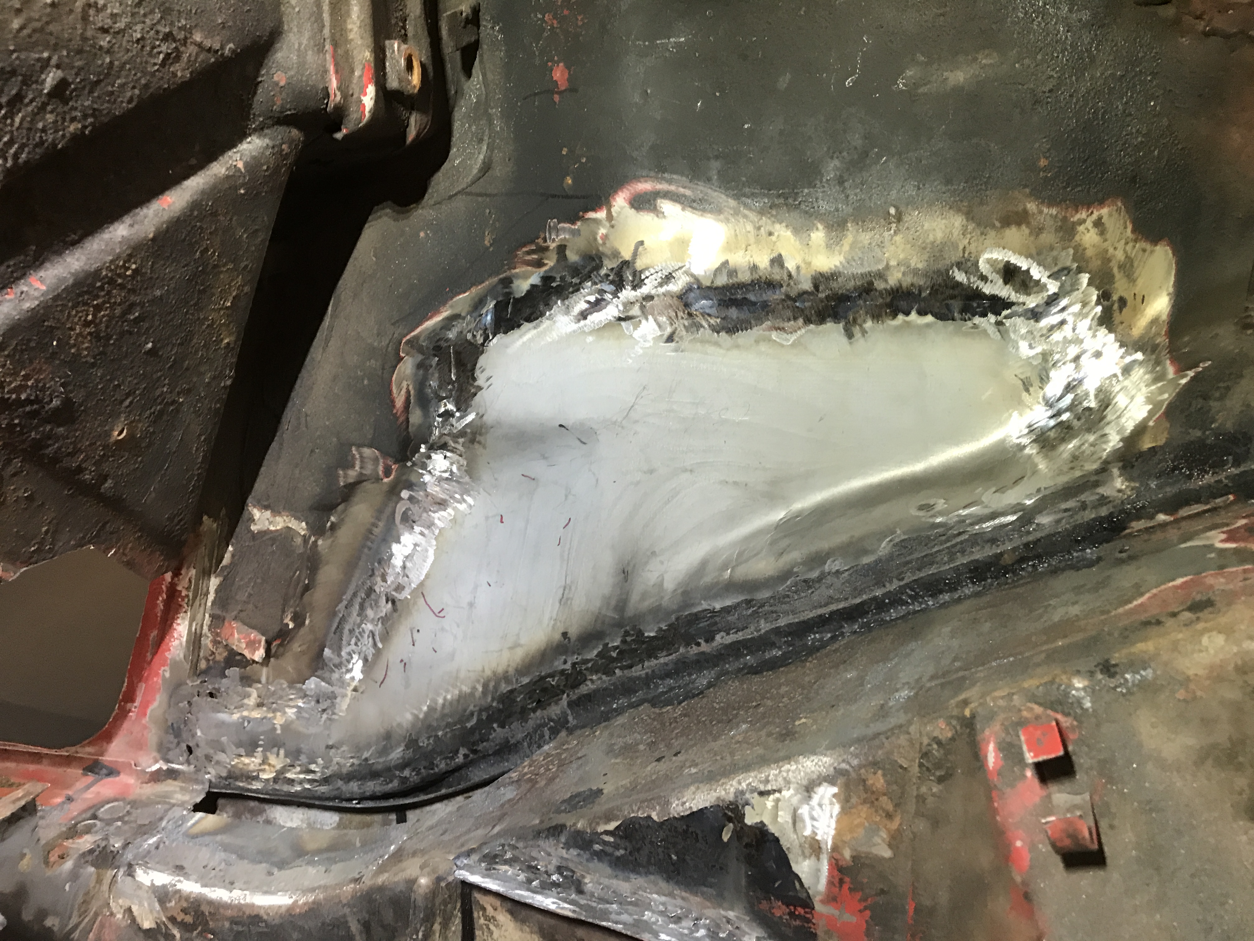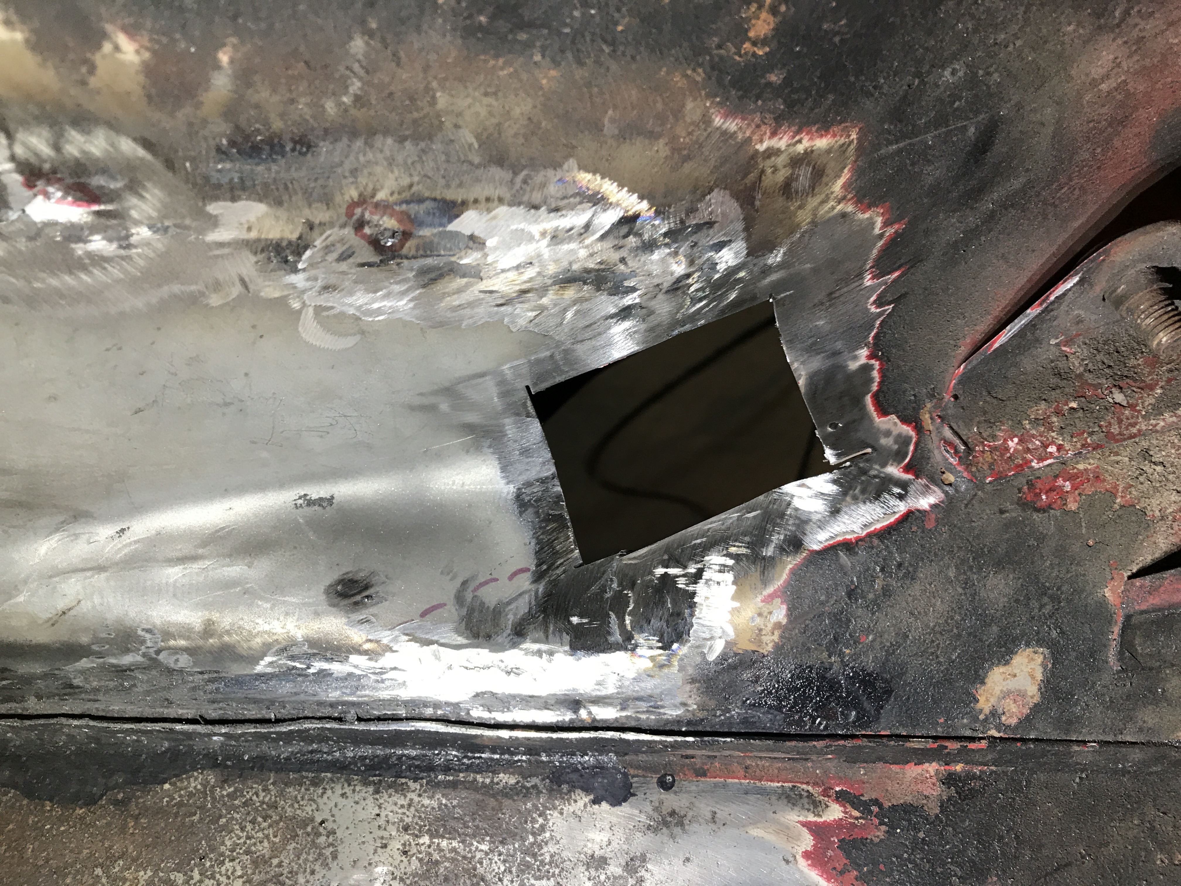 After grinding (3rd time) I had more holes and bad weld bits, especially in one spot. So I finally did the right thing (I hope) and cut out the worst section. The size and shape shows where I was chasing a growing hole, especially into the original sheet metal. Attached thumbnail(s) |