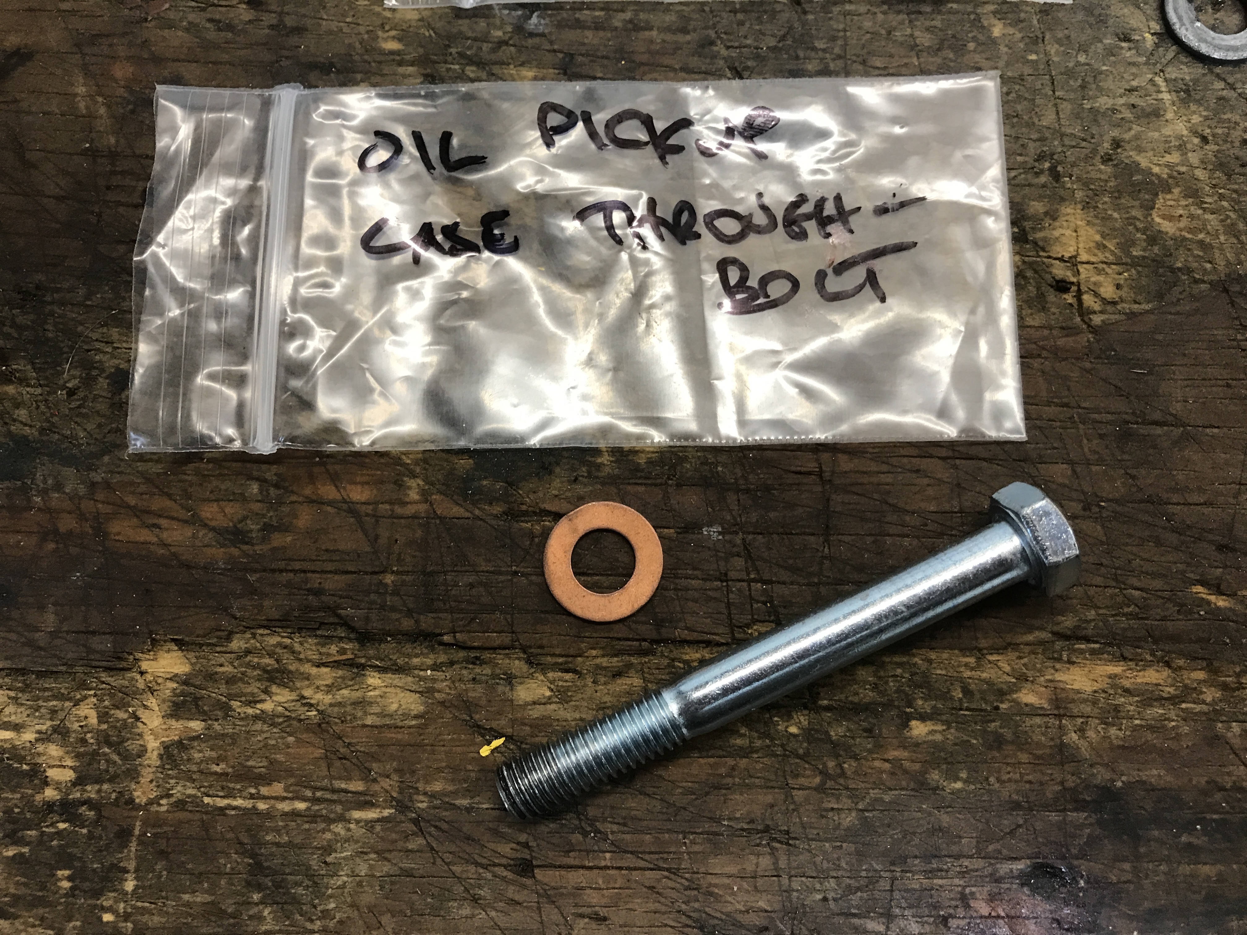 With a new case bolt for the oil pick-up and strainer retainer, I found the copper seal washer.