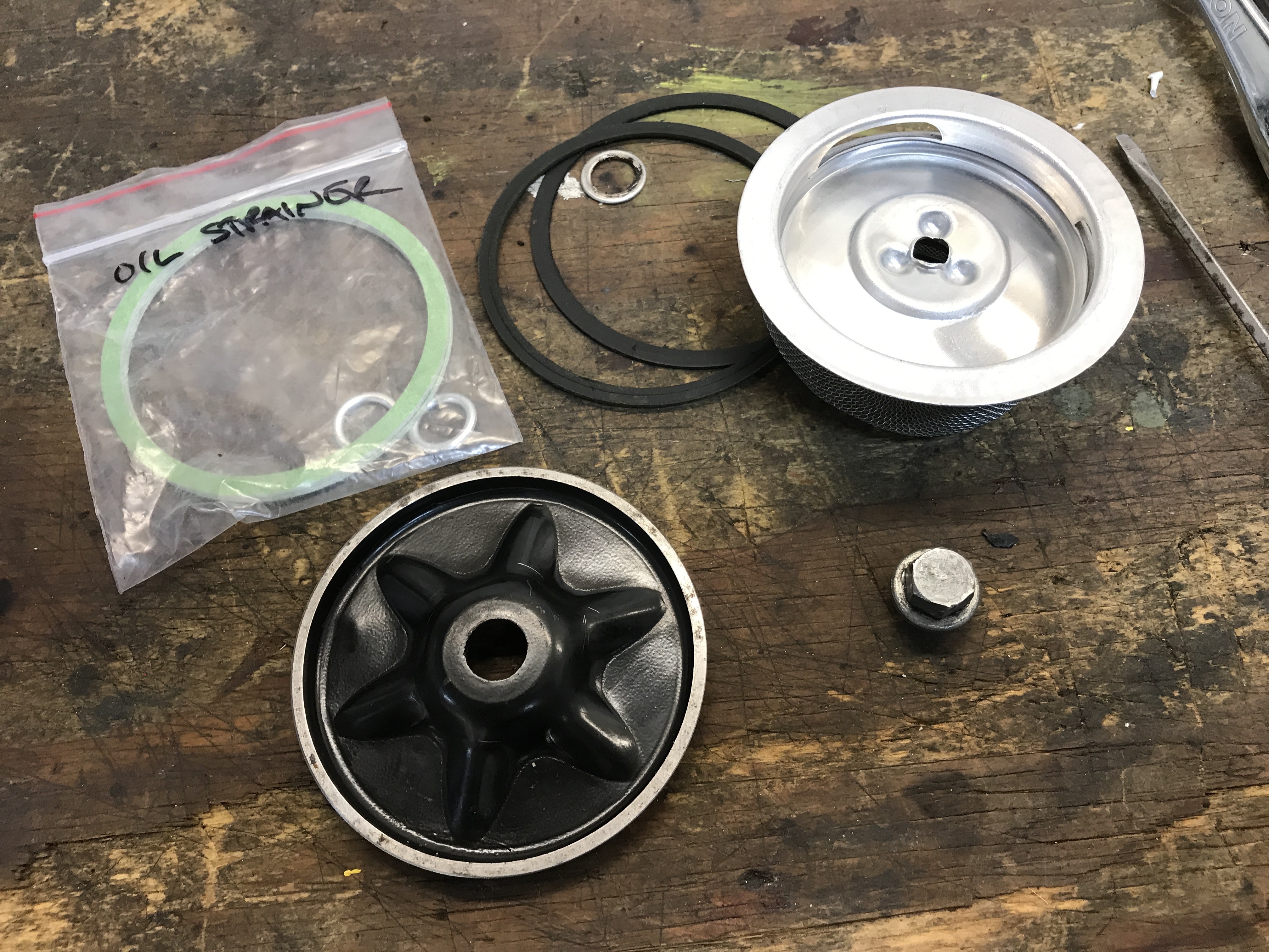Strainer cover, retaining nut, and drain plug, all with new crush washers.
