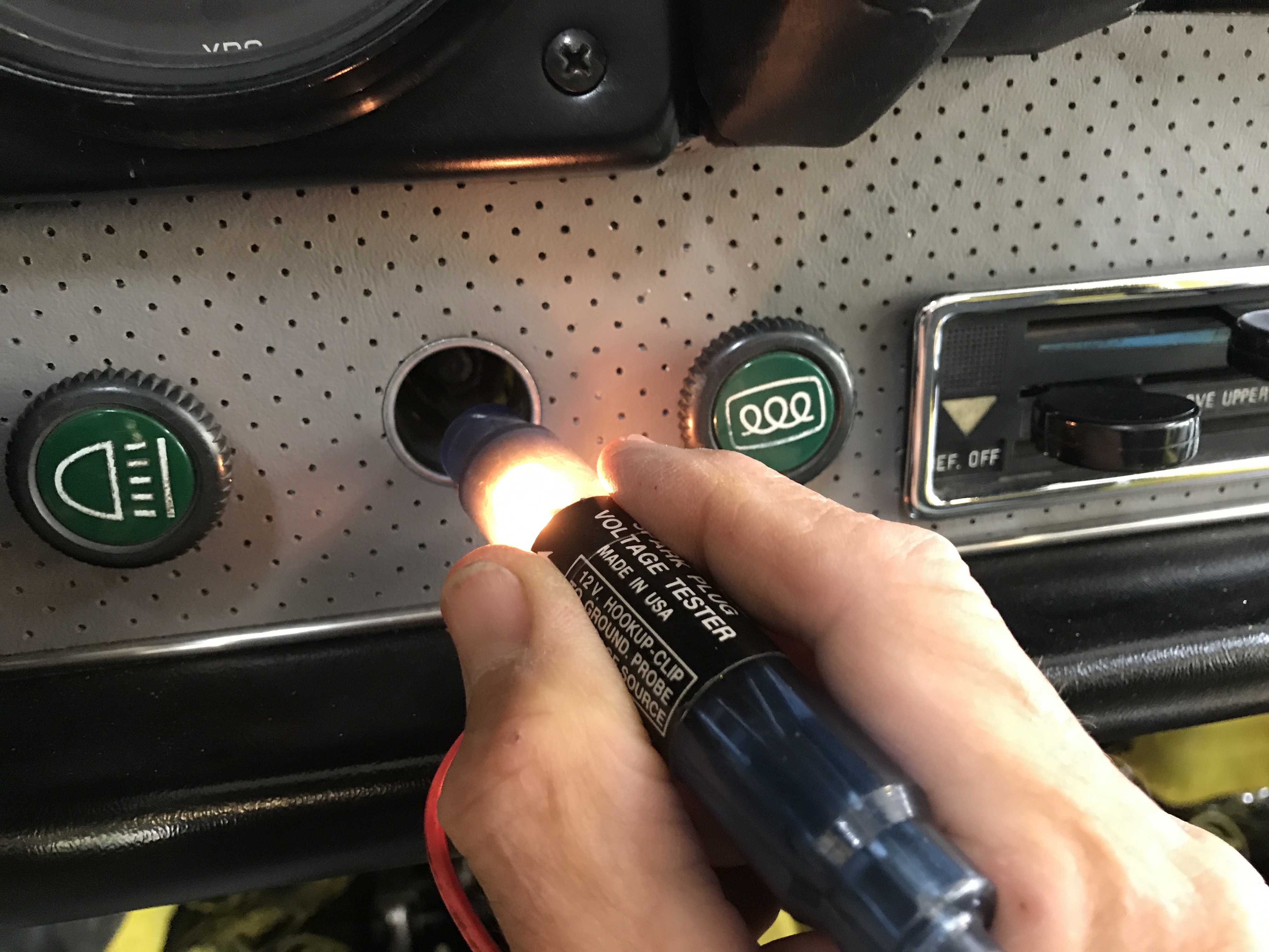 More electrical testing. I could not get any voltage from contact in the cig lighter, and so pulled it out.