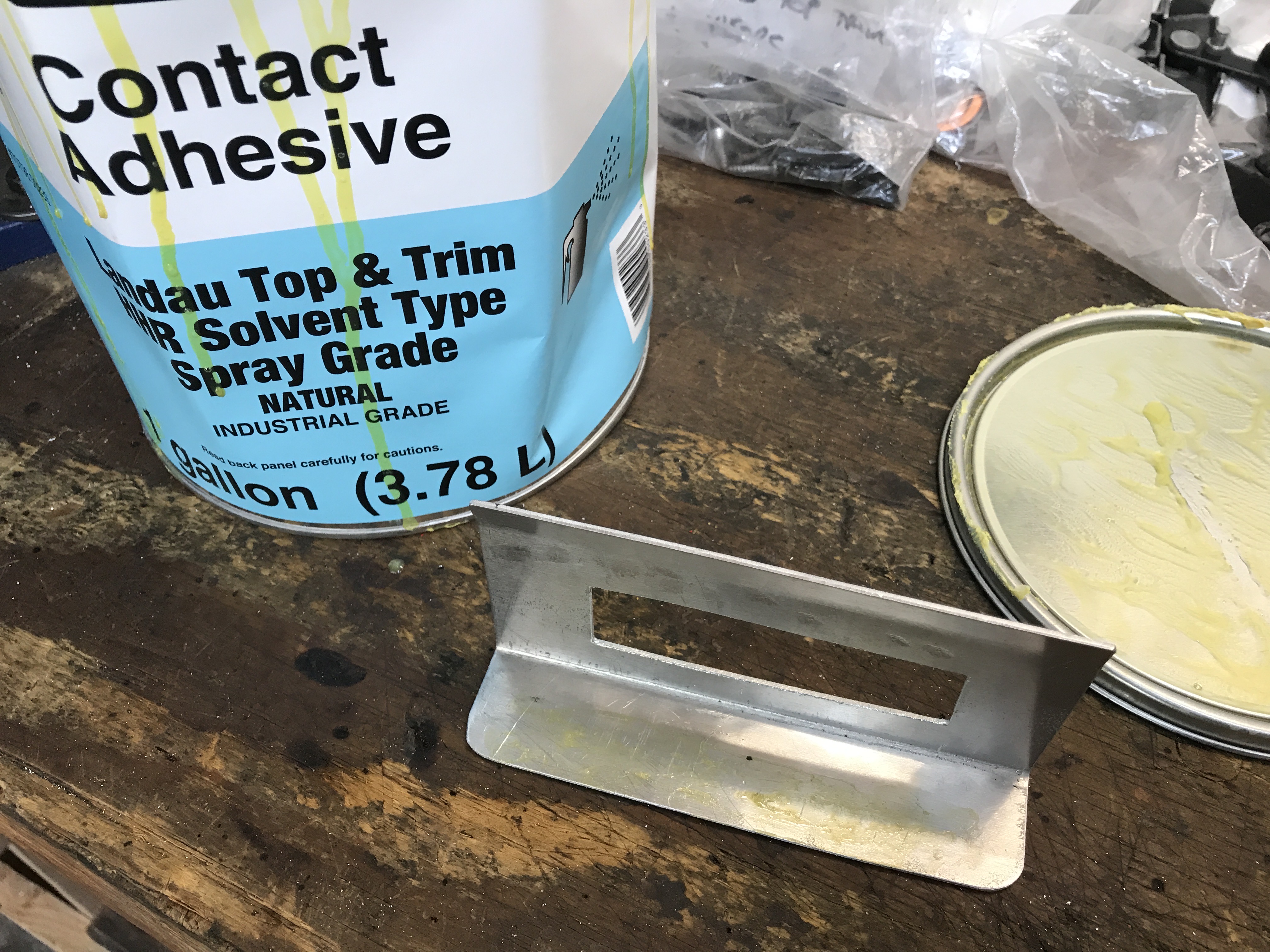 To get the two pieces to stick in the right position temporarily, I got out my gallon of contact cement.