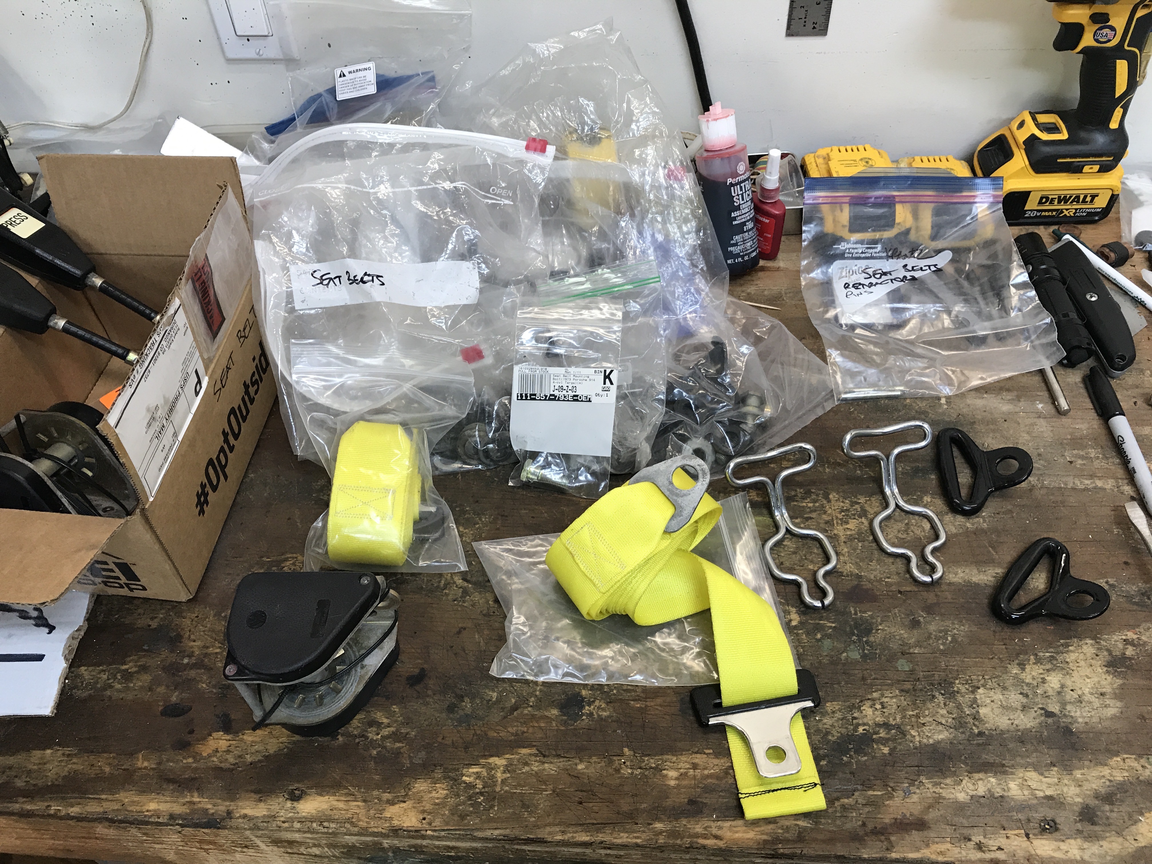 Next on the shelf was the box of seat belt parts. I had the original webbing replaced, and with a little color for the interior.