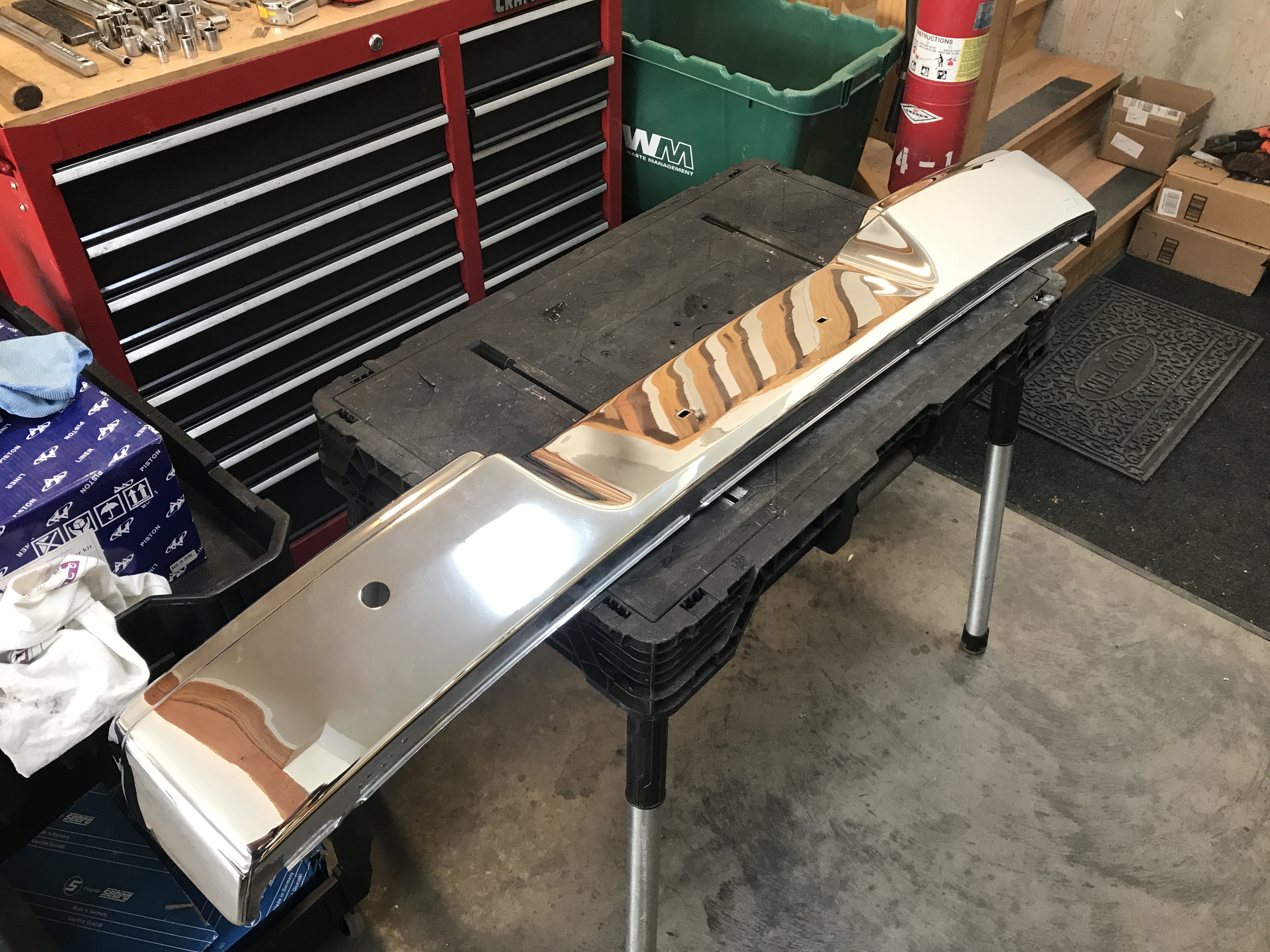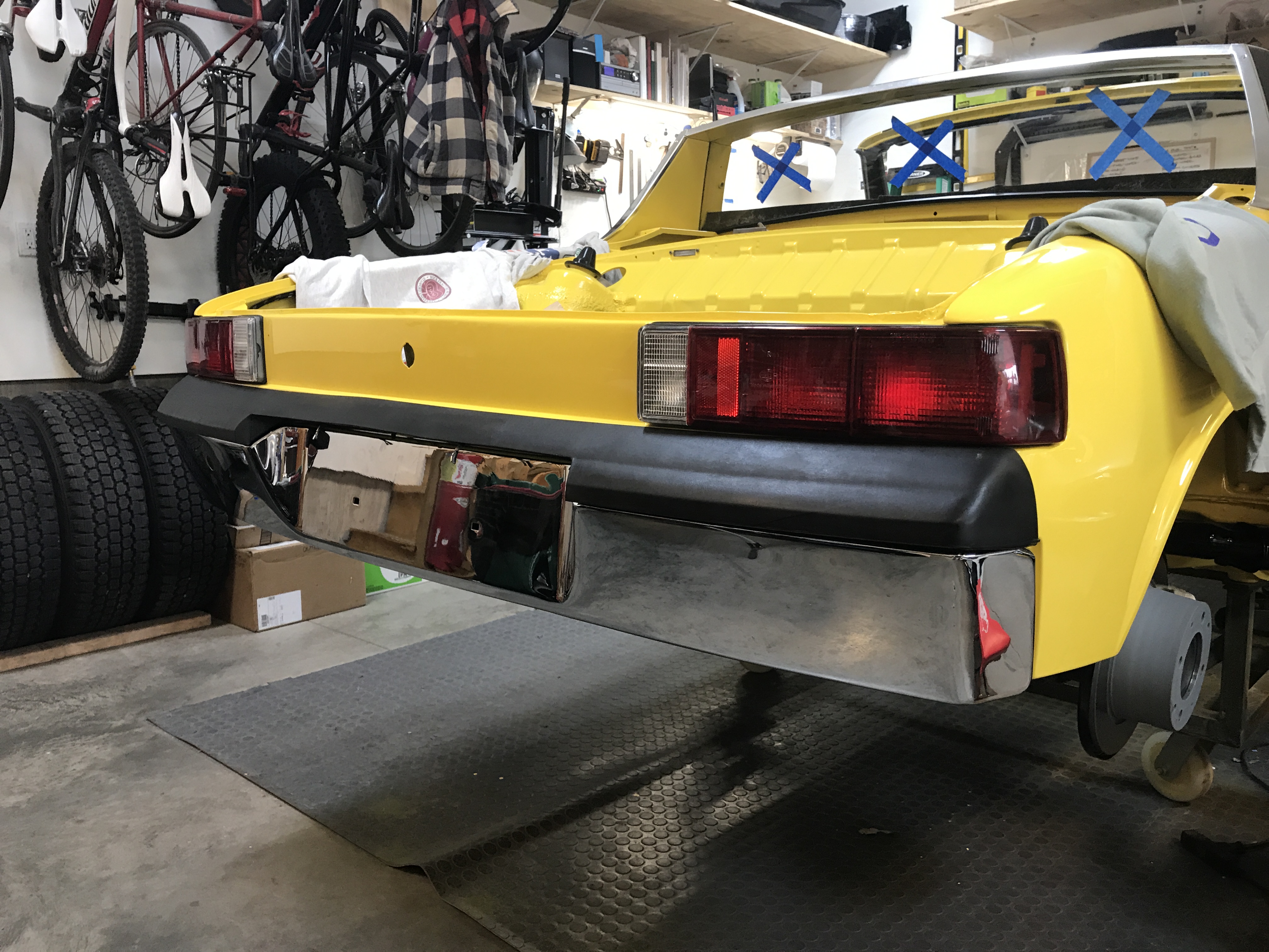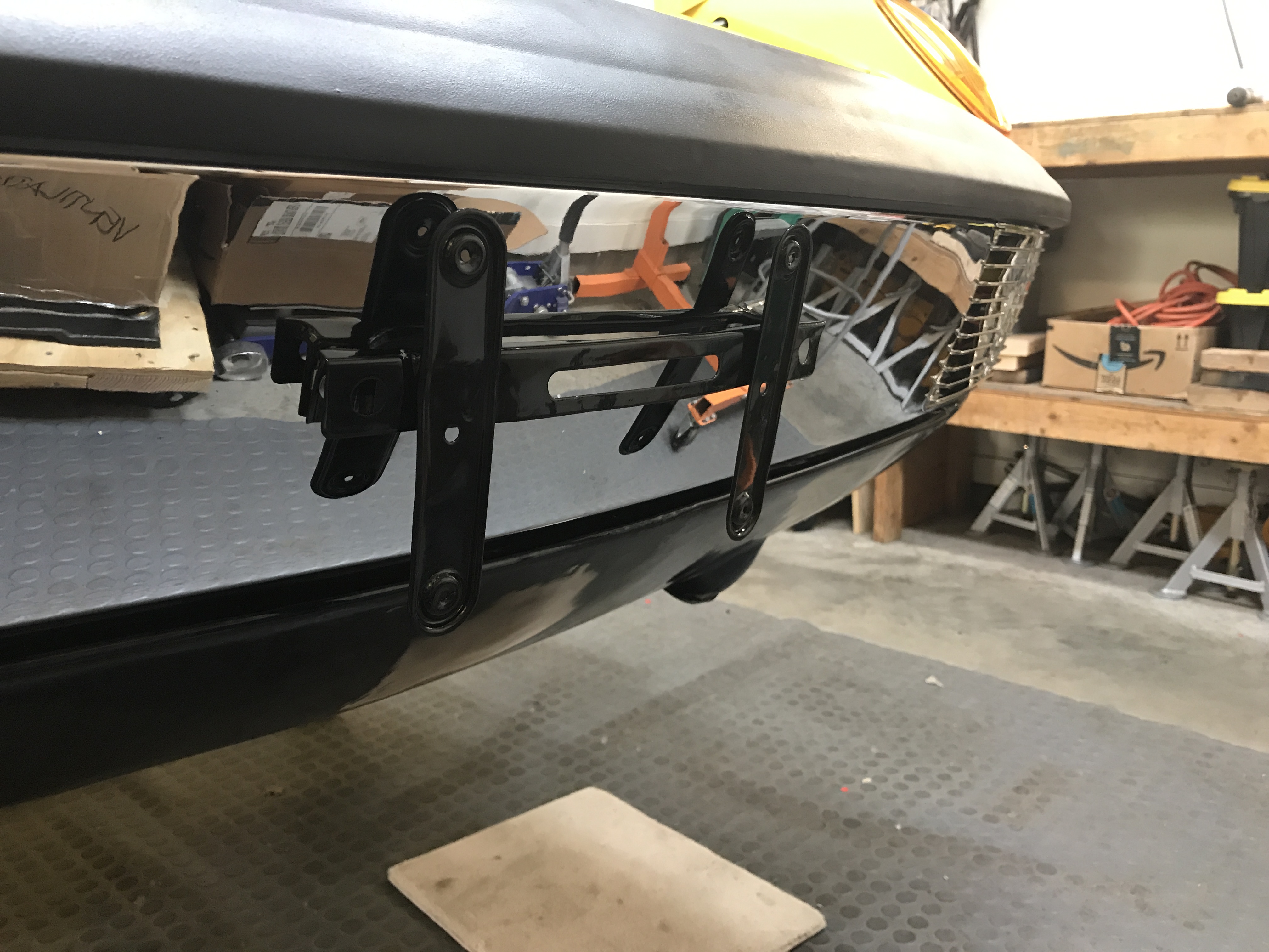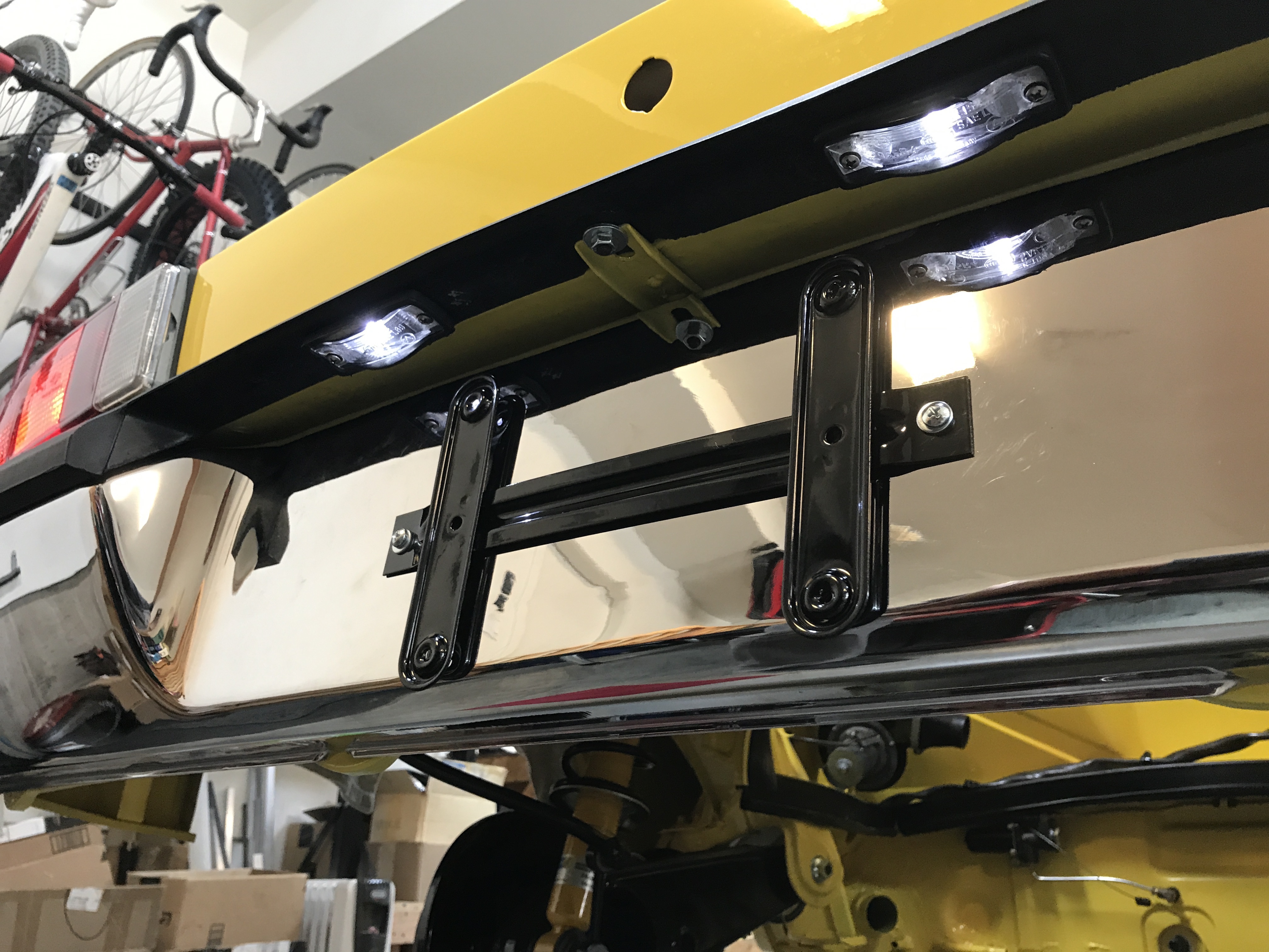 After I cleaned and treated the top, bolted it to the bumper with new spacer washers, I installed the bumper on the car. Now to deal with the license plate bracket and lights.
