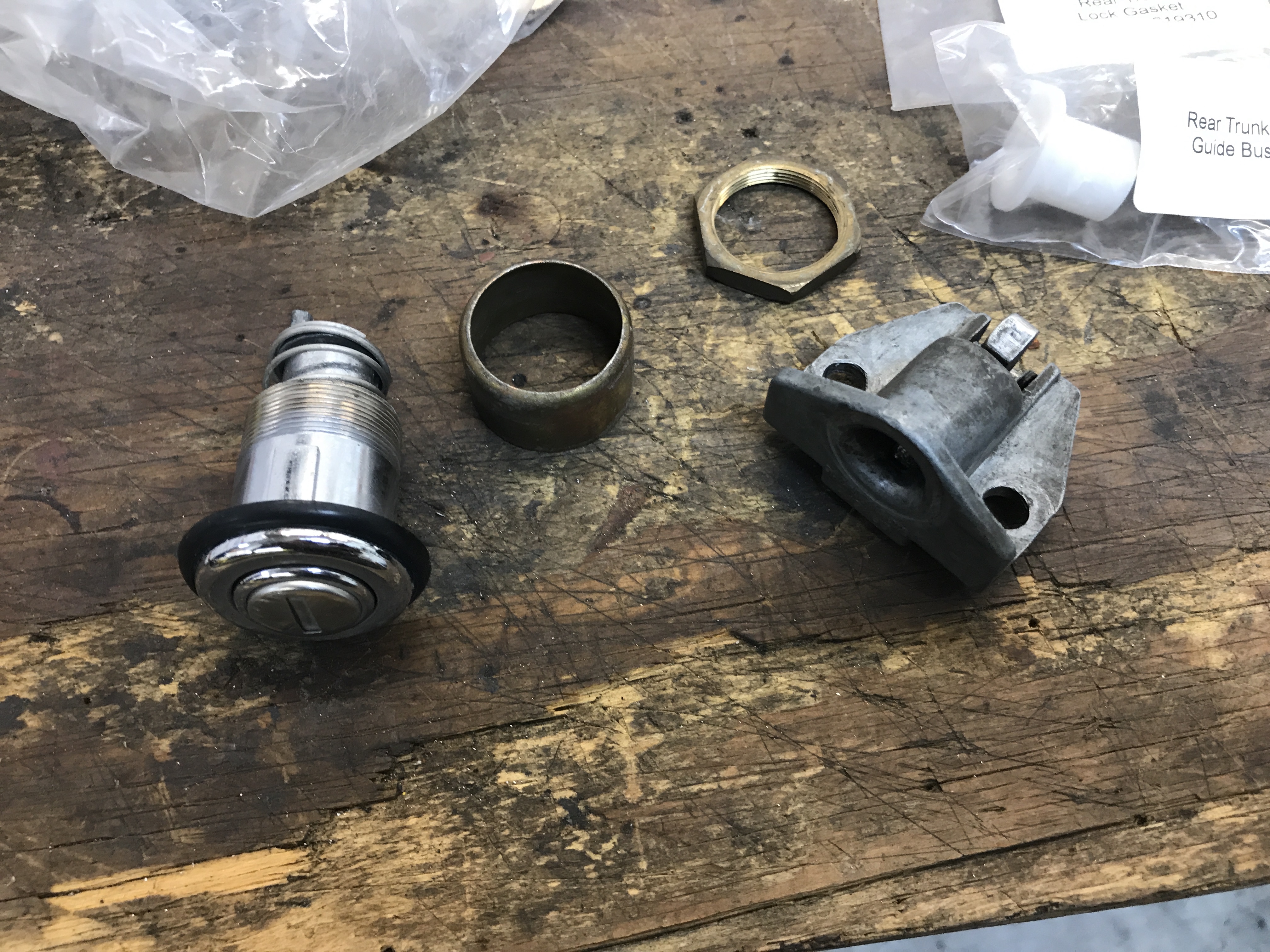 Another diversion today: I got out the trunk lock. This is a used replacement, since the car came with a non-functional electric lock release.